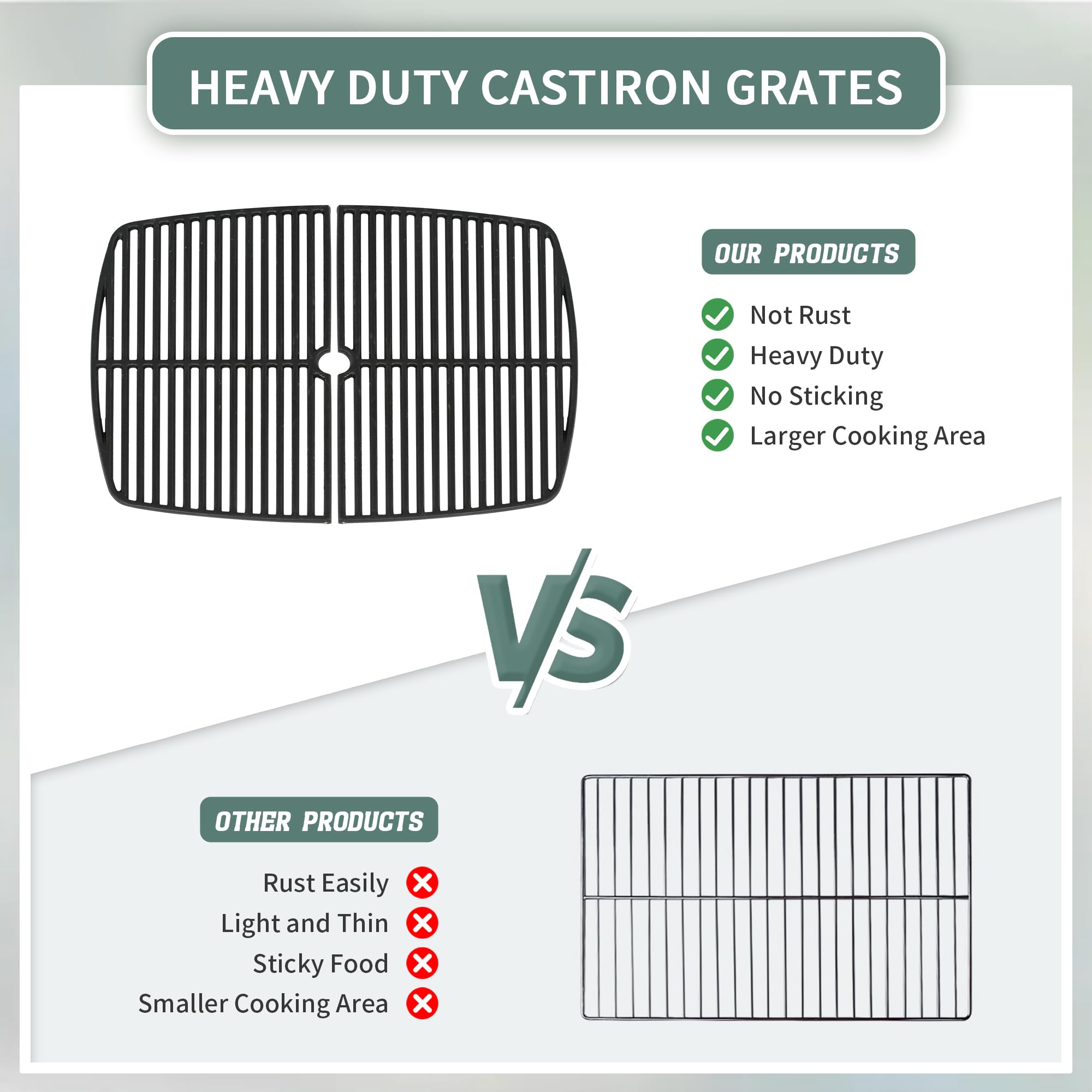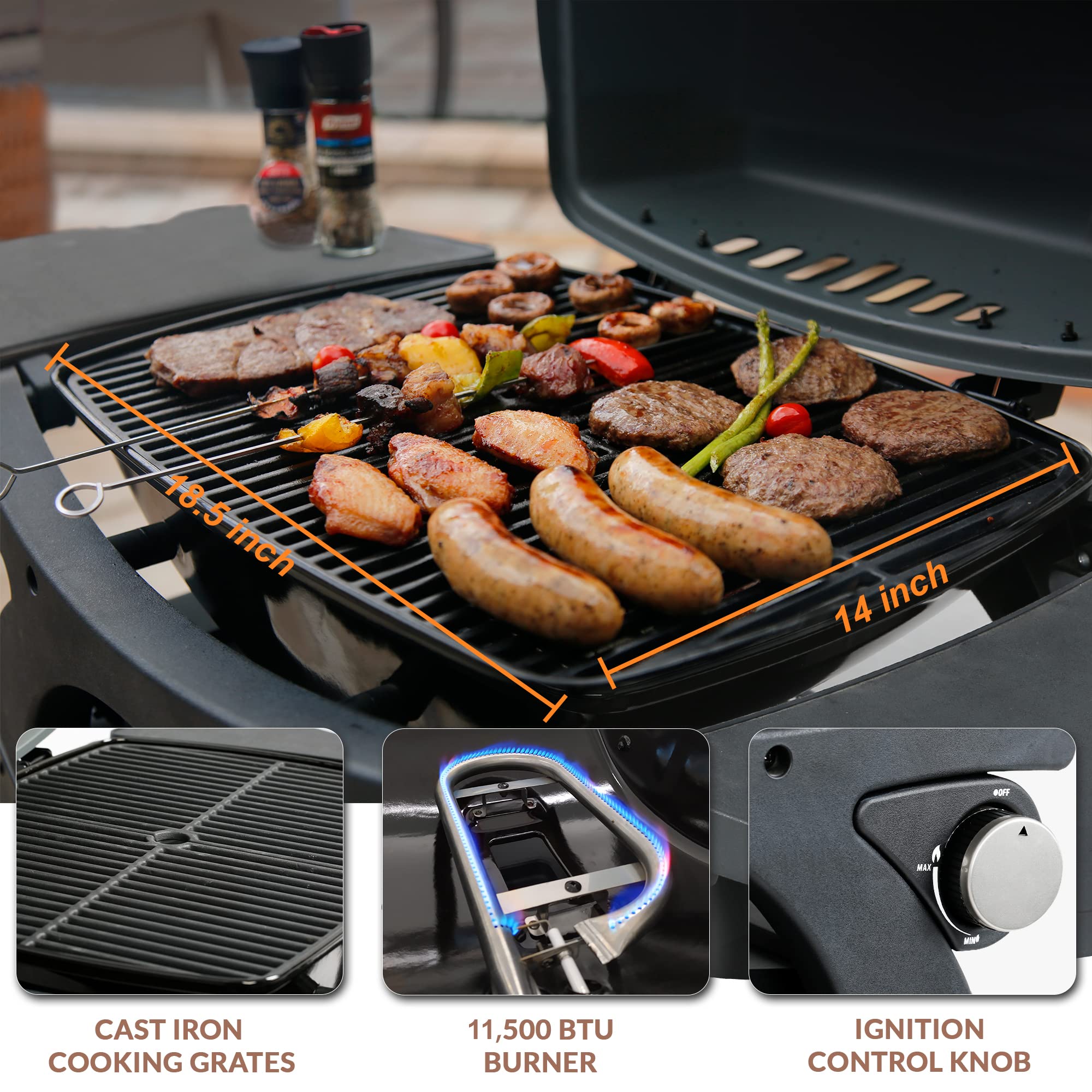 ❤COOKING SYSTEM - This propane gas grill Includes powerful U-shaped stainless steel burners, total output 11500 BTU, two cast iron grates are perfect to cook meats, seafood, or veggies on the 266 sq in cooking space, hose and regulator included
