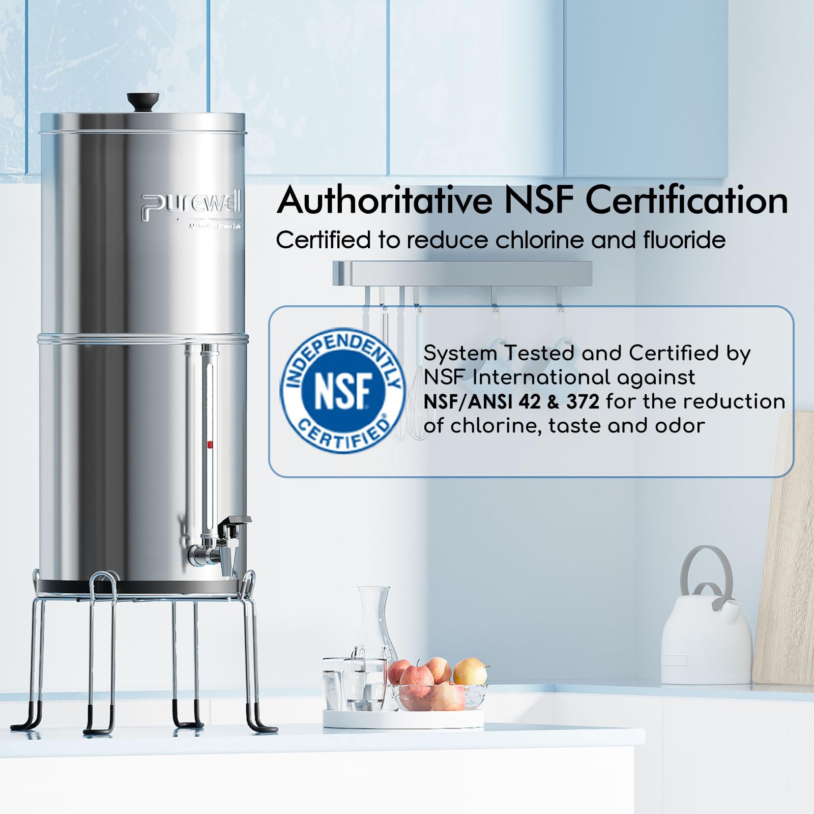 8-Stage Filtration - The Purewell gravity water filter system adopts a composite filter technology, can reduce most contaminants. The carbon filters (black) employs a 0.01μm hollow fiber UF membrane, a silver ion membrane and an activated carbon block to reduce rust, sediment, organic matter and heavy metals. The Fluoride filter (white) uses a Fluoride reduction membrane, an activated carbon block, and three sediment PP membranes to intercept fluoride and chlorine, etc.