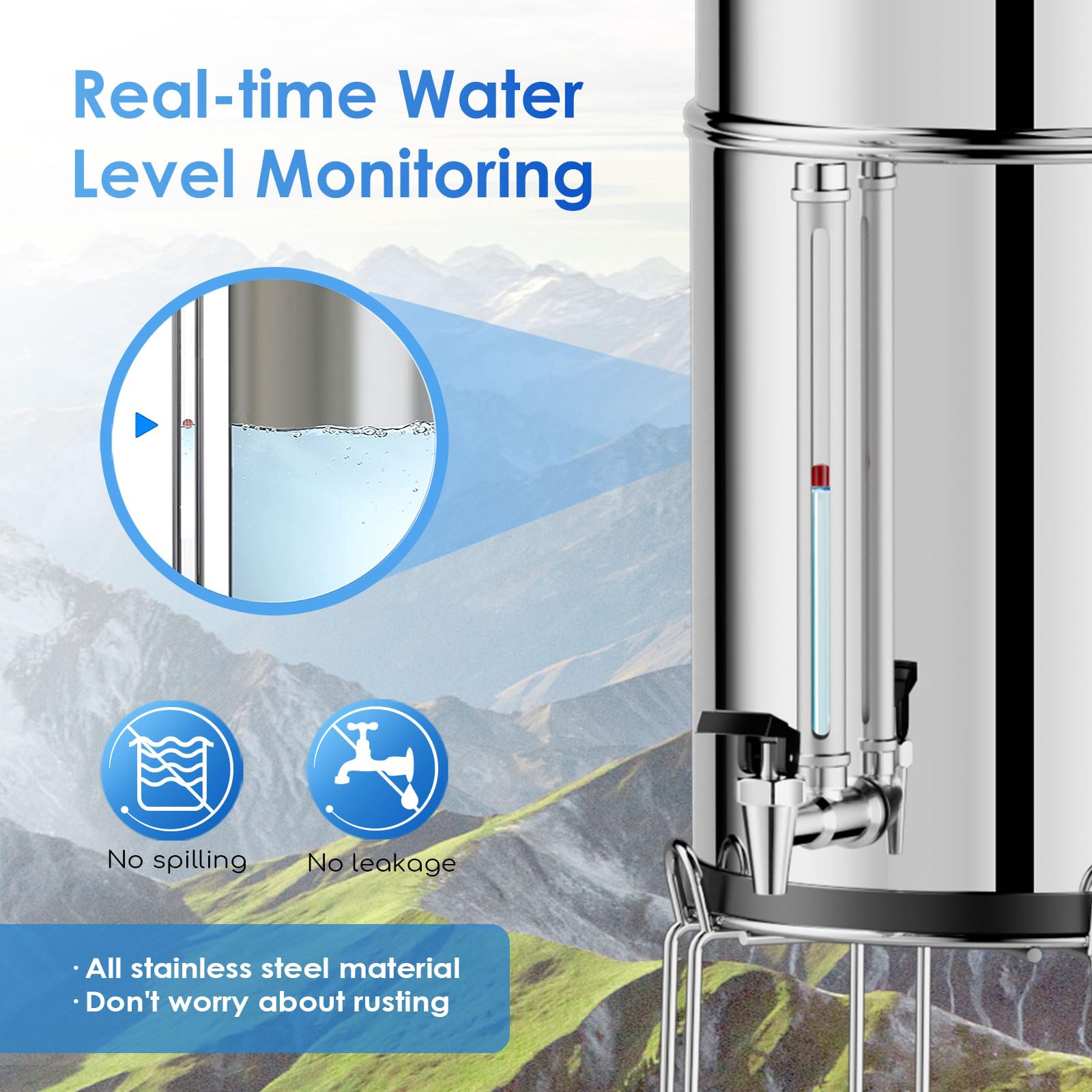 Complete Accessory Set: The system not only provides safe water but also adds a touch of style to your home with its 304 food-grade stainless-steel housing. This ensures a sturdy and long-lasting structure. The metallic water level spigot that comes with the system fits the chamber perfectly, preventing any leaks. Additionally, a non-slip stand is included to enhance the user experience. These accessories are included in the package, you don't have to spend extra money on additional accessories.