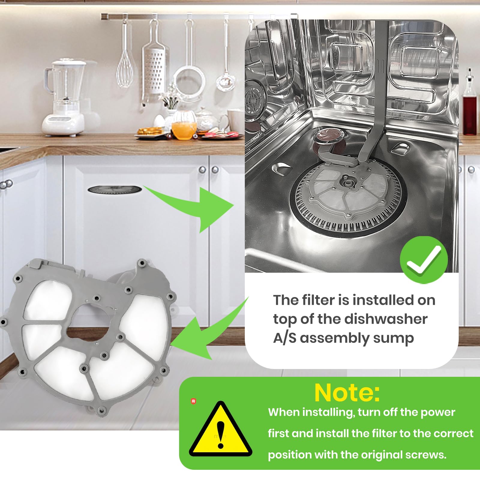 4. Installation Method: When installing the filter mesh, ensure that the dishwasher power is turned off and carefully follow the installation instructions provided in the product manual. Typically, the filter mesh is installed securely above the A/S Assy-Sump Dishwasher Pump and Motor.