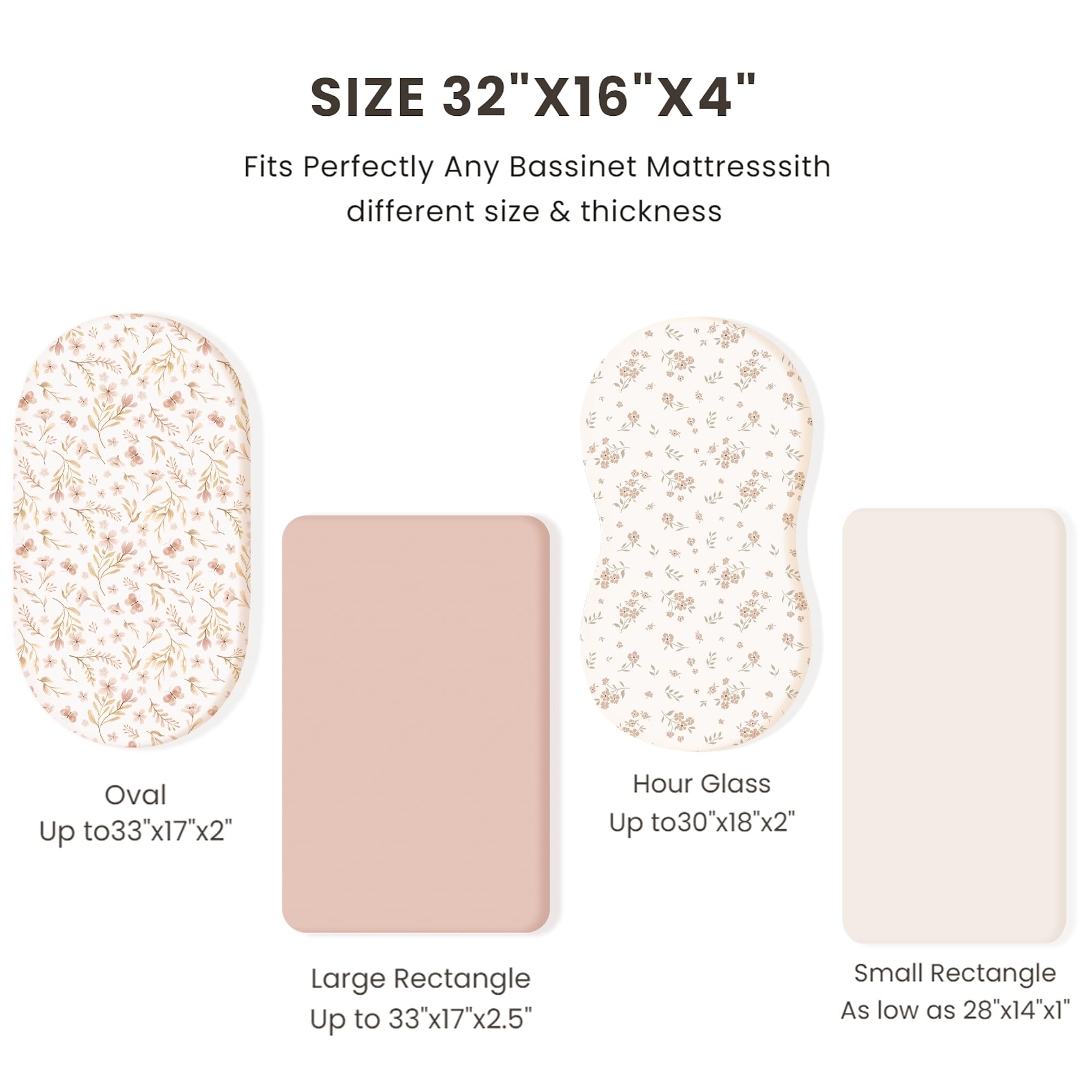 Universal Fit for Most Bassinet Mattresses: These bassinet mattress sheets (32" x 16") fit most bassinet mattresses, including oval, round, rectangle, and hourglass shapes. The elasticized edges provide a snug, secure fit for added safety
