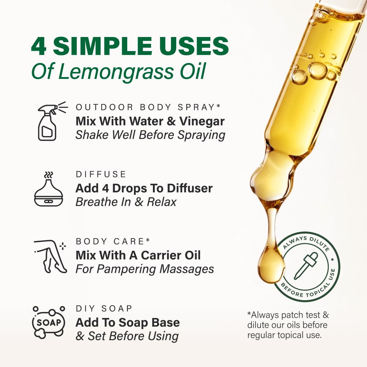 Lemongrass essential oil for skin care. Mix essential oils lemongrass with carrier oils or moisturizers for a fragrant and nourishing addition to your beauty regimes. Gently pat onto cleansed skin and enjoy dewy-looking skin.