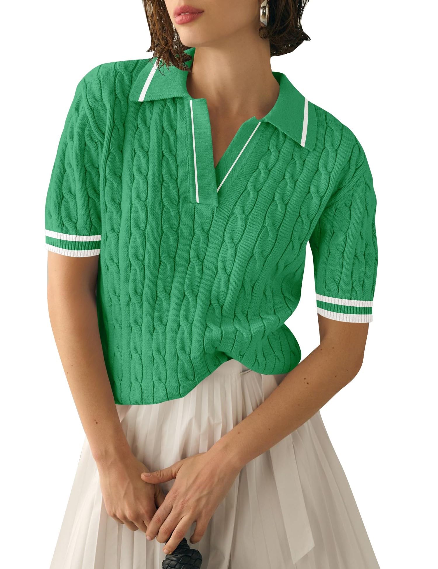 Features: Women's Cable Shirt, Short Sleeves, Slim V Neck, Small Lapels, Elasticized Ribbed Cuffs and Hem, Knit, Basic Solid Color, Loose Fit, Casual Style. Comfortable women's soft summer top.