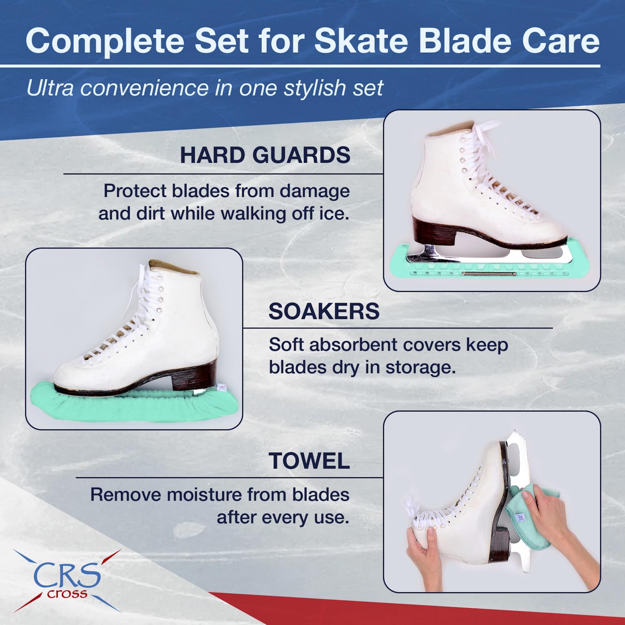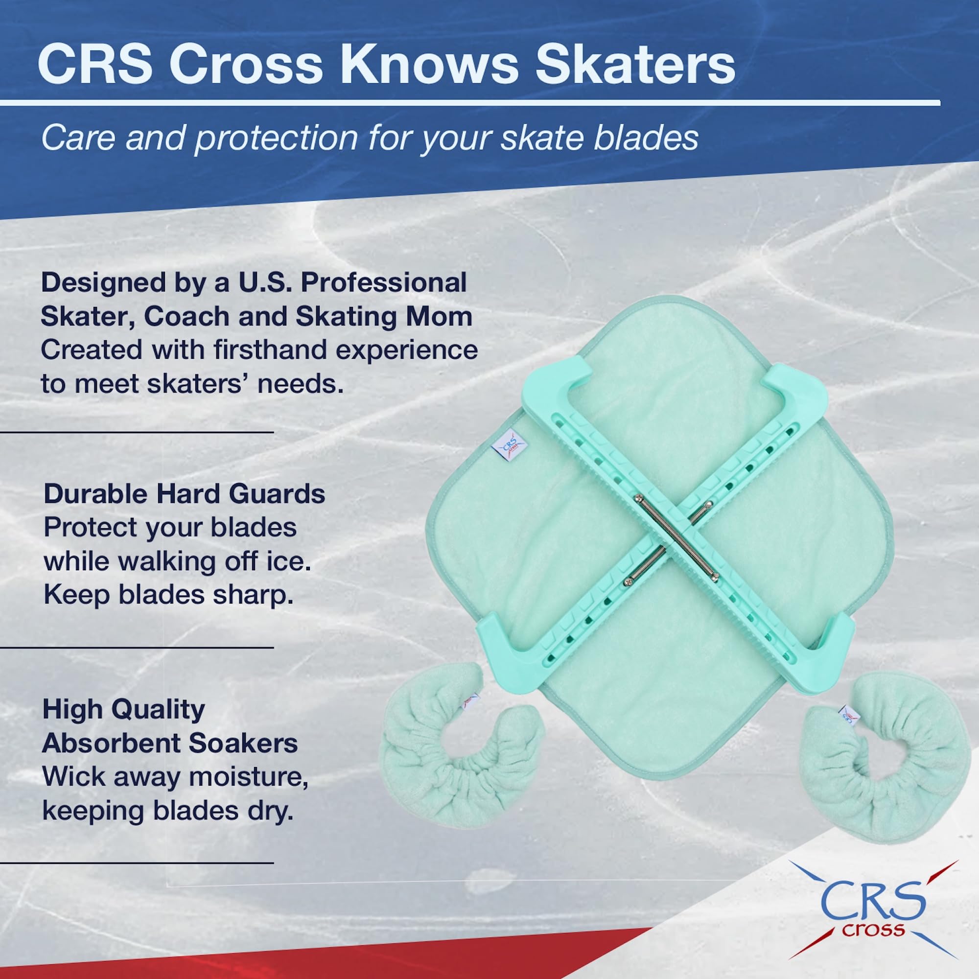 CRS Cross Skate Guards, Soakers and Towel Set and all other CRS Cross products are designed by a former professional skater, coach and skating mom.