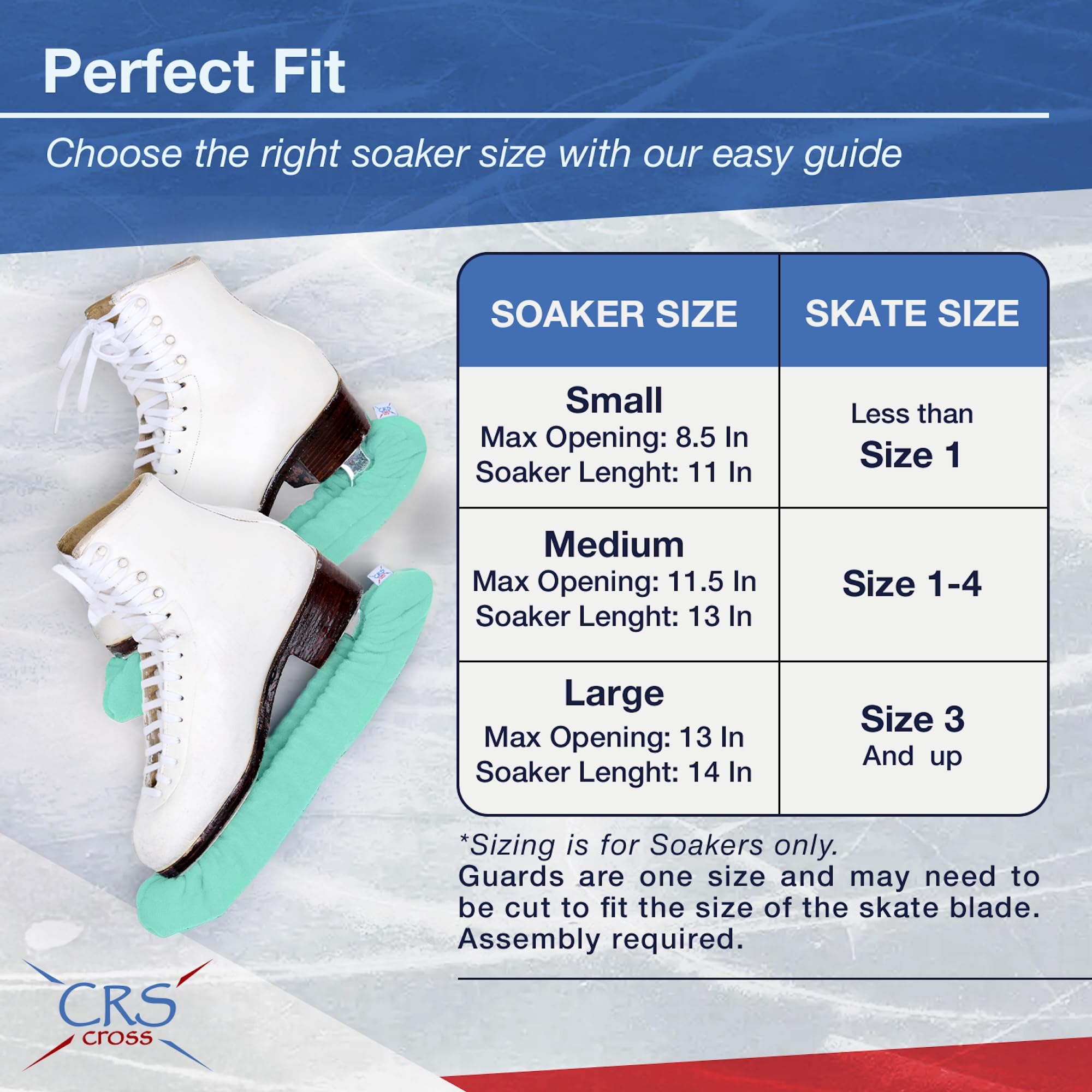 CRS Cross Soakers (also referred to as Soft Guards or Blade Covers) are made from absorbent microfiber to protect and cover ice skate blades. Your skate blades should never be stored in hard guards. Blades should be dried thoroughly the towel and stored in CRS Cross soakers. Three sizes are available based Small, Medium or Large (see size chart according to boot size). Small fits Junior/Youth boot size 1 or smaller, Medium fits adult sizes 1-4, Large fits adult sizes 4+.