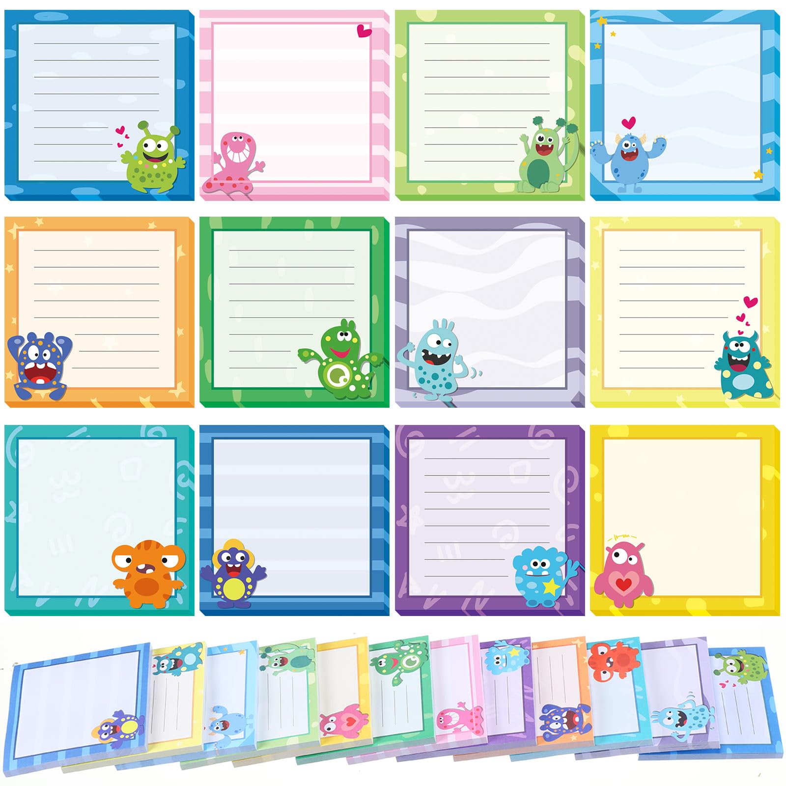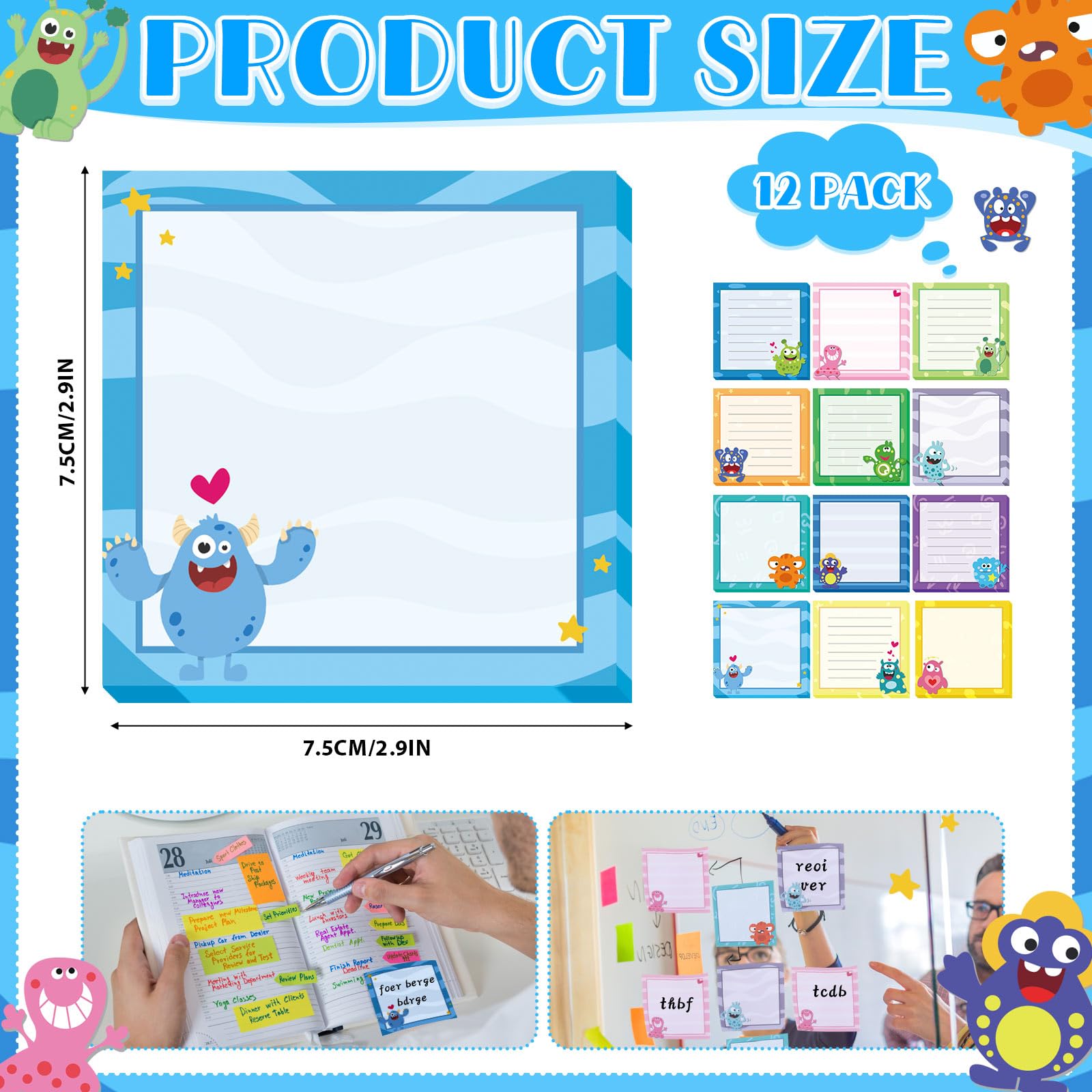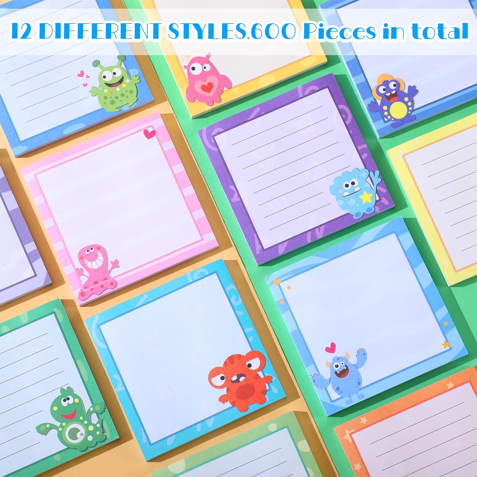 Rich in Quantity: this package provides you with 12 packs of to do list sticky notes of different monster styles, each pack has 50 sheets, a total of 600 sheets, sufficient quantity and diverse styles can meet your use and share needs; Each sheet measures 7.5 x 7.5 cm/ 2.9 x 2.9 inches, suitable for writing messages, memos, notes and more
