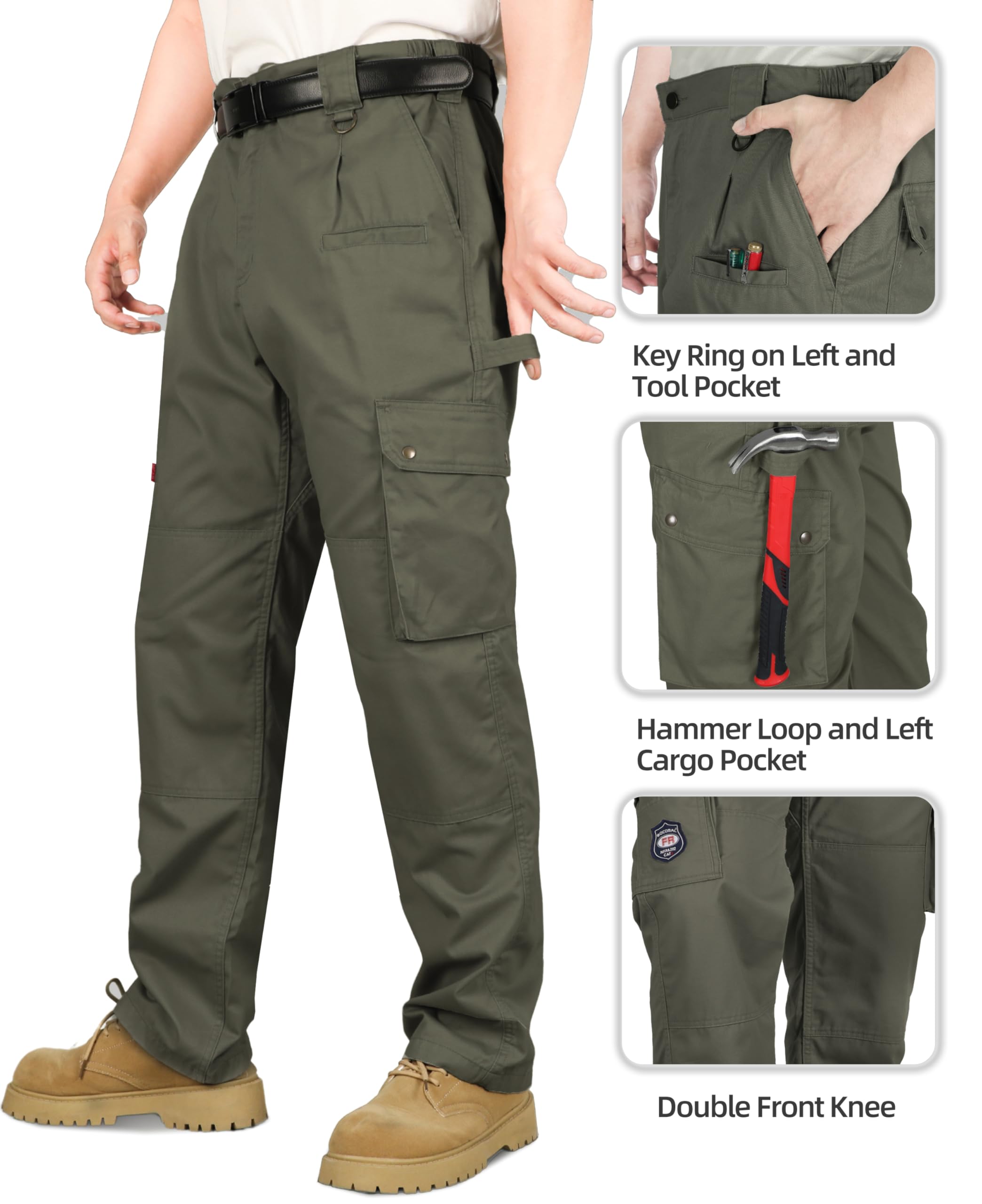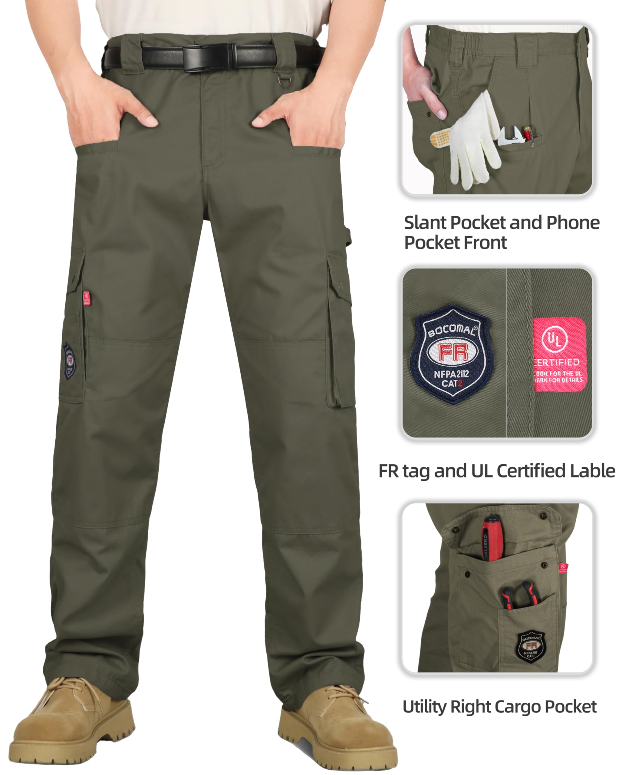This FR Work Pant has 9 Pockets And Elstic waist band, Provides A Perfect And Comfortable Relaxed Fit. Also Soft And fashionable.We Did Prewash/ Preshrunk And Wrinkle-Free.Machine Wash No Shrink! Double needle stitching on outseam. Left and right cargo pockets at the thighs with flaps to keep items secure.