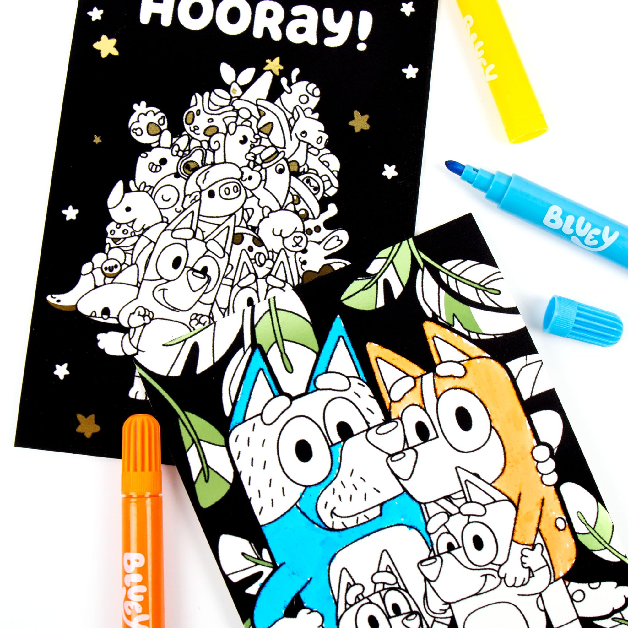 3 WAYS TO COLOR: Explore fuzzy textures and patterns with markers to color 2 Velv-Its posters that make coloring outside the lines a thing of the past! Scratch & reveal a wonderful world of color with Bluey scratch art, or stamp, color, and customize a coloring paper roll!