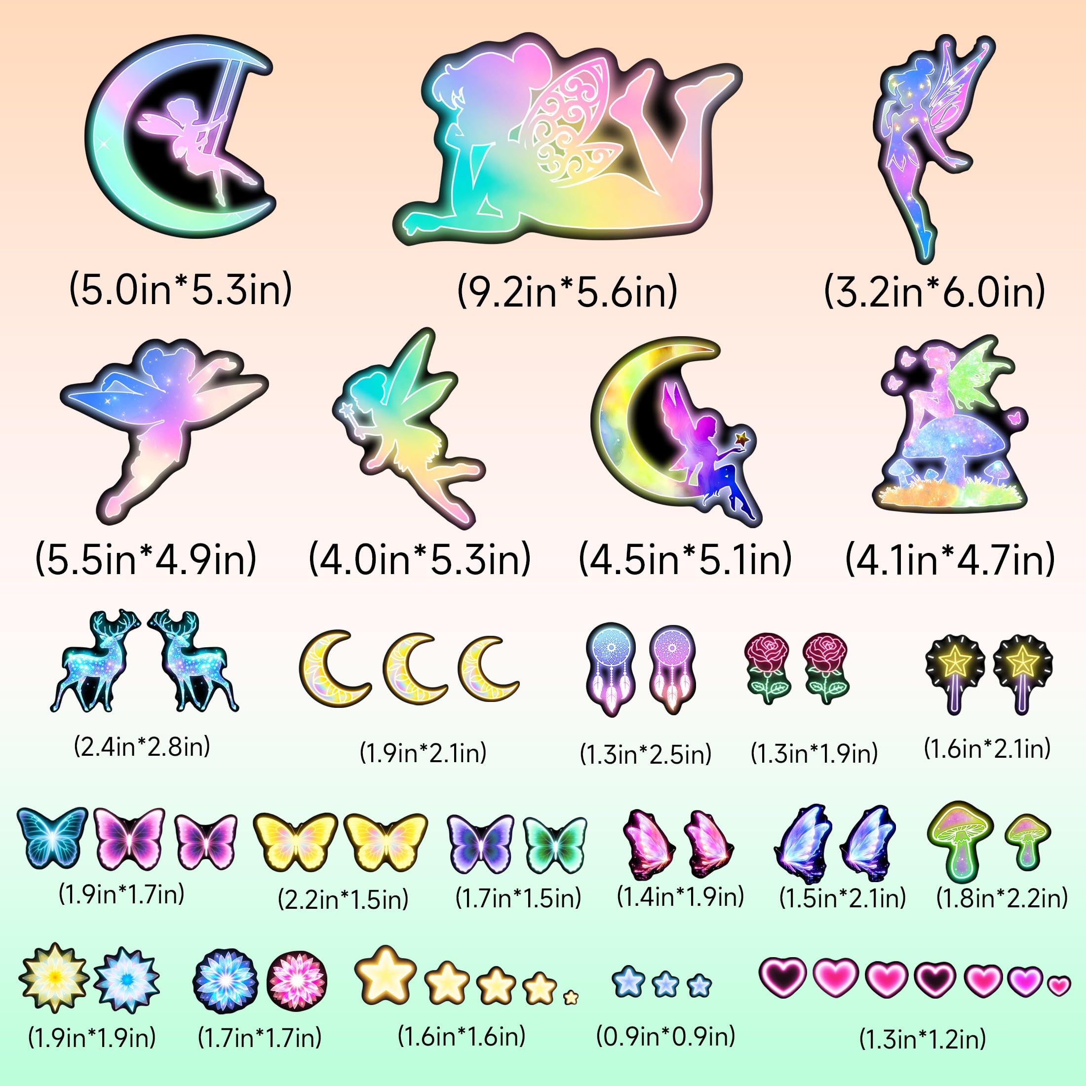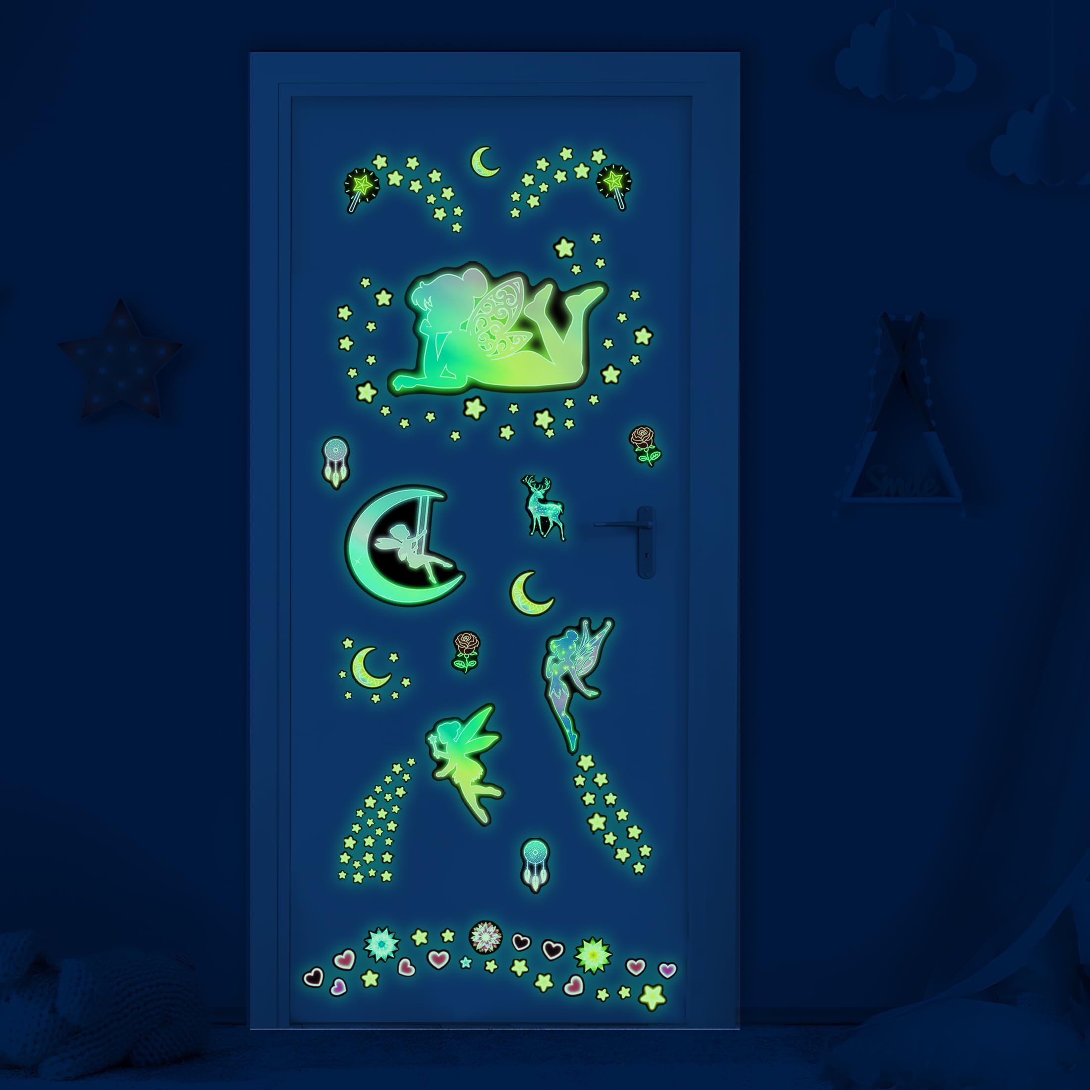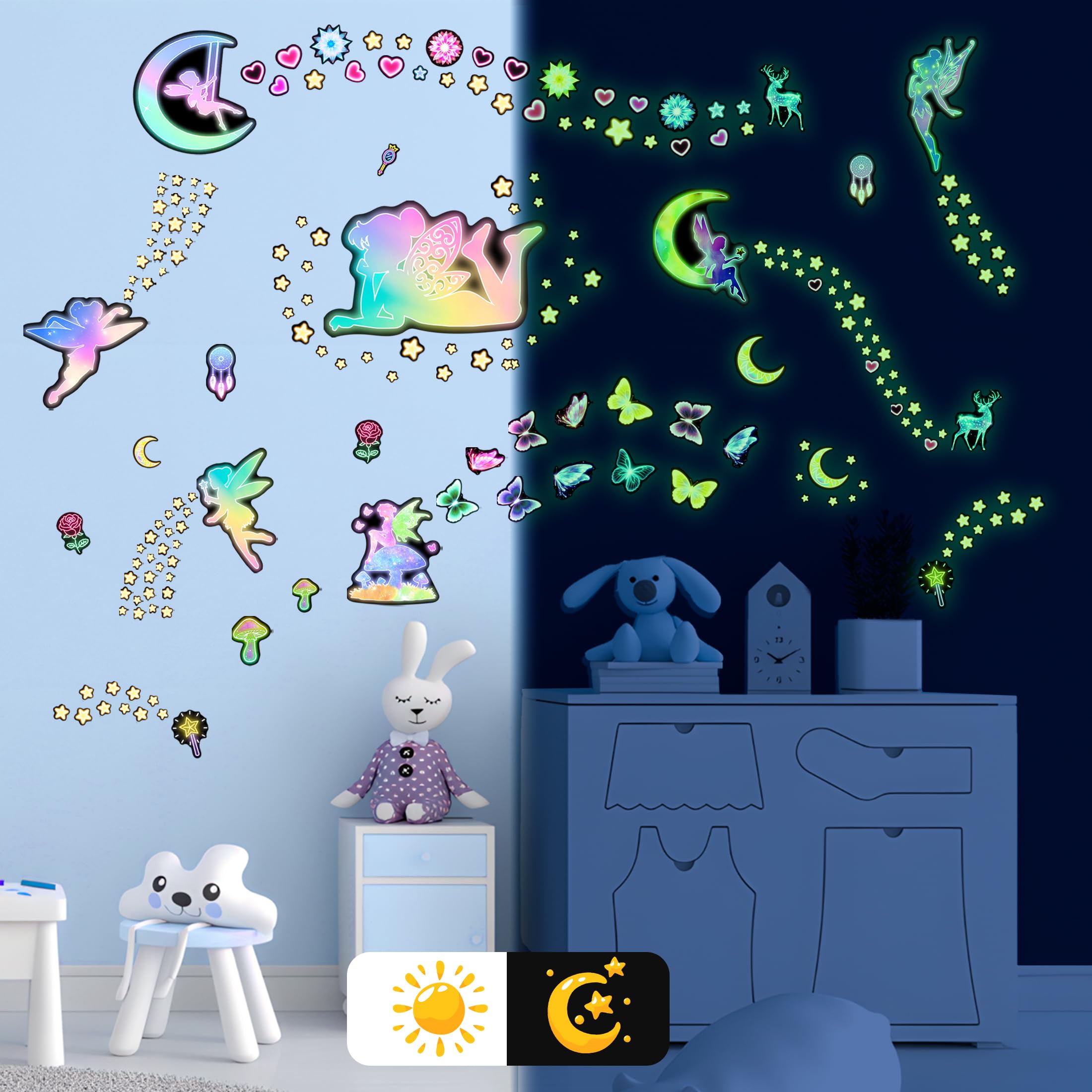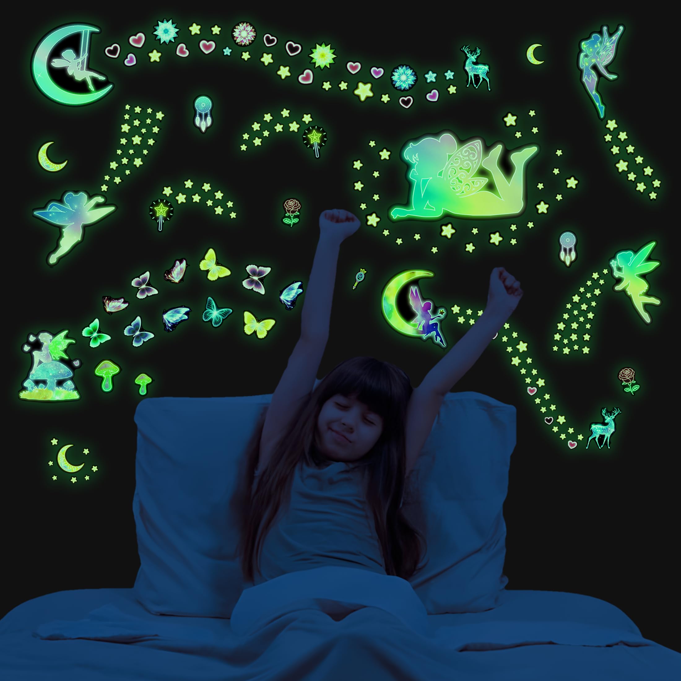 【PACKAGE CONTENTS】Package includes 4 sheets of different elf wall stickers with pattern content including elf fairies, butterflies, stars and hearts. Bright glowing wall stickers turn your room into a fantasy world!