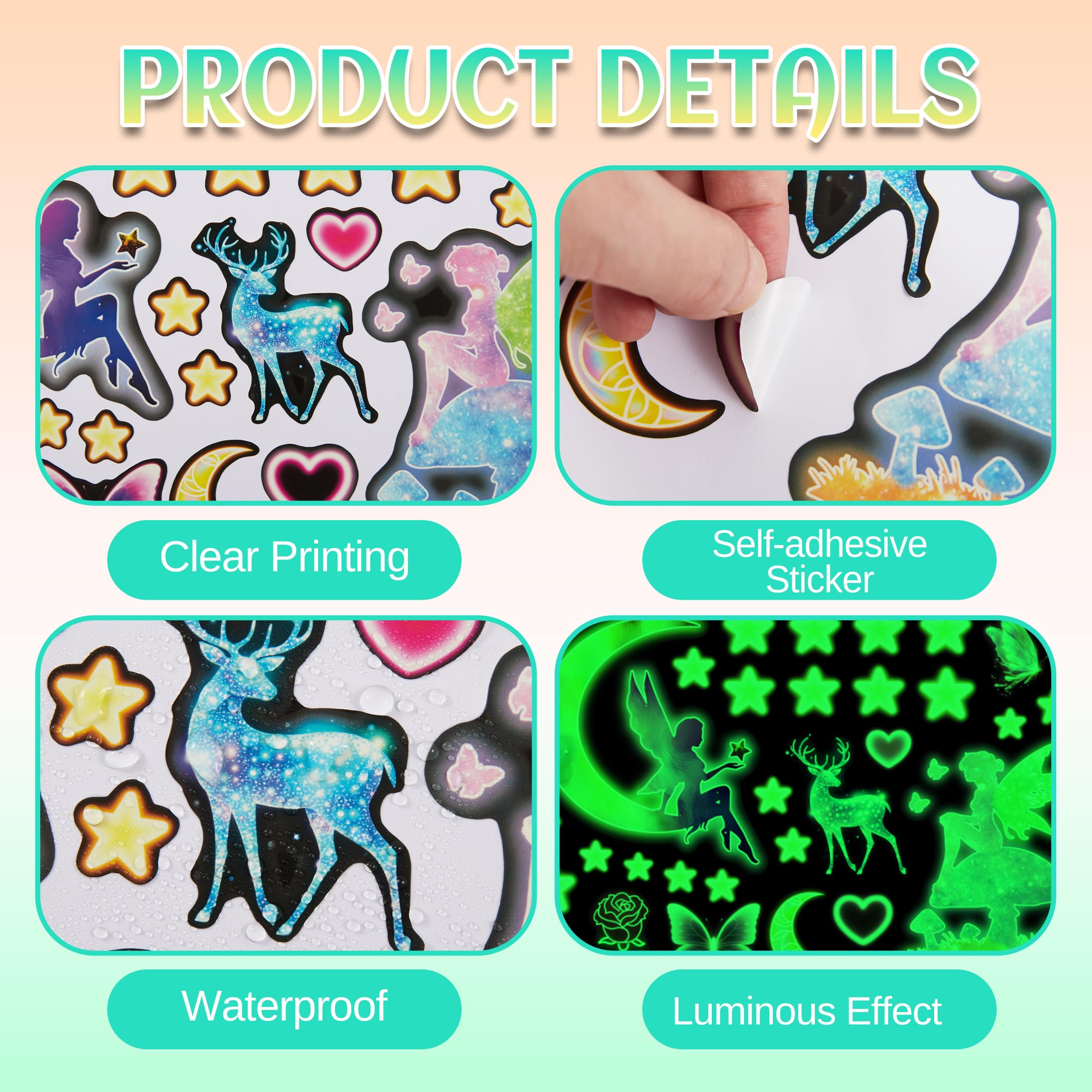 【GLOW IN THE DARK】After the sticker absorbs 15-30 minutes of sunlight or artificial light, the sticker will glow in a dark environment. The longer the light is absorbed, the longer it glows.
