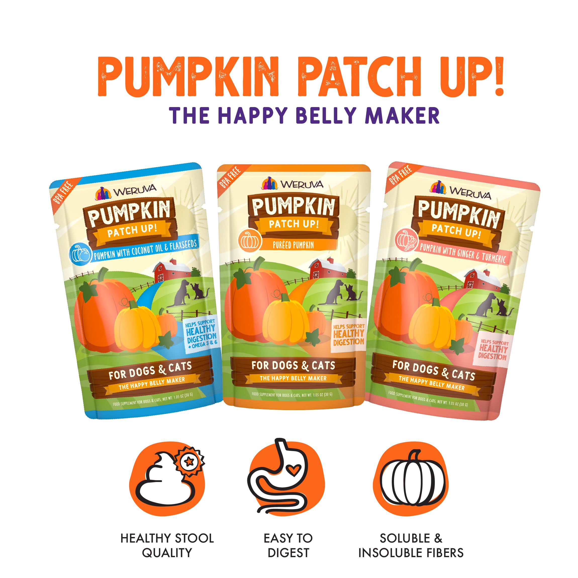 Weruva's pumpkin supplement is a great source of healthy fiber helping to support your cat's or dog's digestive system. The variety pack includes 4 each of Pumpkin Purée, Pumpkin with Ginger and Turmeric, and Pumpkin with Coconut Oil and Flaxseeds. The Happy Belly Maker from Weruva!