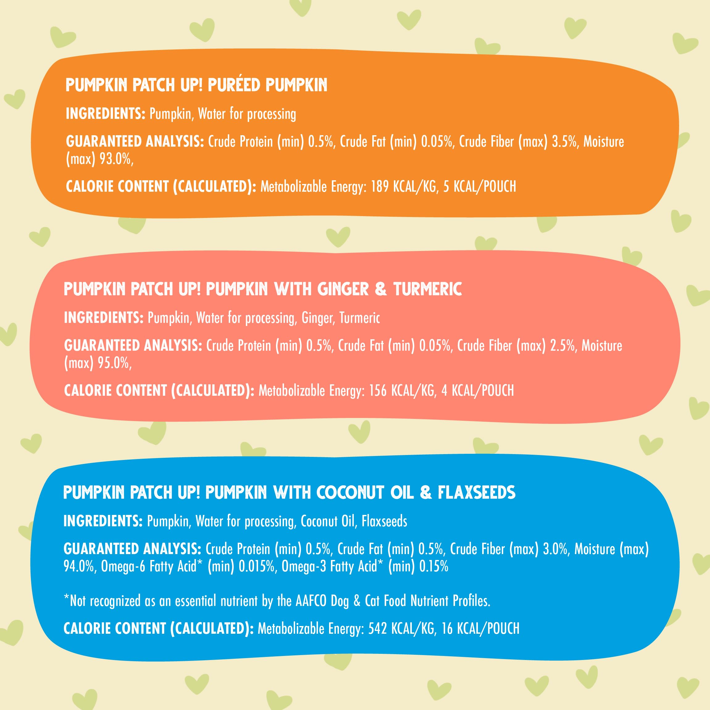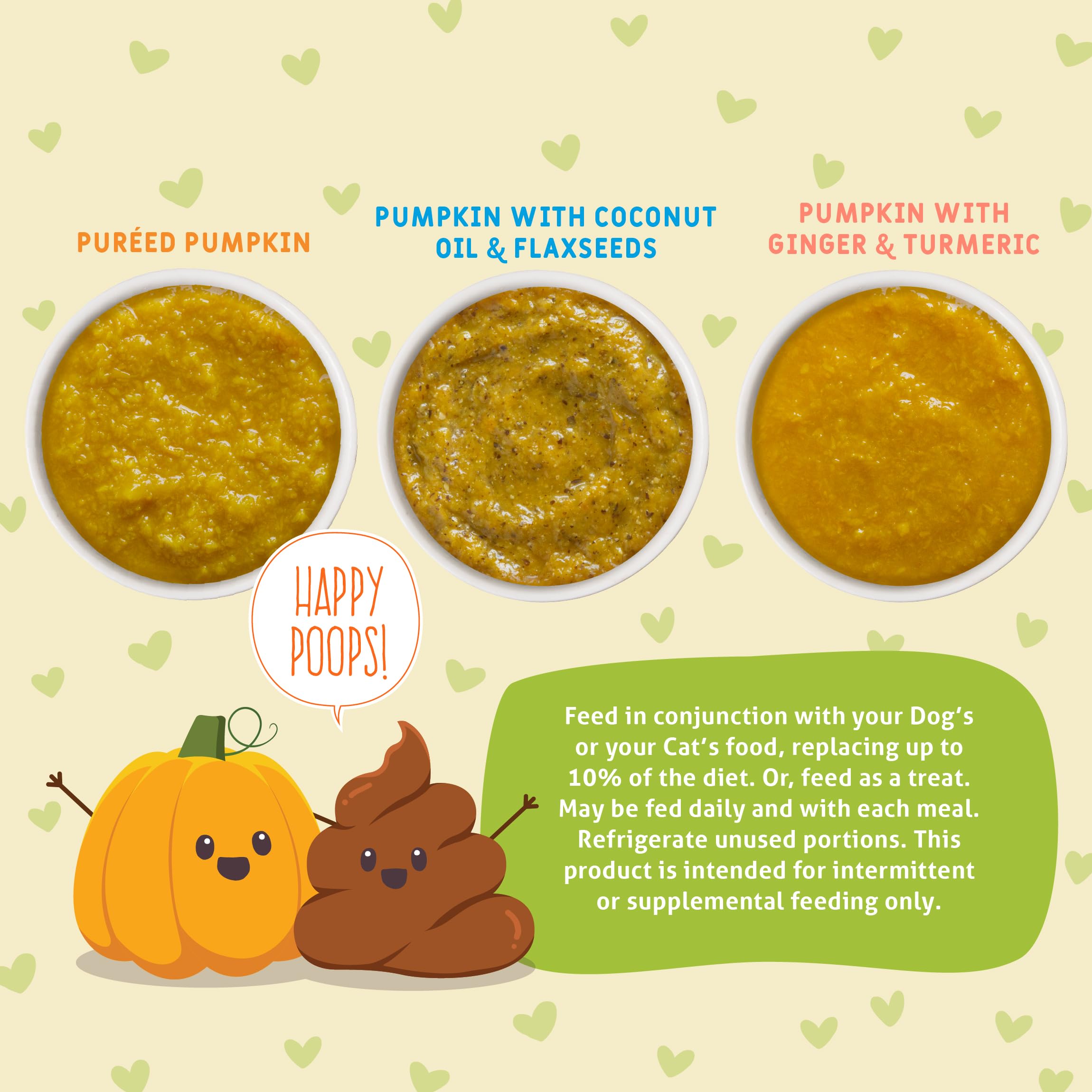 VARIETY: Give your dog or cat all the benefits of pumpkin with this variety 12 pack that contains four (4) each of Puréed Pumpkin, Pumpkin with Coconut Oil & Flaxseeds, and Pumpkin with Ginger & Turmeric.