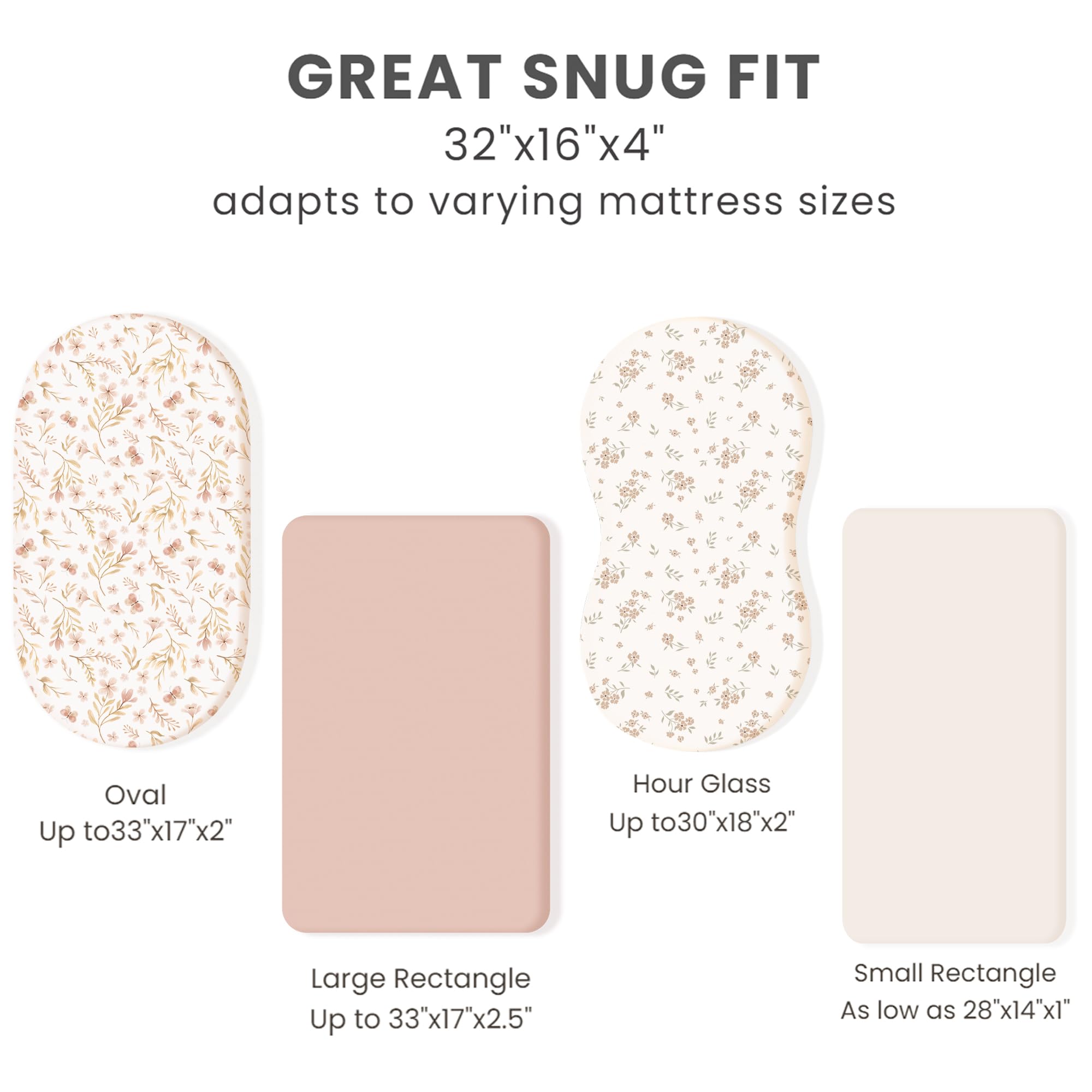 Universal Fit for Most Bassinet Mattresses: These bassinet mattress sheets (32" x 16") fit most bassinet mattresses, including oval, round, rectangle, and hourglass shapes. The elasticized edges provide a snug, secure fit for added safety