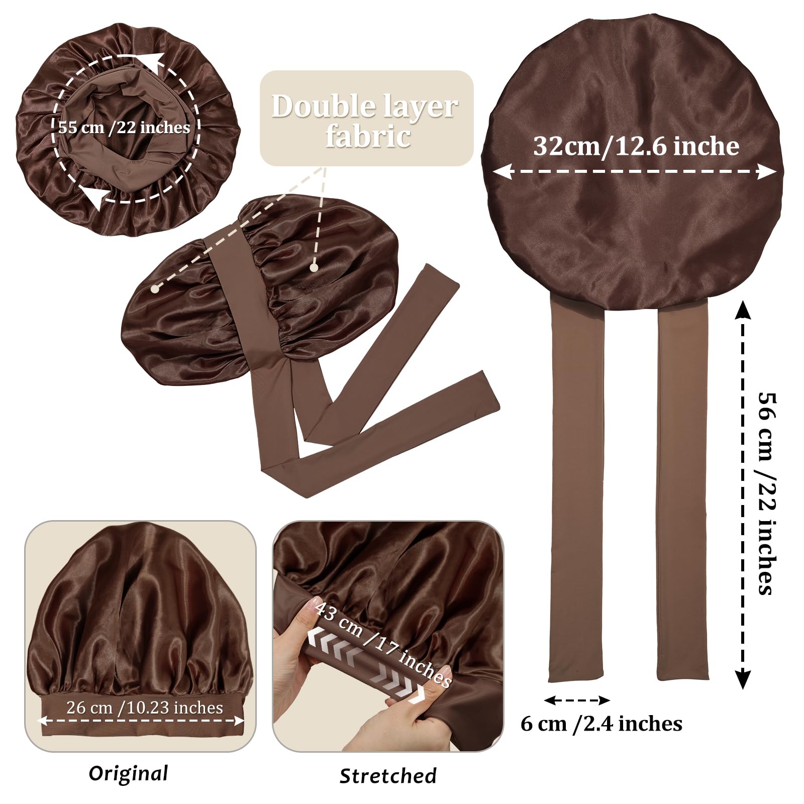 THE WIDE SOFT ELASTIC BAND MAKES COMFORTABLE ON THE HEAD - The tie band of the Satin hair bonnet measures 56 cm/22 in long and approximately 6 cm/2⅖in wide. It's soft enough and comfortable on your head and makes you sleep soundly. It can be adjustable to keep this bonnet in place to help protect your hair and reduce frizz, even if you're an active sleeper who tosses and turns a lot