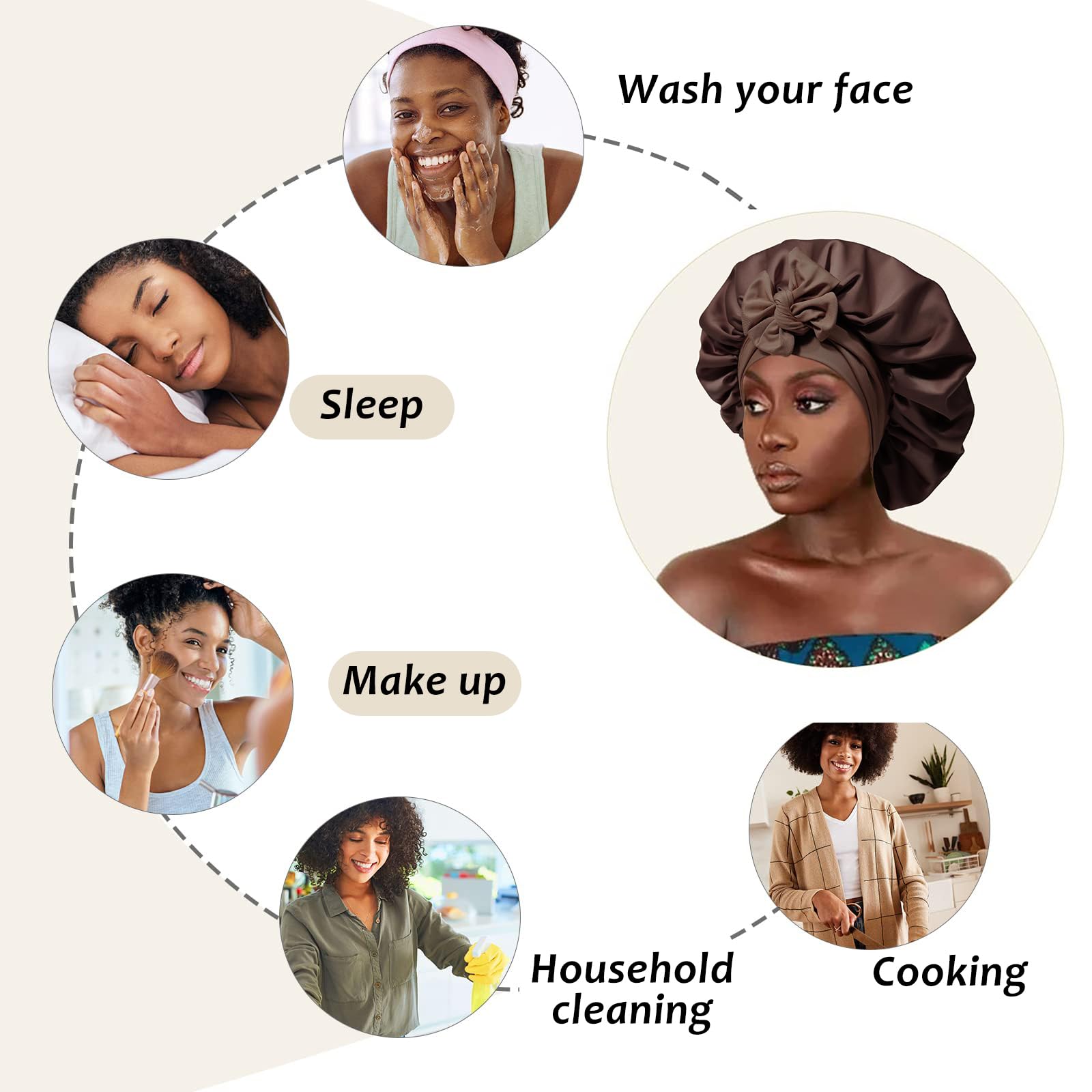 WHAT WILL YOU GET - The package Contains 1 satin sleep cap bonus and 3 pcs satin hair scrunchies. The edge of the large nightcap is a wide, soft, and comfortable elastic hair band that won't leave marks on your head. Satin hair scrunchies keep hair being a hair ponytail to match this satin bonnet