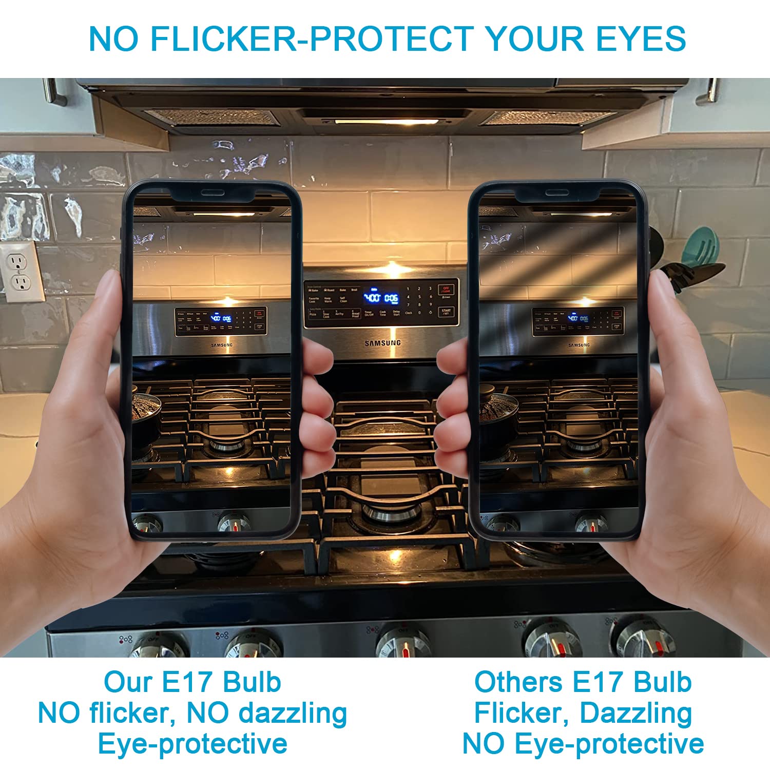 Nice Warm White Light: Microwave light bulbs under hood instant on without delay, no flicker, no buzzing sound. CRI 85ra, 3000k warm white stable light, making the food colors more appealing.