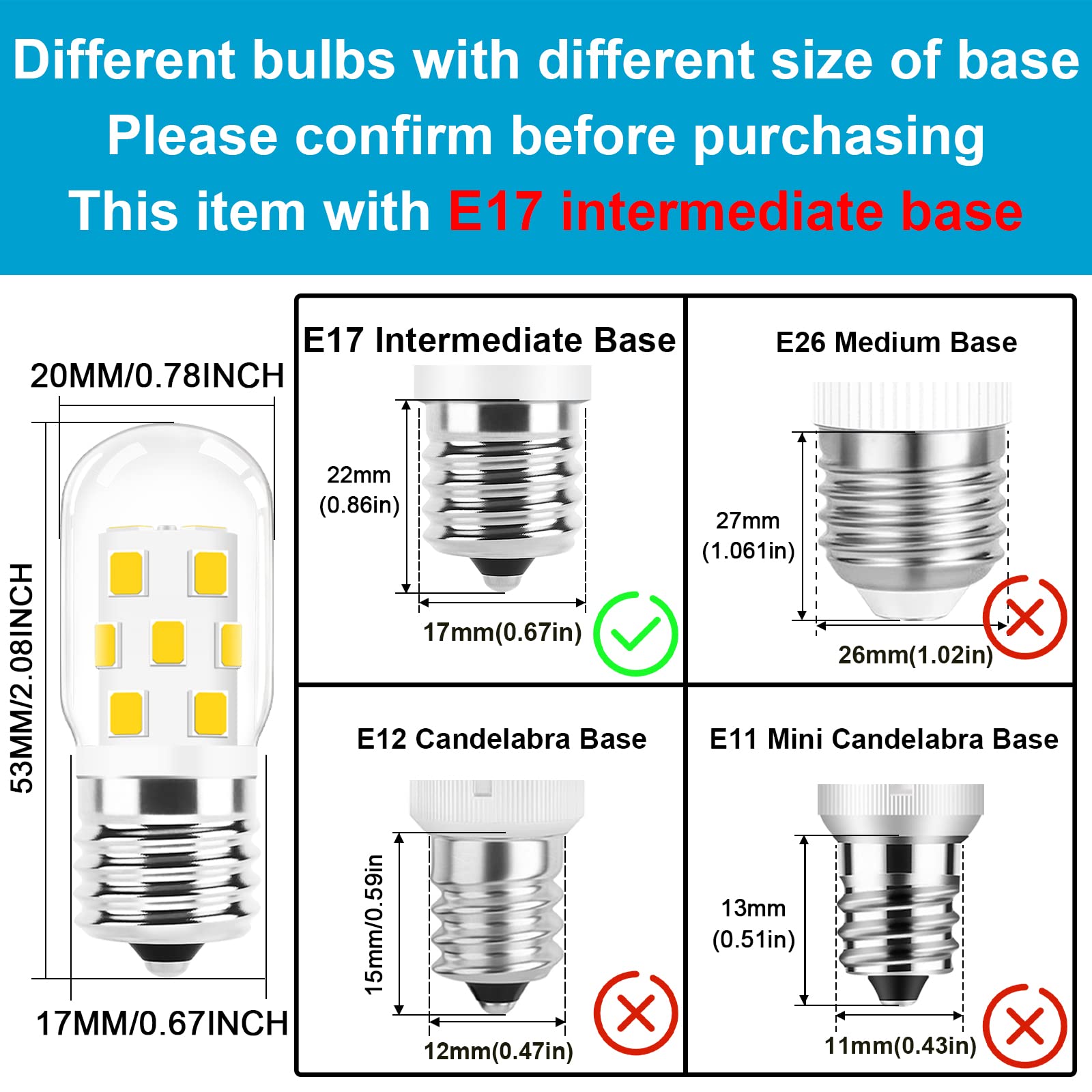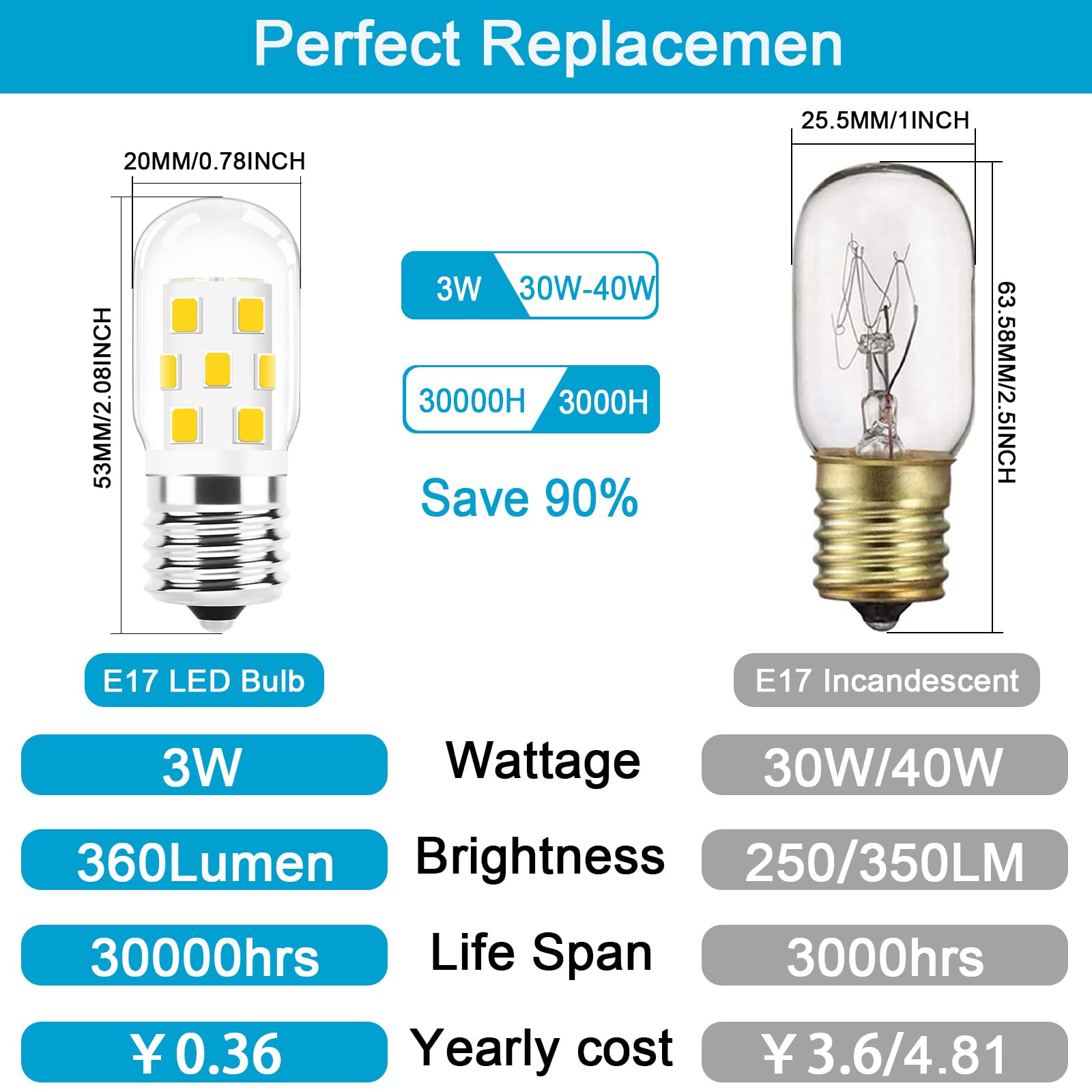 Easy Installation: E17 intermediate base LED appliance bulb used for microwave light bulb replacement, equivalent incandescent bulb: 6912W1Z004B, 8206232A, 8206232, 1890433, AP4512653, WB36X10003, WB25X10030, etc.