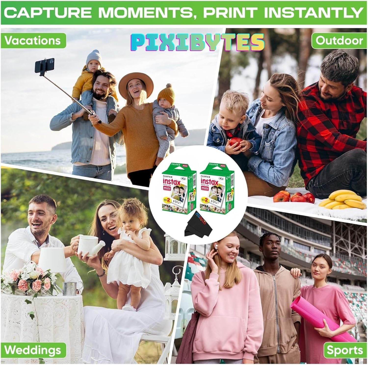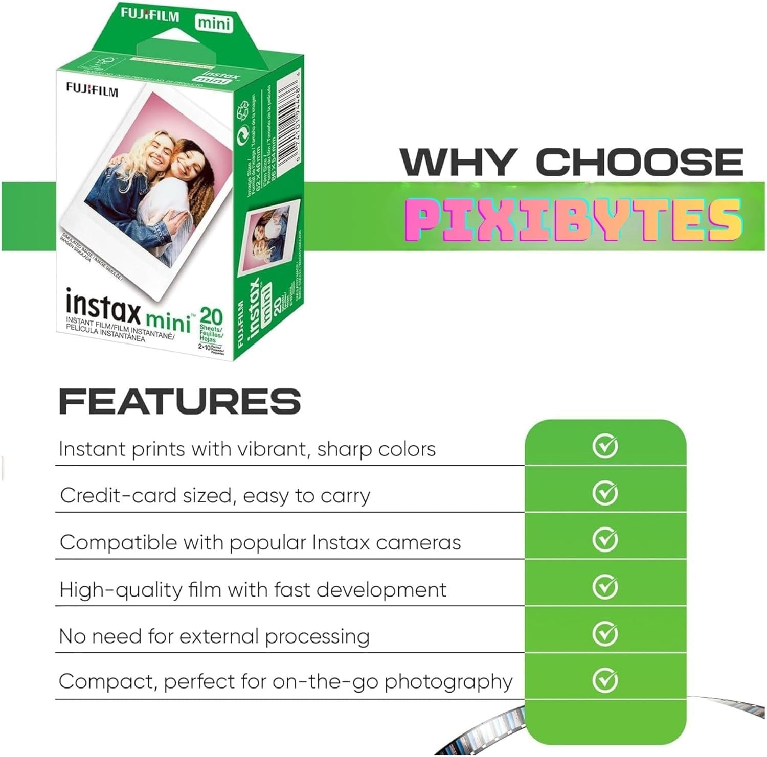 PACKAGE CONTENTS: Includes multiple twin packs of instant film, providing great value and extended shooting capacity. USB Flash Drive : A portable 32 GB USB stick for storing digital files. PixiBytes Microfiber Cleaning Cloth: A soft, reusable cloth for cleaning lenses, screens, or prints. Keeps your camera lens, viewfinder, or even your printed photos free of dust, fingerprints, and smudges.