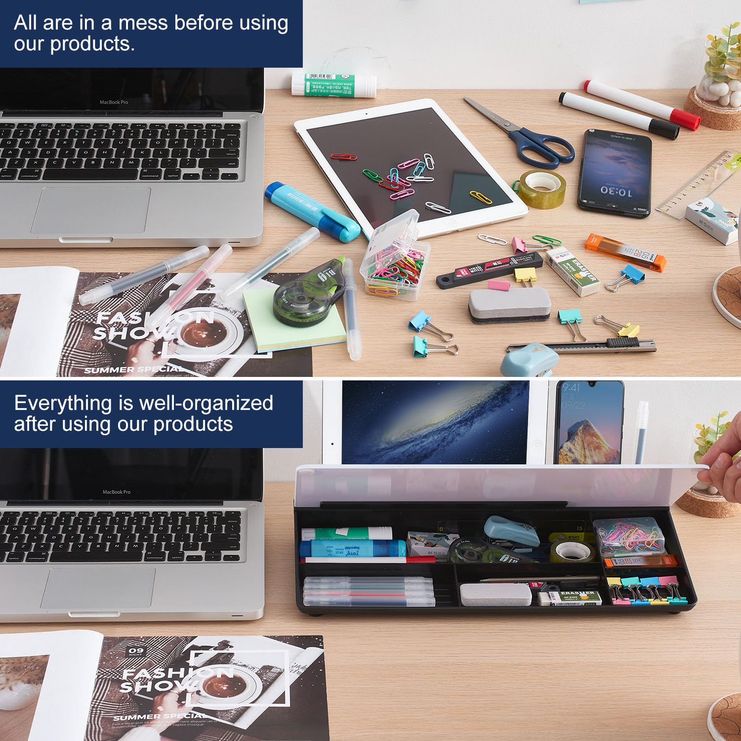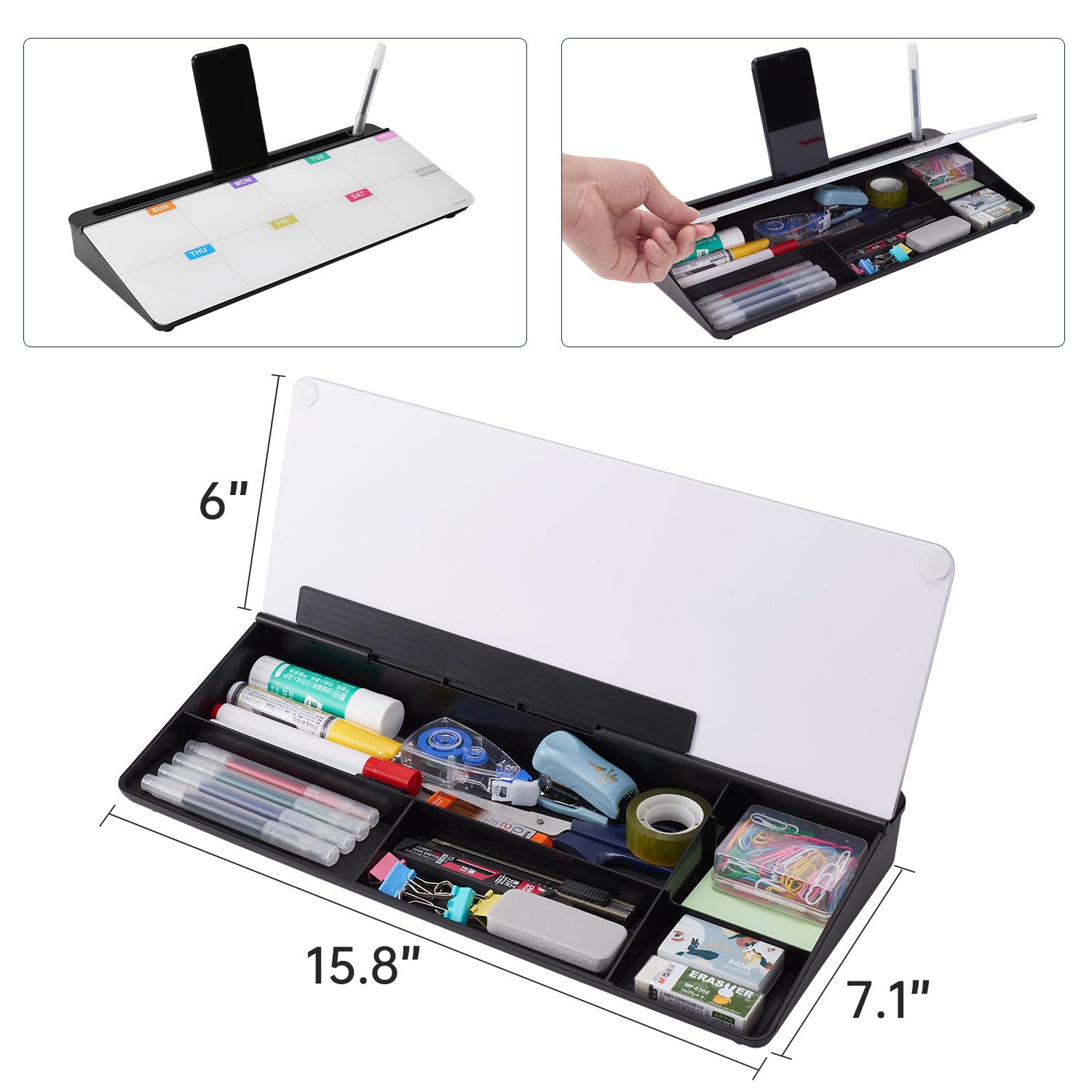 HIDDEN STORAGE & PAD/MOBILE TRAY: De-clutter your desk by storing markers, magnetic eraser and other desktop accessories in the opening drawer or place markers on the accessory tray for quick access. And one more long tray on the top of the dry erase white board for your pad or mobile.