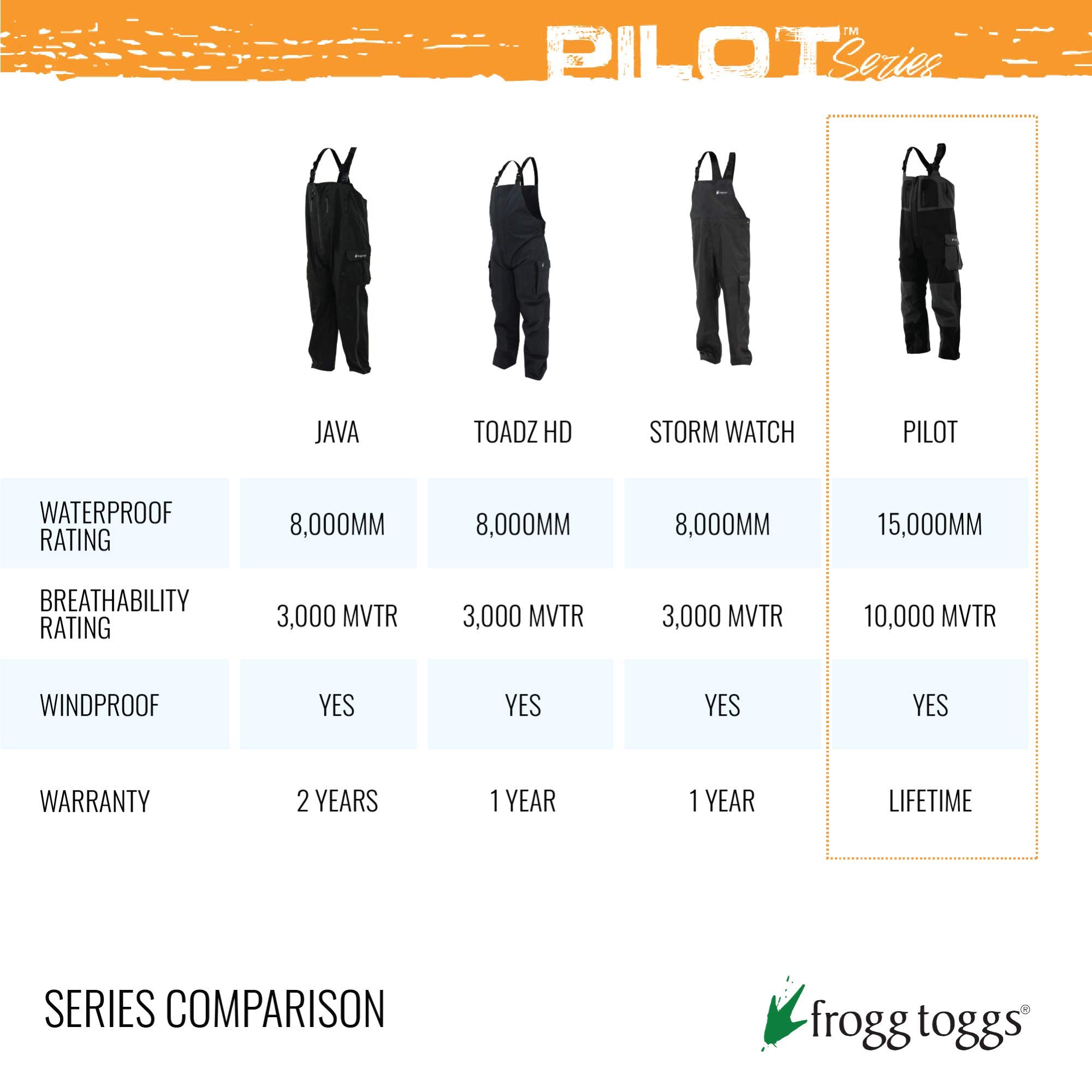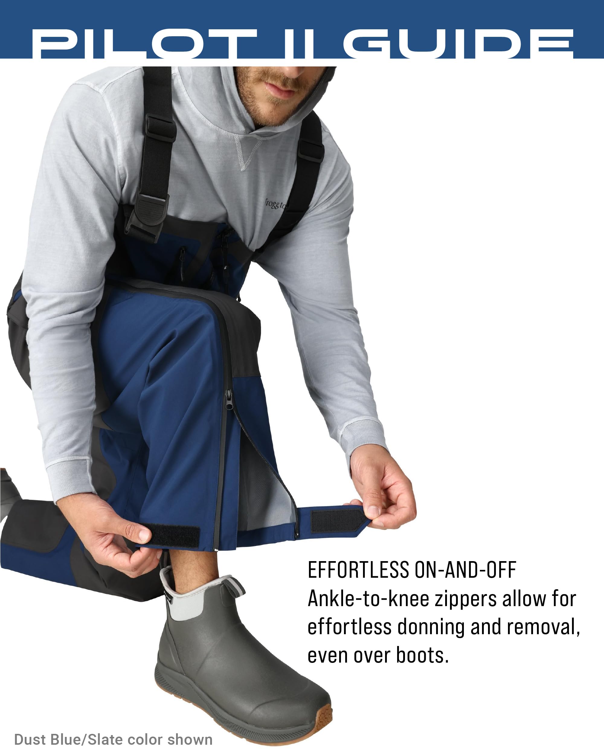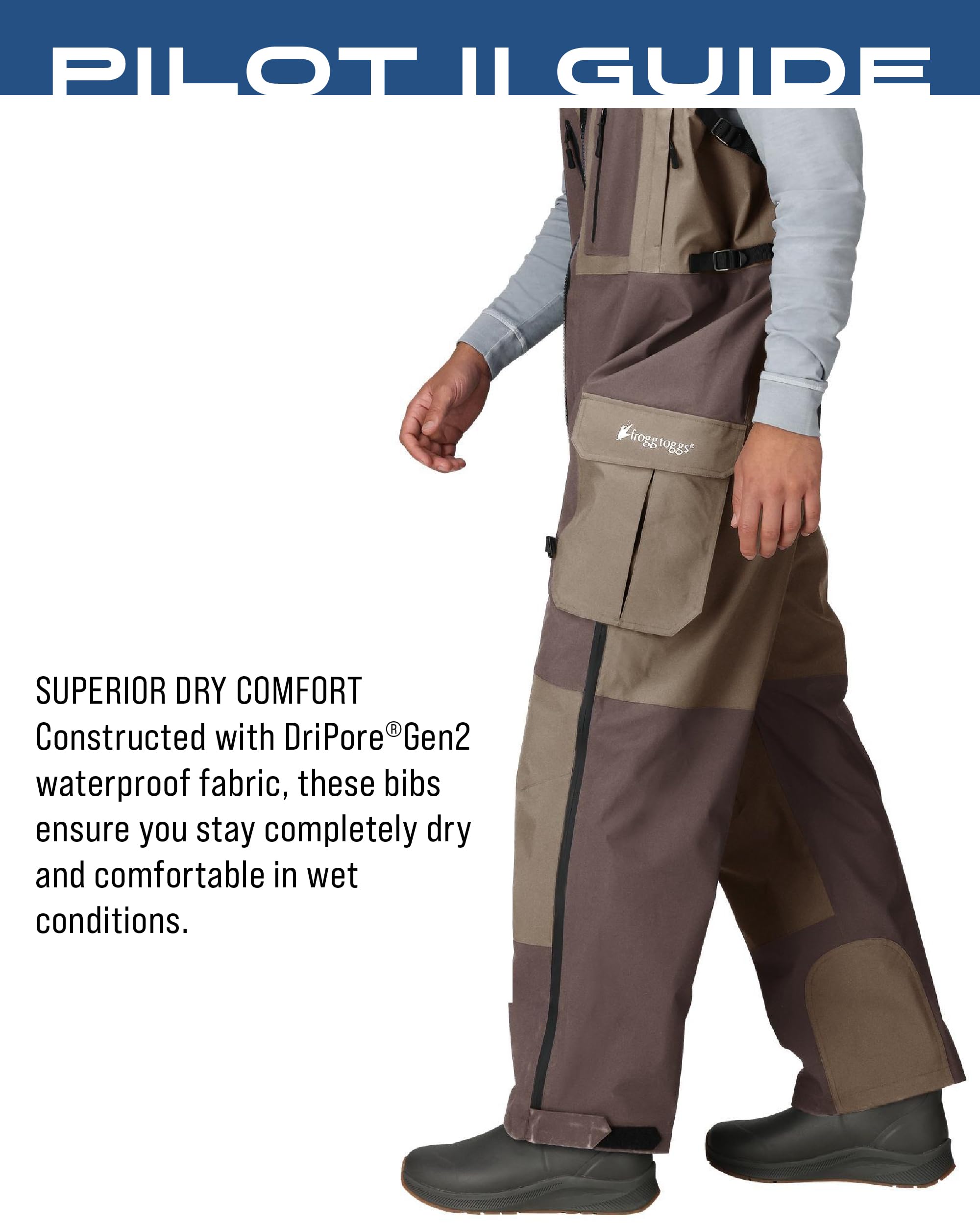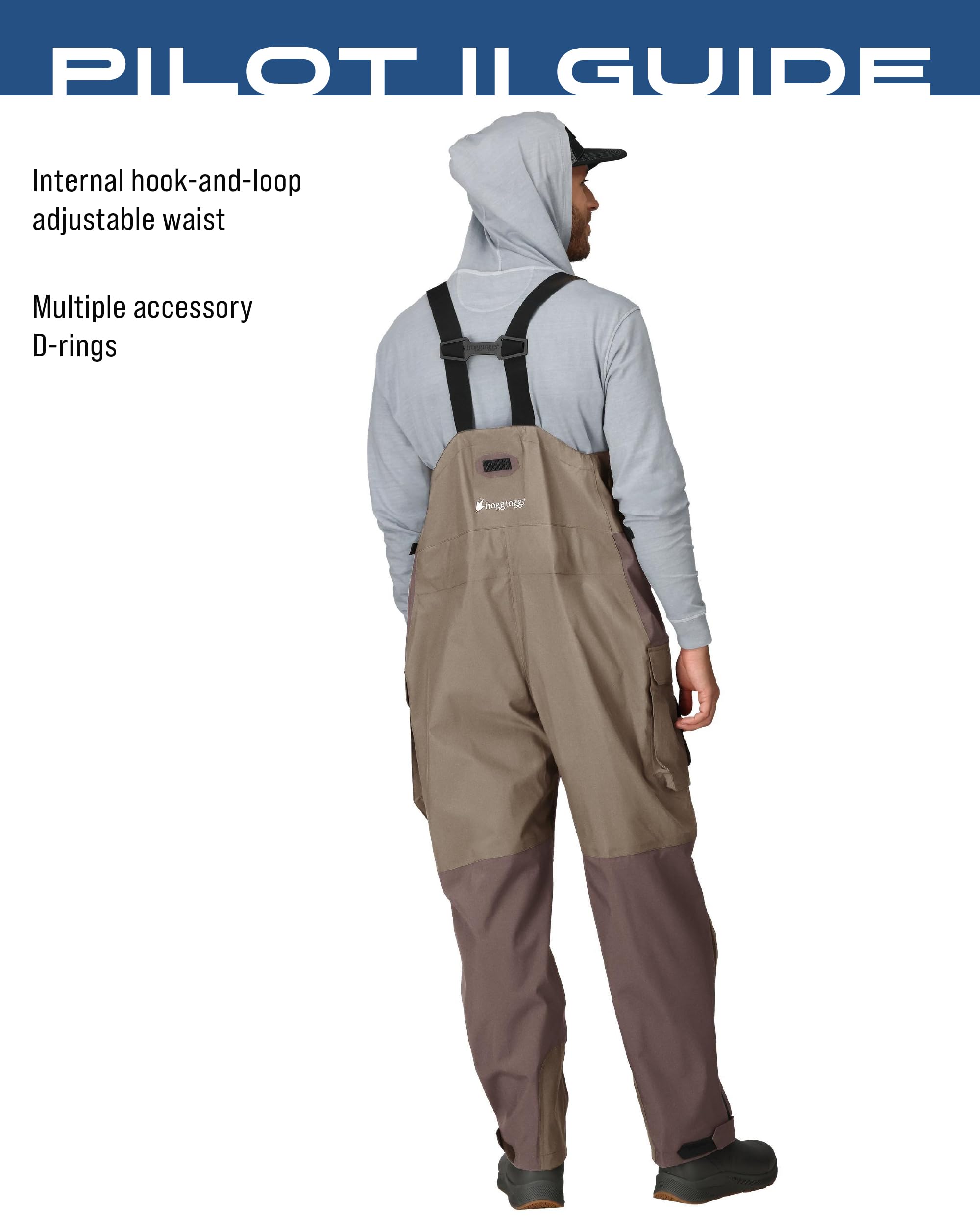 Description The Frogg Toggs Pilot II Bib is the perfect hunting and fishing companion. Comfort-stretch suspenders with locking buckles allow for a comfortable wear and multiple accessory D-rings provide added convenience. Zippered chest-storage pockets and quick-drain, expandable cargo pockets provide ample storage. The internal waist adjustment allows the wearer to achieve the perfect fit and zip-to-knee side zips for easy on and off make the Pilot II Bib easy to use and easy to love!