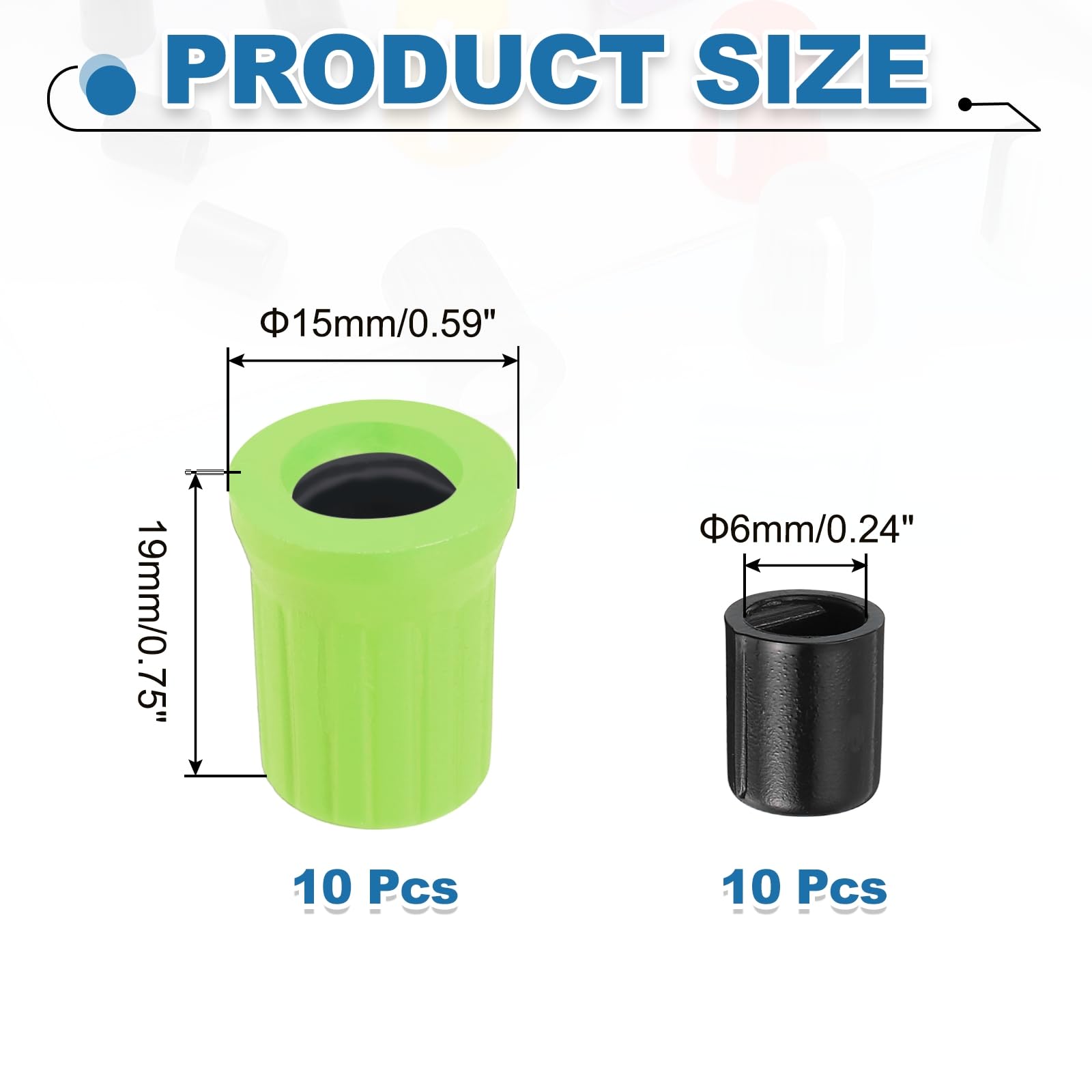 Potentiometer Control Knobs; Material:Rubber; Color:Green Black; Size:6mmx15mmx19mm/0.24 inchx0.59 inchx0.75 inch(IDxODxH); In the package of:10Pcs x Universal volume Rotary Knob