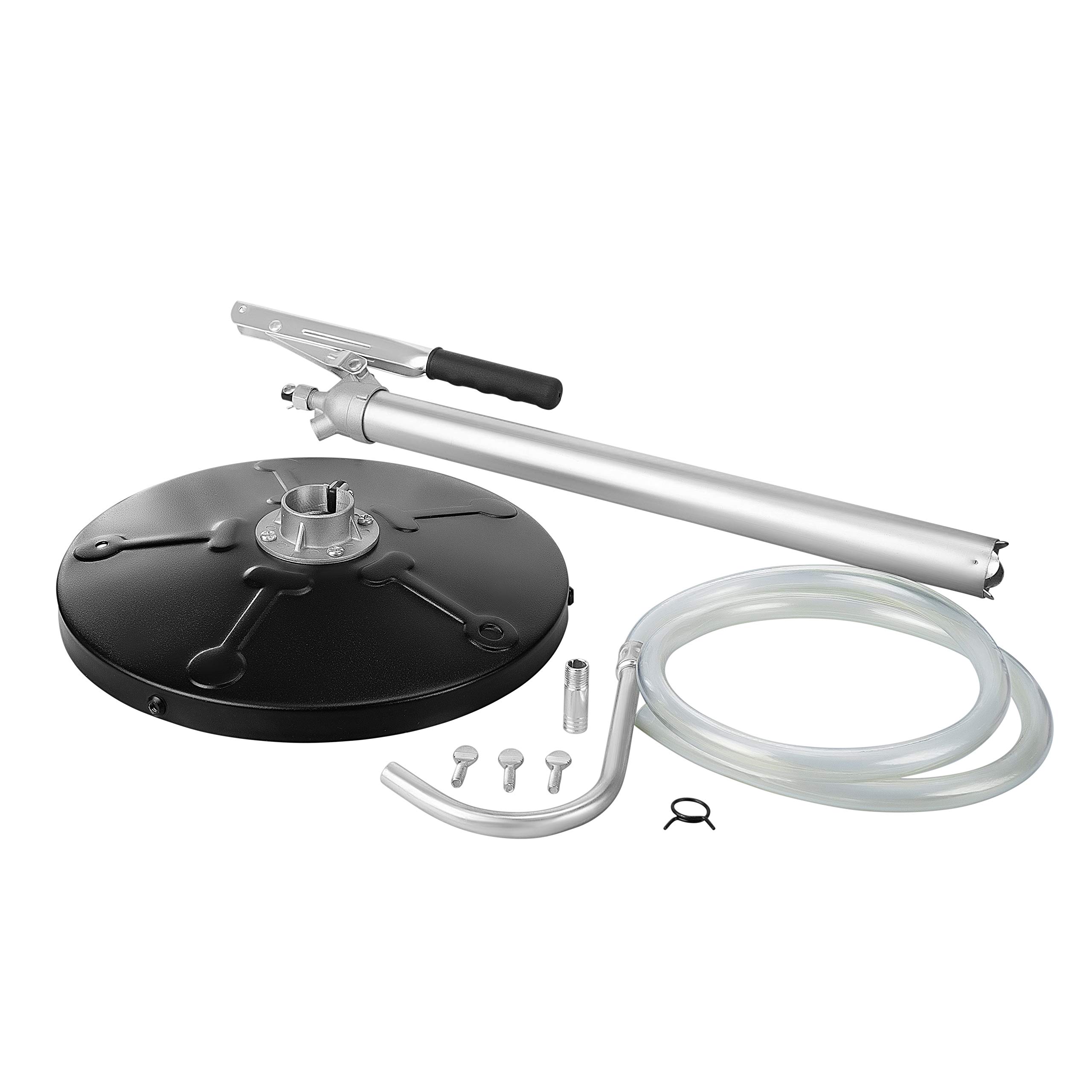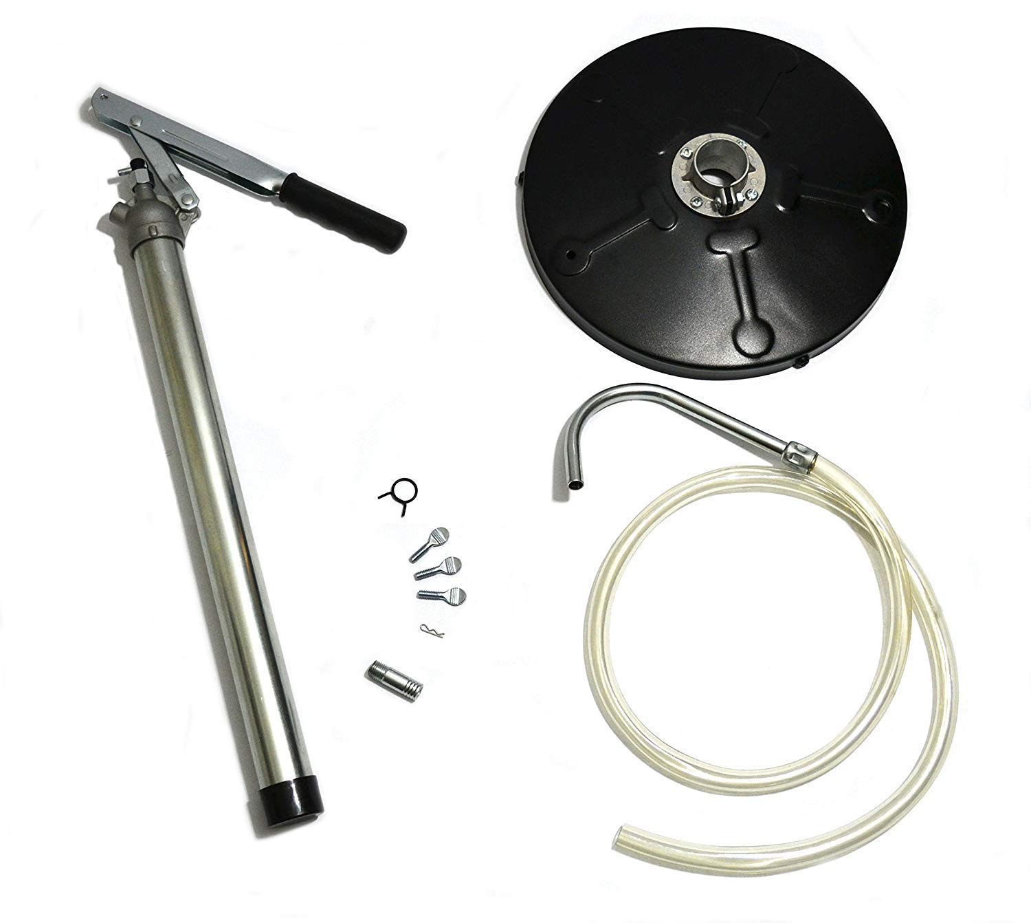 COMPLETE READY-TO-USE KIT - Includes pump with non-return valve, 12-inch steel drum cover that clamps to standard 5-gallon pails, 48-inch fuel-resistant hose, and bent discharge nozzle