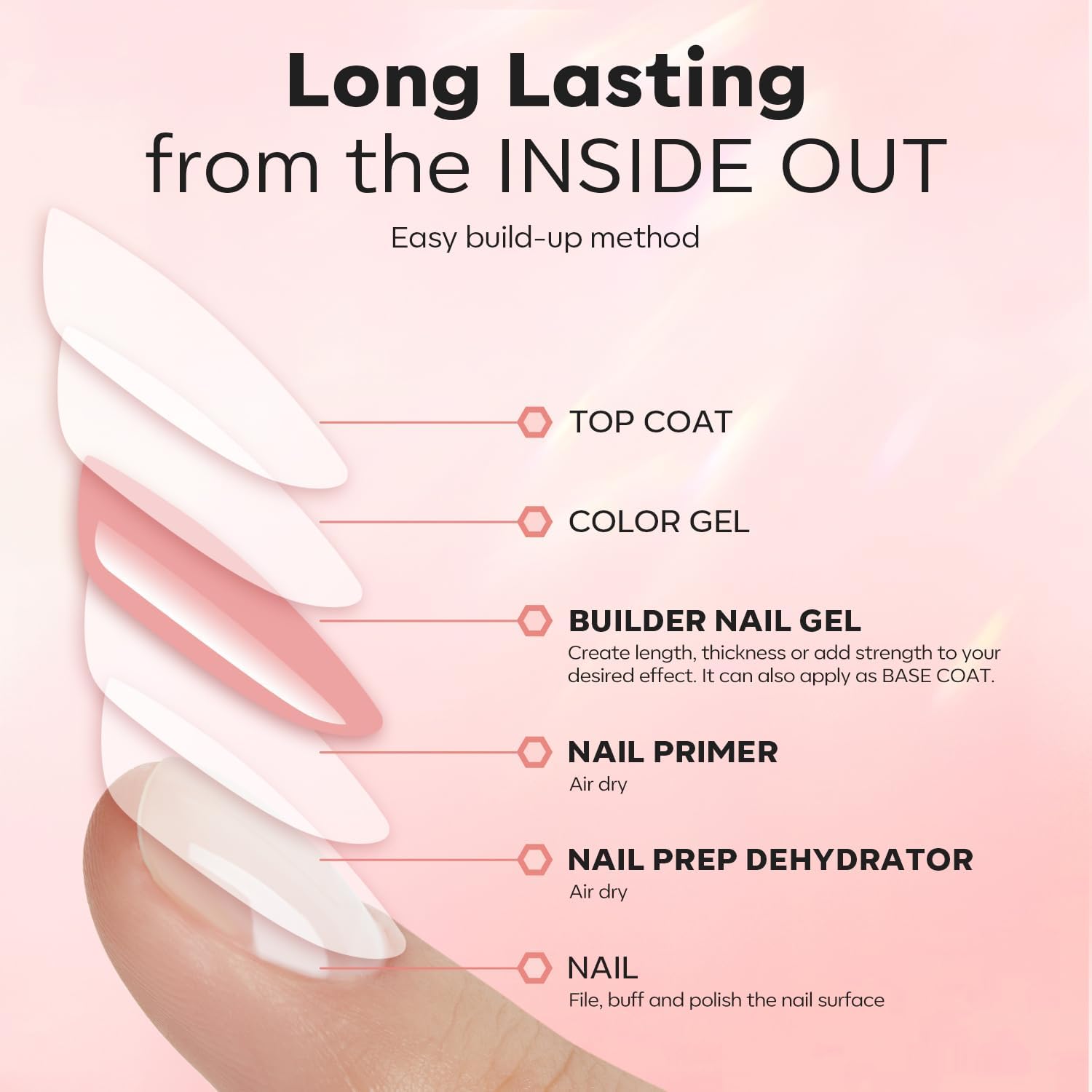 Comprehensive Nail Thickening Solution: Upgraded Nail Thickening Protection Trio Set with 1*10 ml Nude Pink Builder Nail Gel + 1*10 ml premium Nail Dehydrator + 1*10 ml Acid Free Primer. Exclusive combination for providing triple nail thickening protection for thin, soft, or brittle cracked nails, perfect for building the look you’ve always dreamed of. Note: Need to be cured under U V / LED lamp for 60-90 s after applying builder nail gel