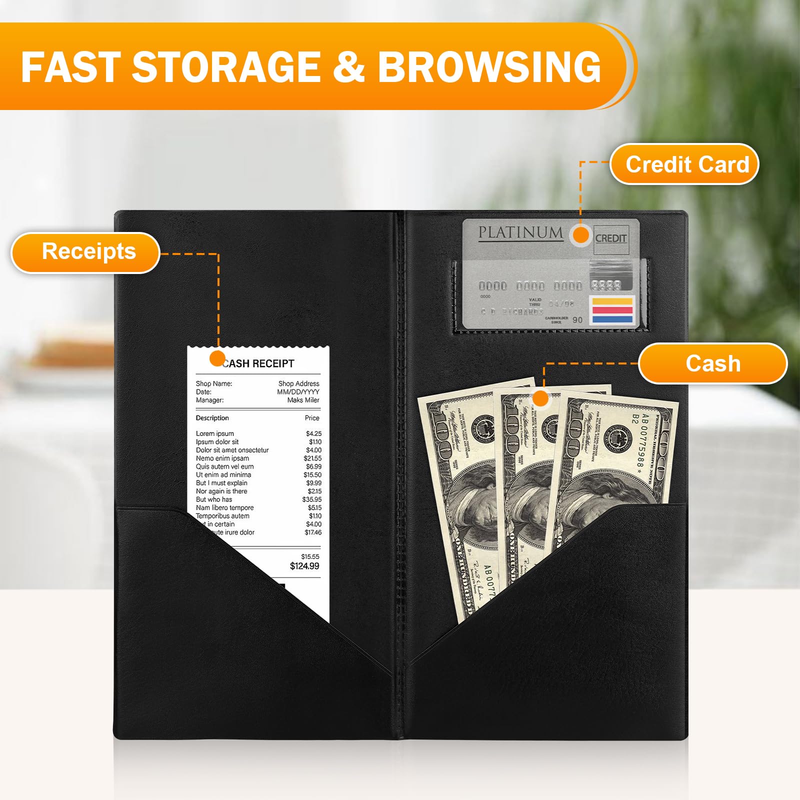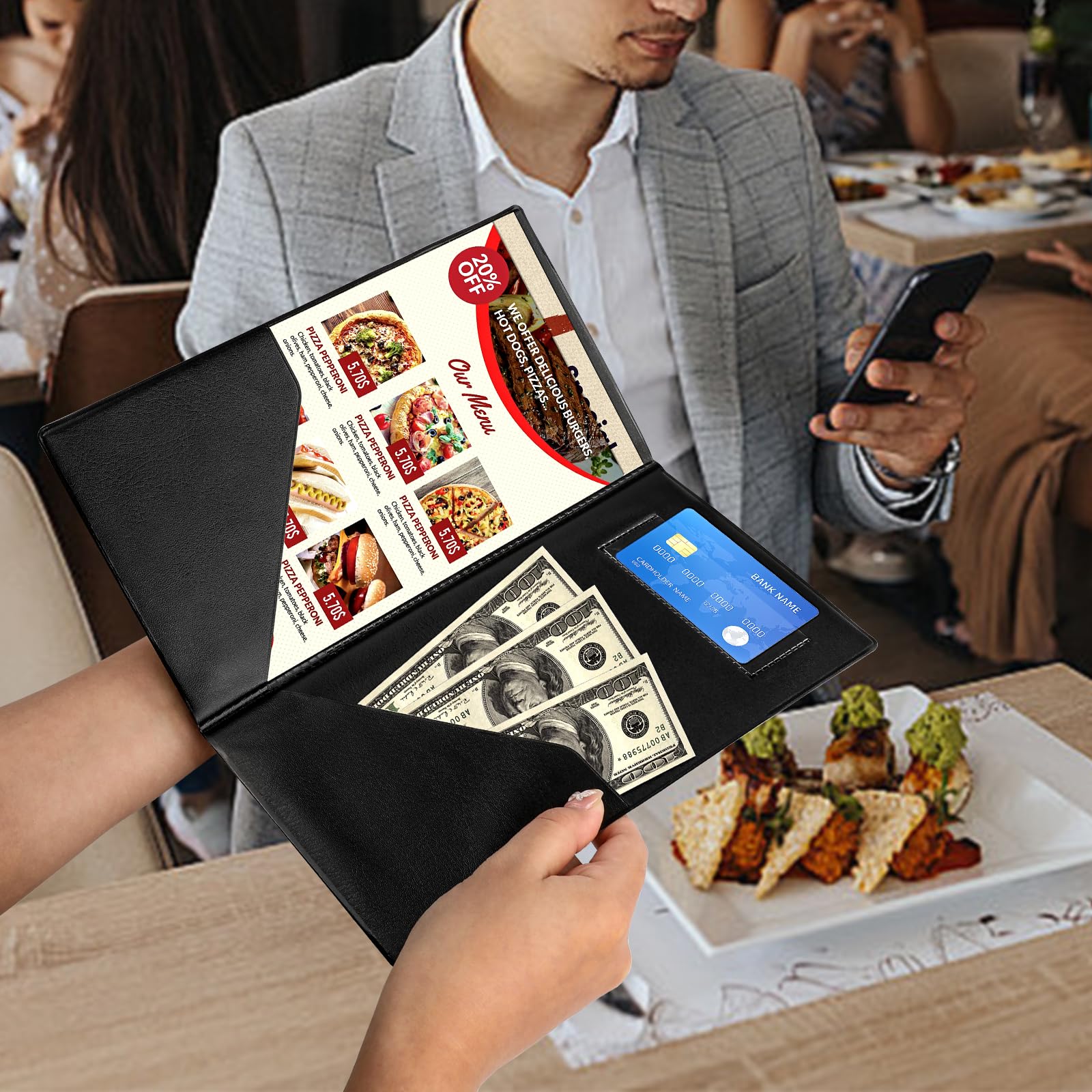 DESIGNED FOR SERVICE: Two built-in side pockets and one clear card pocket, convenient for you to easily organize your guest checkbook, special menus, credit cards, receipts and money. The restaurant check book allows restaurants and servers to serve guests decently