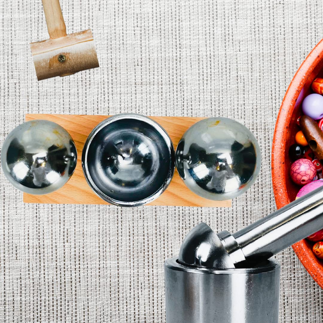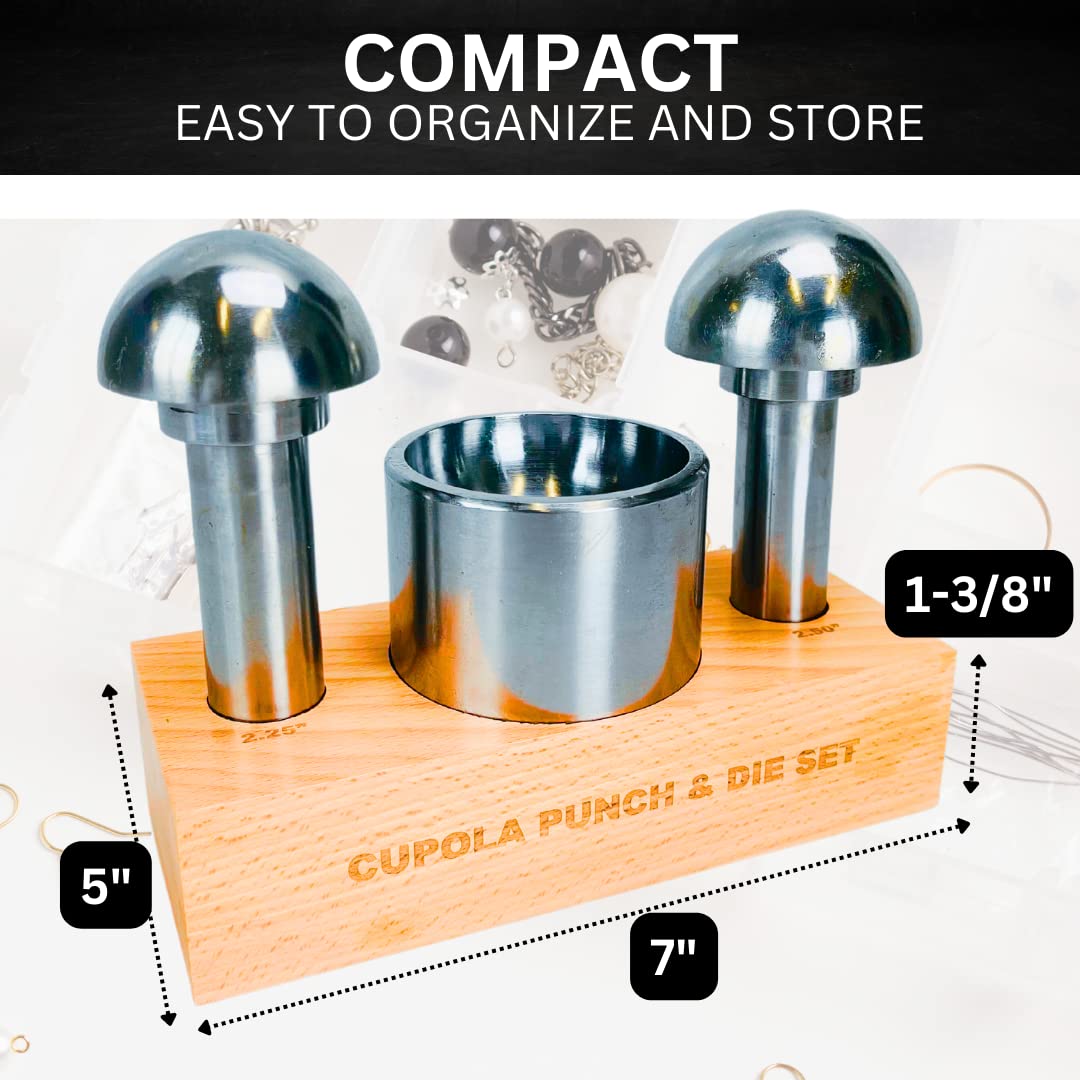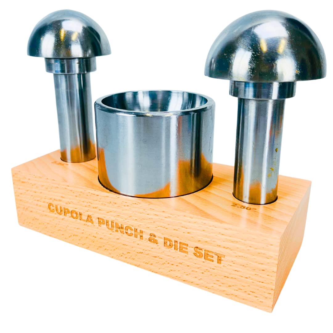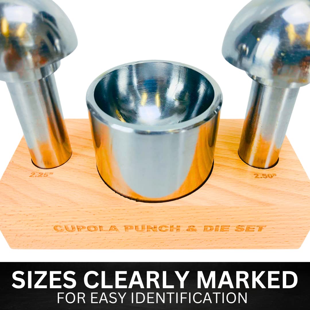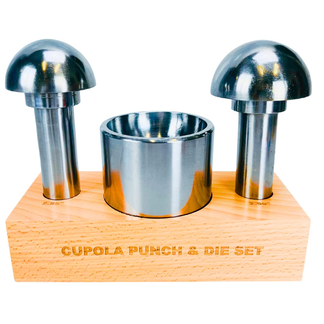 Introducing our Extra Large Size Cupola Punch & Die Set, the ultimate solution for bending sheet metal with precision and ease. This durable and heavy-duty set is meticulously crafted to meet the demands of professional metalworkers and enthusiasts alike. With its versatile design and reliable construction, it's a must-have tool for any workshop. Featuring two mushroom-shaped punches, measuring 50.8mm and 57.2mm, this set offers flexibility in creating different bends and shapes in sheet metal. The punches are meticulously engineered to ensure optimal performance and longevity, enabling you to tackle various projects with confidence. The highlight of this set is the cup-shaped die, which is designed to fit both punch sizes. With the unique capability to be lifted from the tray and reversed, you can effortlessly switch between the two sizes, allowing for enhanced versatility and convenience. No need to purchase separate dies – this set covers it all. Crafted from high-quality materials, this punch and die set boasts exceptional durability, ensuring long-lasting use even under heavy workloads. The heavy-duty construction guarantees reliable performance, allowing you to achieve precise bends in sheet metal consistently. To keep your tools organized and easily accessible, the cupola punch and die set comes complete with a sturdy wooden stand. This stand not only provides a secure storage solution but also adds a touch of elegance to your workspace. With everything neatly arranged, you can focus on your projects without the hassle of searching for the right tool. Whether you're a professional metalworker or a passionate hobbyist, our Extra Large Size Cupola Punch & Die Set is the ideal companion for bending sheet metal with precision. Upgrade your workshop today with this exceptional set and unlock endless possibilities in your metalworking projects.