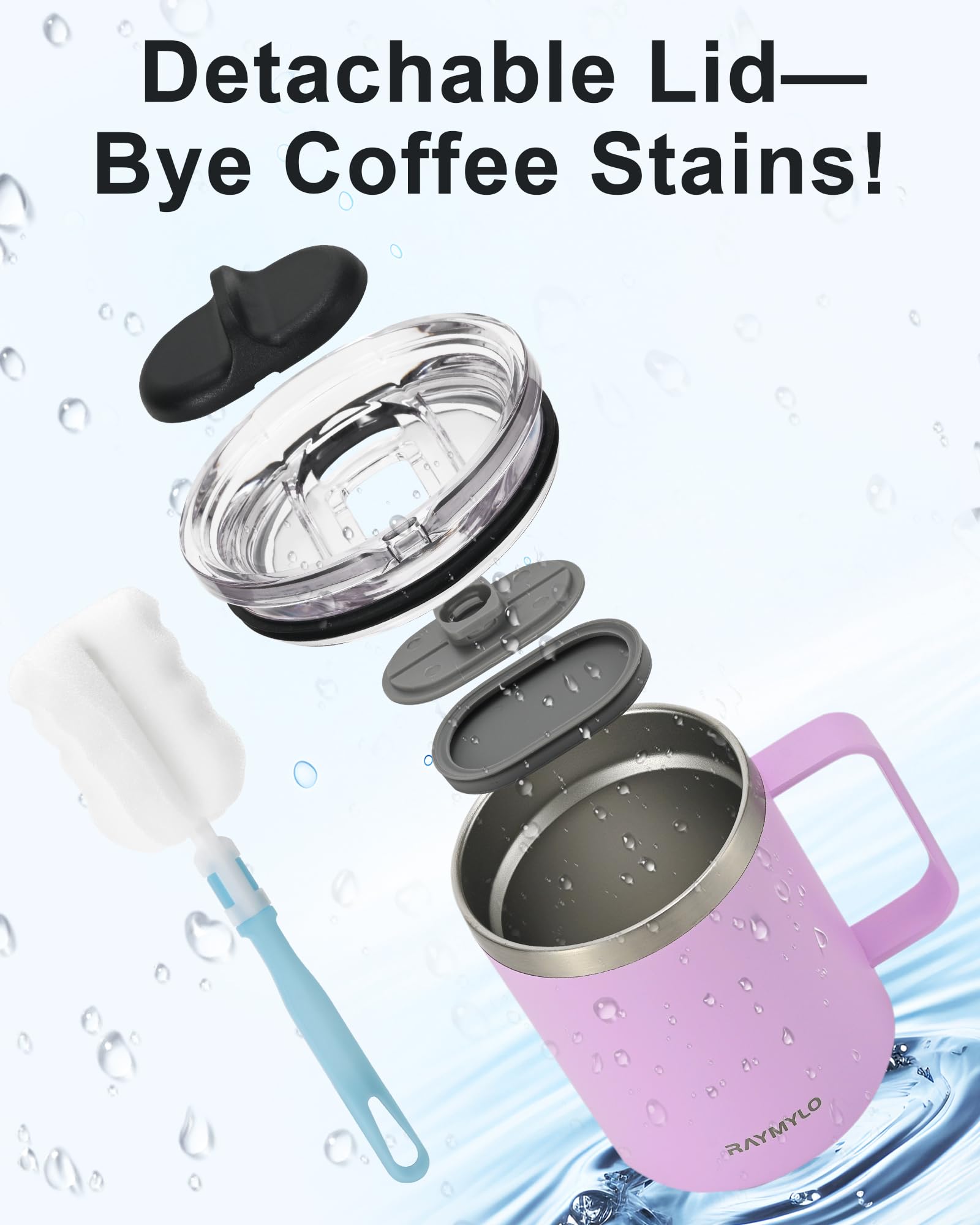 Effortless Cleaning: The reusable coffee mug features a detachable lid that takes off easily. Its user-friendly design means disassembly and reassembly are a breeze, allows you scrub away coffee stains from every nook and cranny. The included cup brush reaches deep into the stainless-steel interior, leaving no stubborn residue behind. Keep your coffee mug spotless with ease!