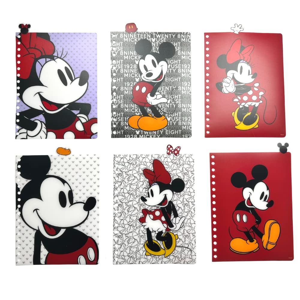 MICKEY & MINNIE NOTEBOOK - Features a cover with Mickey's face and letters, lined pages with color images of Mickey and Minnie on the corners, 6 color section dividers, and tab dividers.