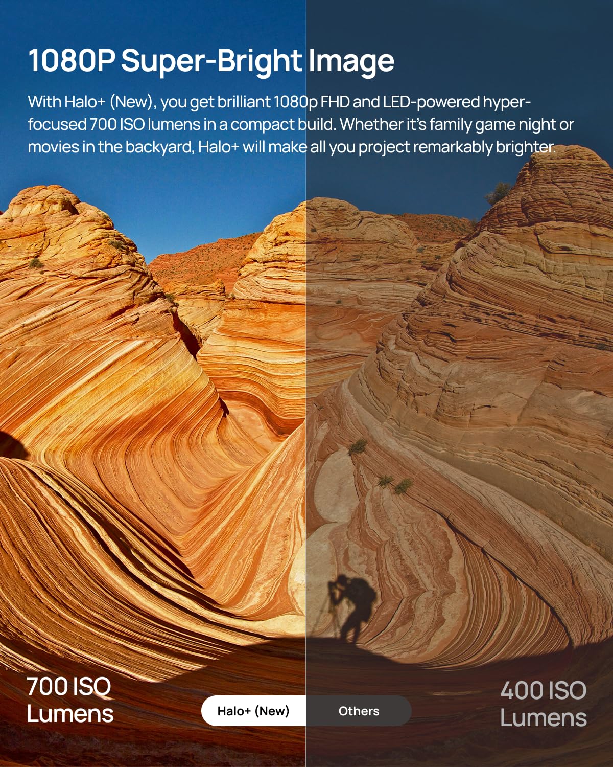 1080P Super-Bright Image: With Halo+, you get brilliant 1080p FHD and LED-powered hyper-focused 700 ISO lumens in a compact build. Whether it's family game night or movies in the backyard, Halo+ will undoubtedly make all you project remarkably brighter.