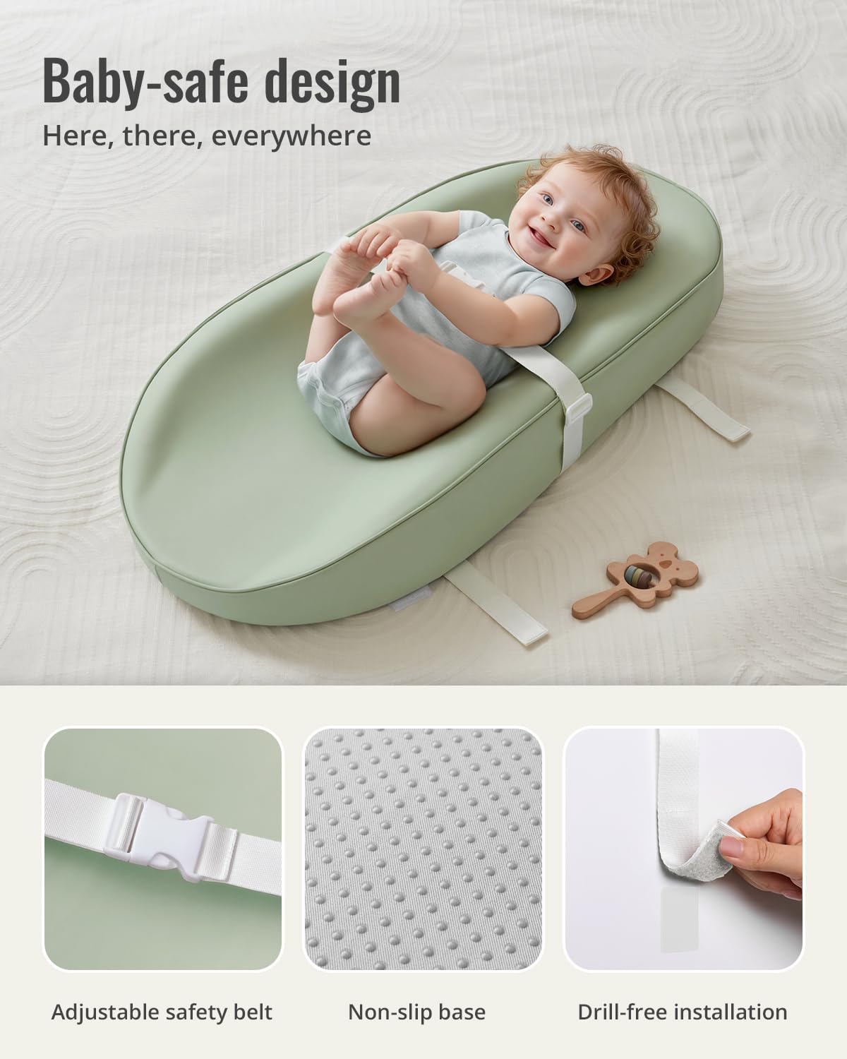 Prioritizing Baby's Safety: Vegan leather free of PVC, phthalates, and toxins, safety tested to meet U.S. ASTM & CPSIA standards. Contoured anti-roll sides, quick-release belt, straps, and non-skid bottom keep baby secure during diaper changes.