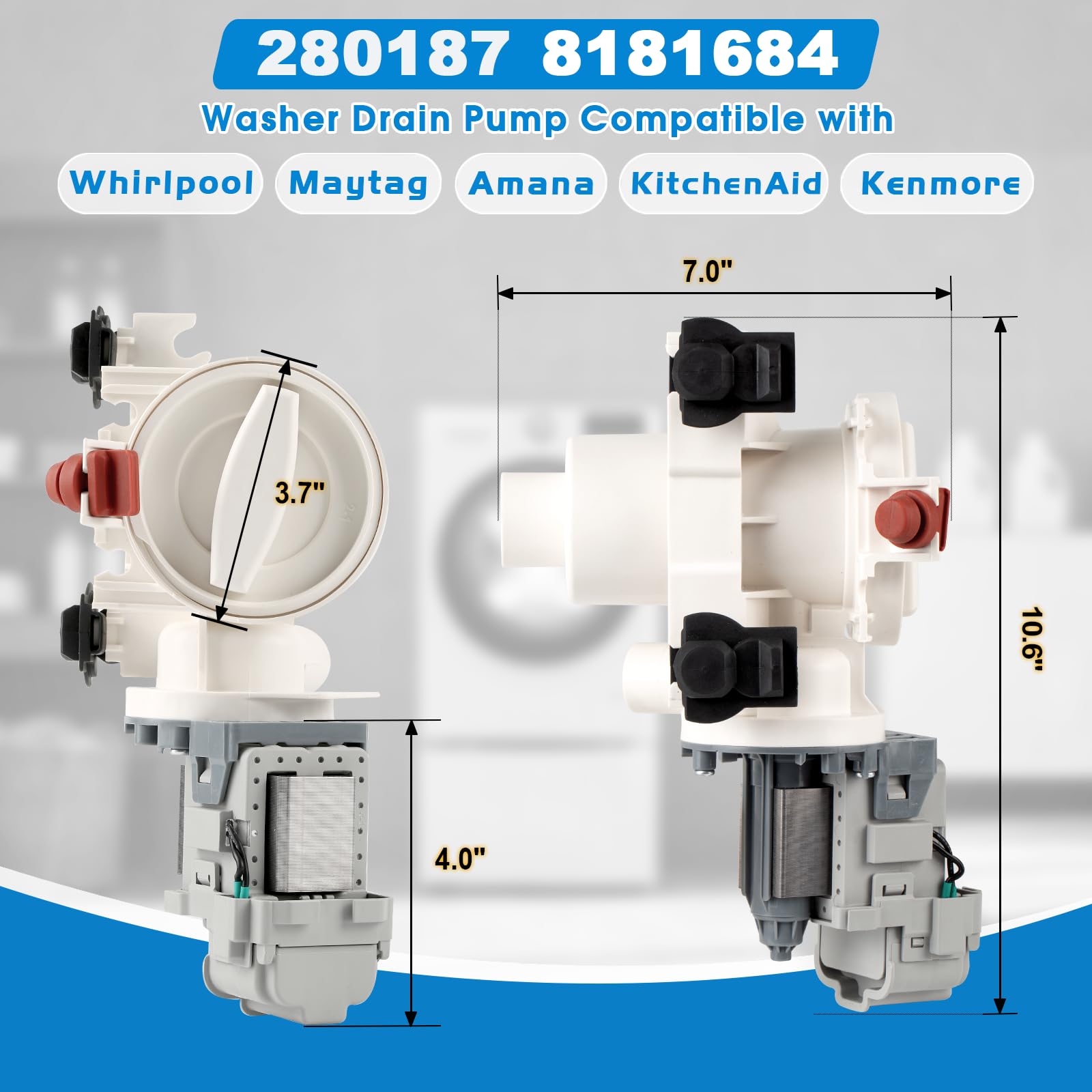 【Compatible Brands】The 280187 8181684 Washer Drain Pump Filter is compatible with Whirlpool, Maytag, Amana,KitchenAid, Kenmore washer. Unsure if it's compatible with your washer? Feel free to email us your washer model