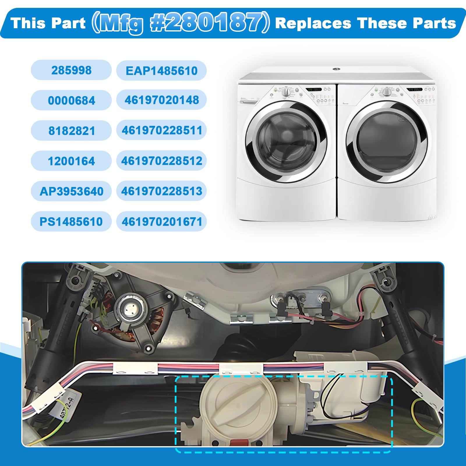 【Replaceable Models】The 280187 8181684 Washer Drain Pump Filter replaces the following parts: 285998, 8181684, 8182819, 8182821, 46197020148, 461970201671, 461970228511, 461970228512, 461970228513, 1200164, AP3953640, PS1485610, EAP1485610