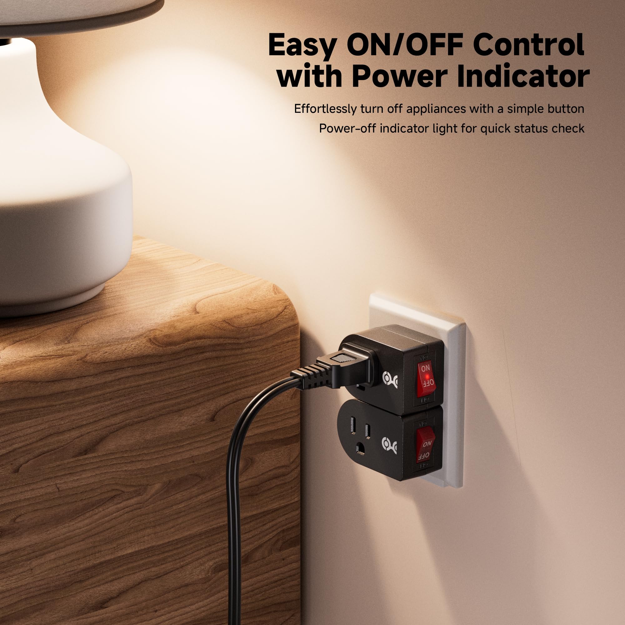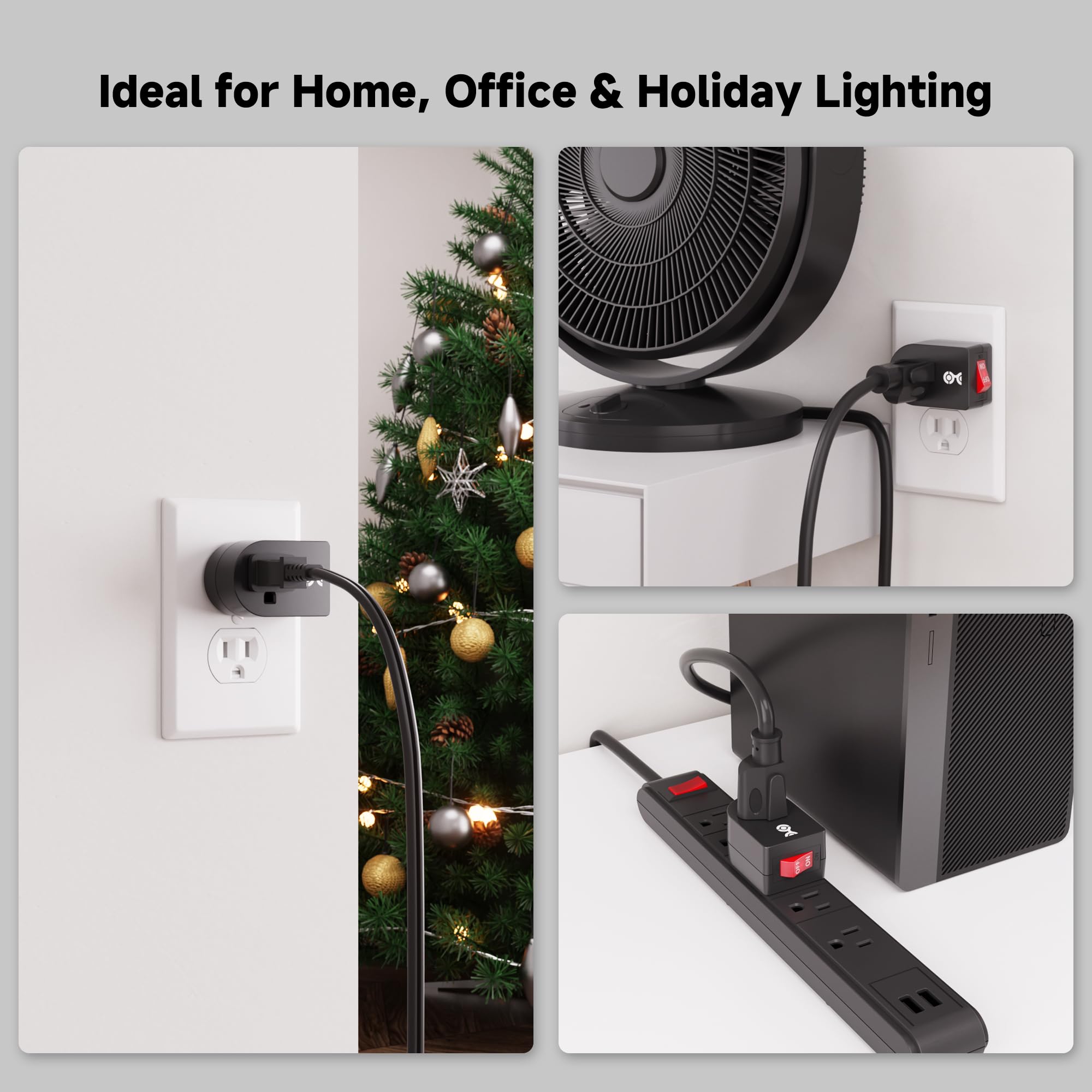 Universal Compatibility: Designed for both 3-prong grounded and 2-prong polarized cords. Plug in special occasion lights, holiday decorations, or any small appliances and control them easily with the ON/OFF switch. Works with 120V outlets and compatible with grounded outlet adapters for added versatility.