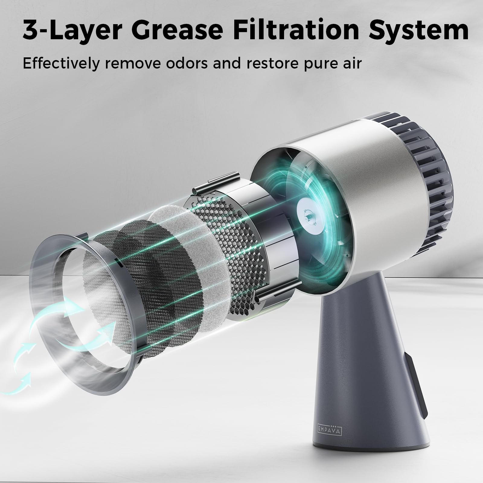 Effective Filtration: Multi-layer filters (metal filter and oil-absorbing cotton) absorb smoke and odors, grease filter cup is detachable and washable.