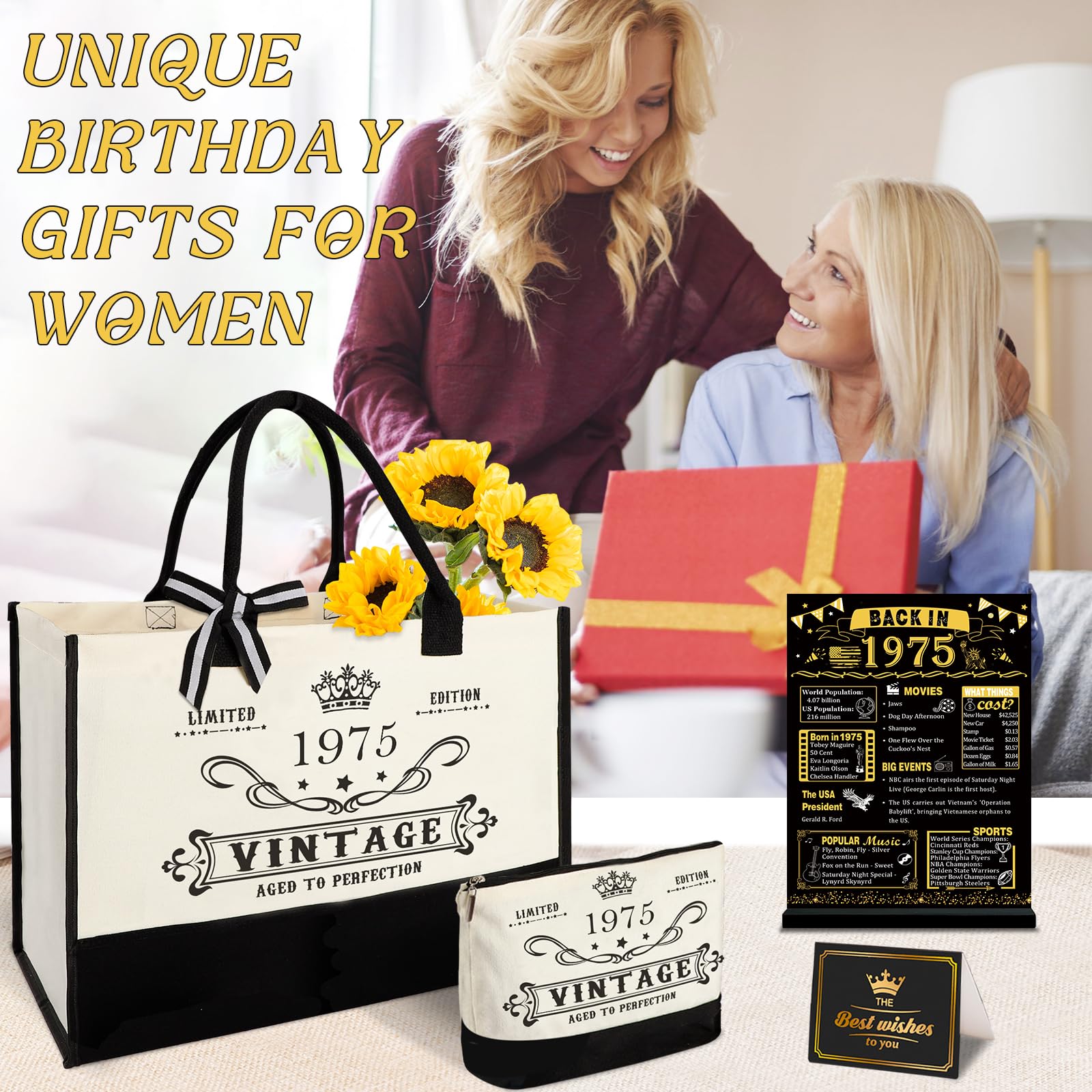 Great Gift for Her 50th Birthday: This gifts set for 50th birthday women contains: 1 X 1975 beach bag, 1 X makeup bag, 1 X back in 1975 poster, 1 X greeting card. Unique canvas tote bag gifts set will be a adorable gift for women's 50th birthday. This birthday 50 gifts themed idea makes the perfect choice for putting a smile on her face on their special day.
