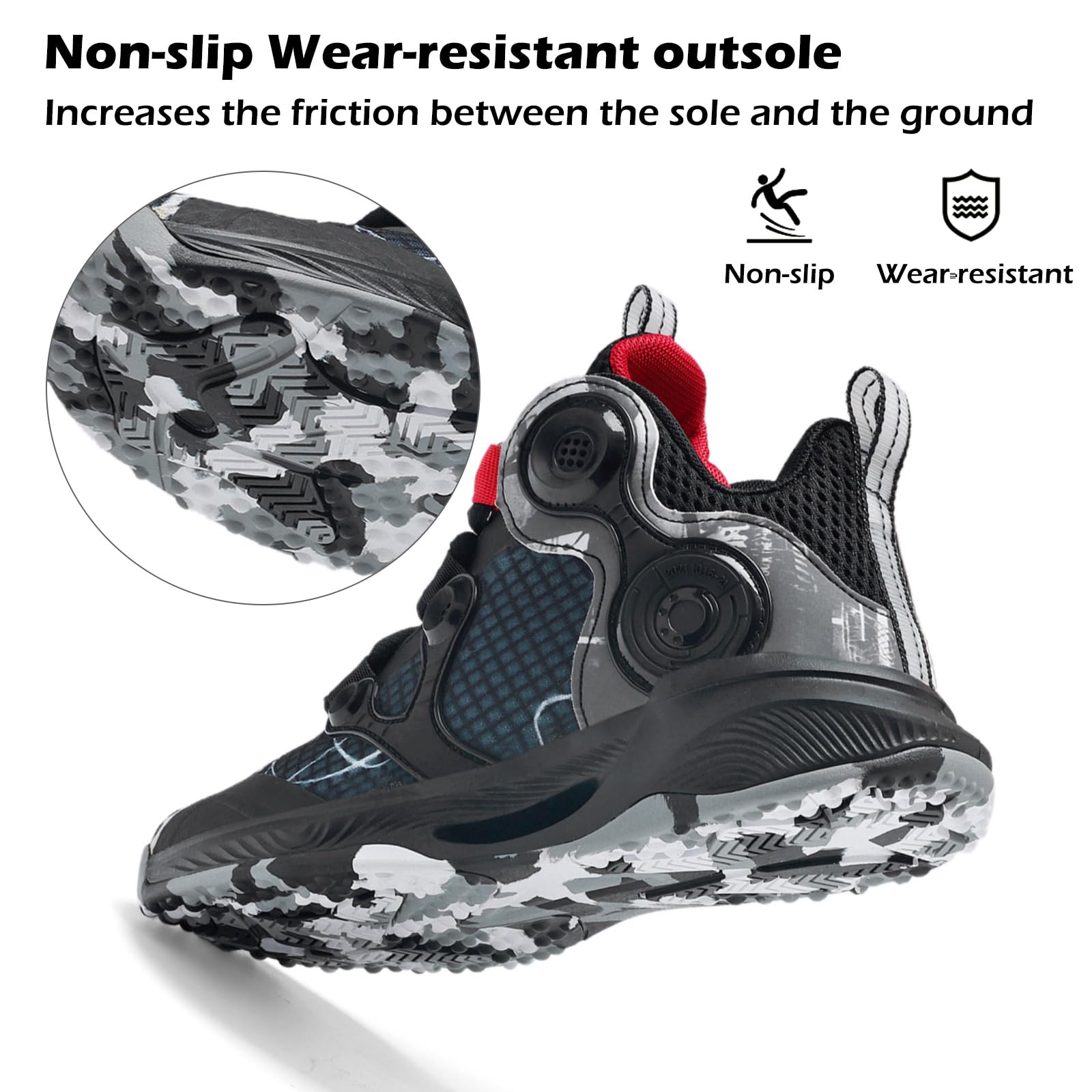 The boys basketball shoes has the outsole made of excellent phylon +TPR bottom, it maks this shoes light weight, cushion, slip resistan and wear resistance.