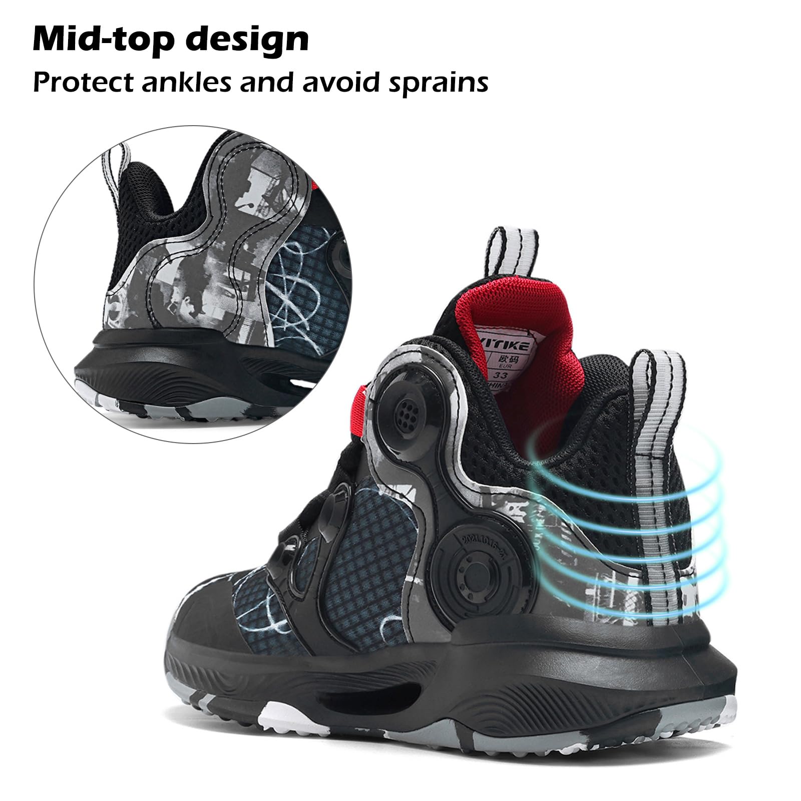 Kids basketball shoes with unique air cushion design which provides cushionin, with TPR bottom which increases the friction between the sole and the ground. They protect children's ankles & knees effectively, and prevents injuries when they have sports activites.