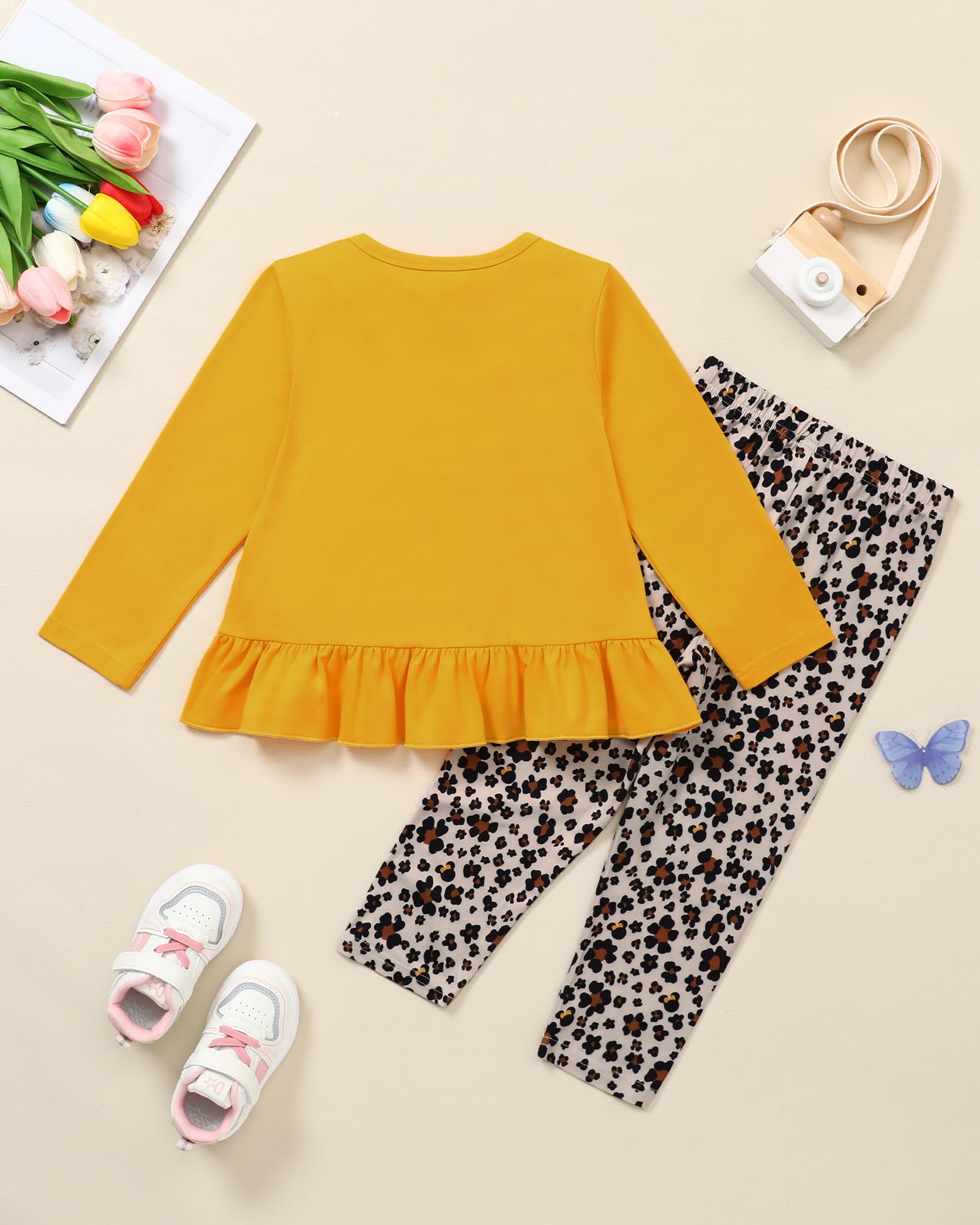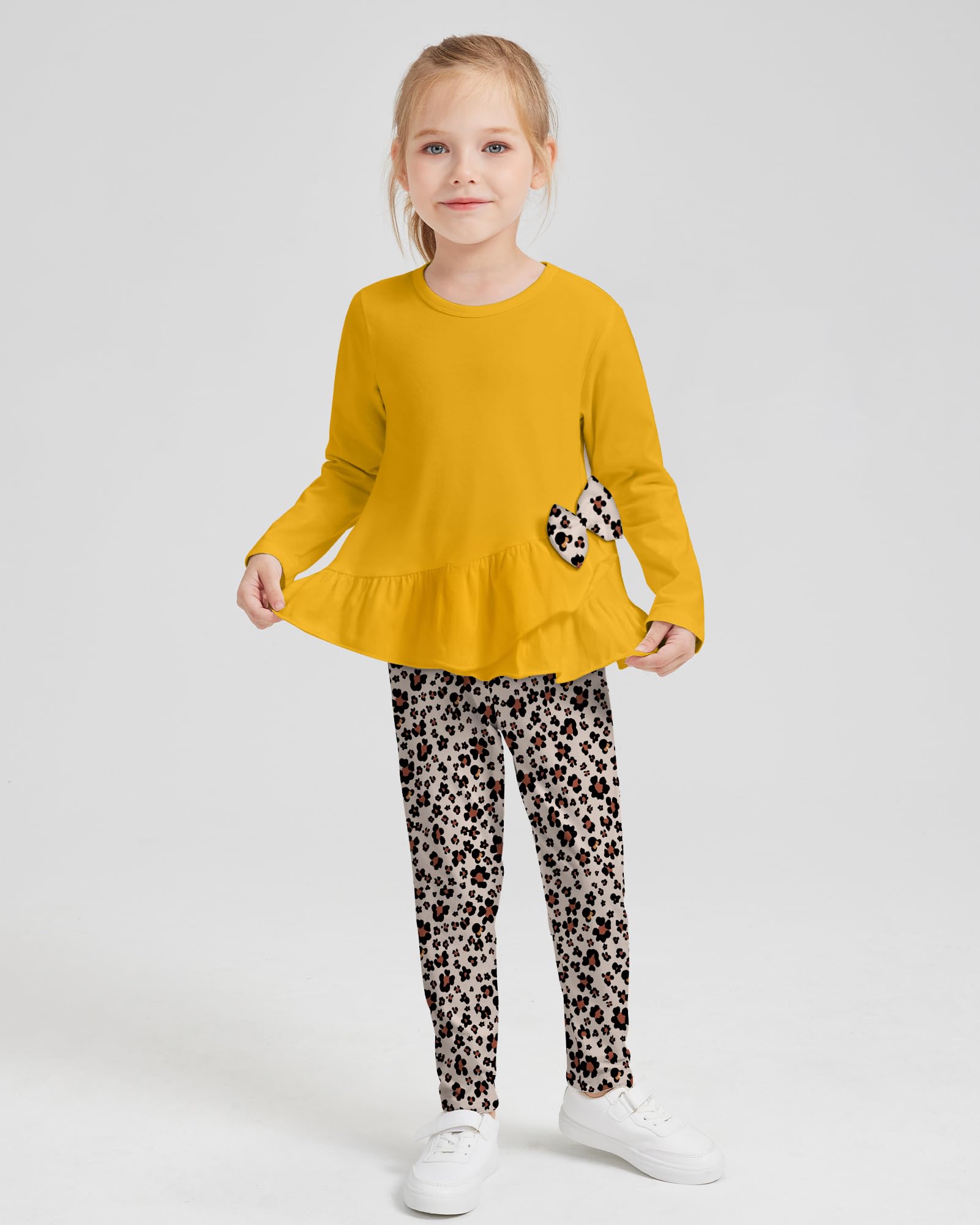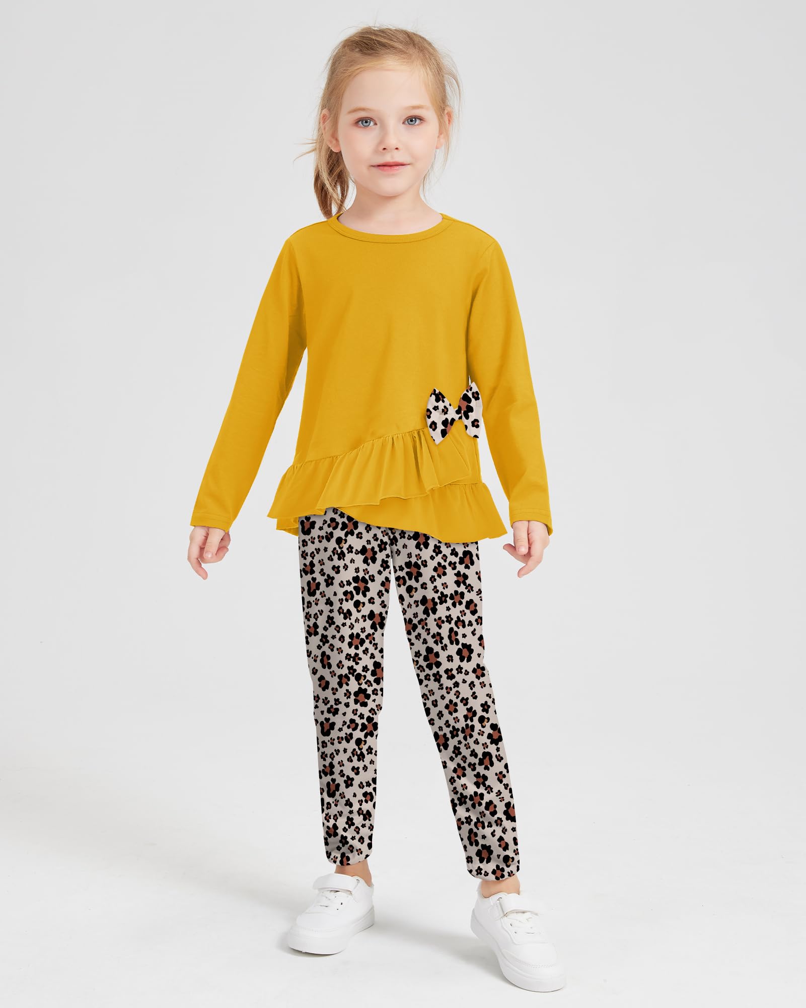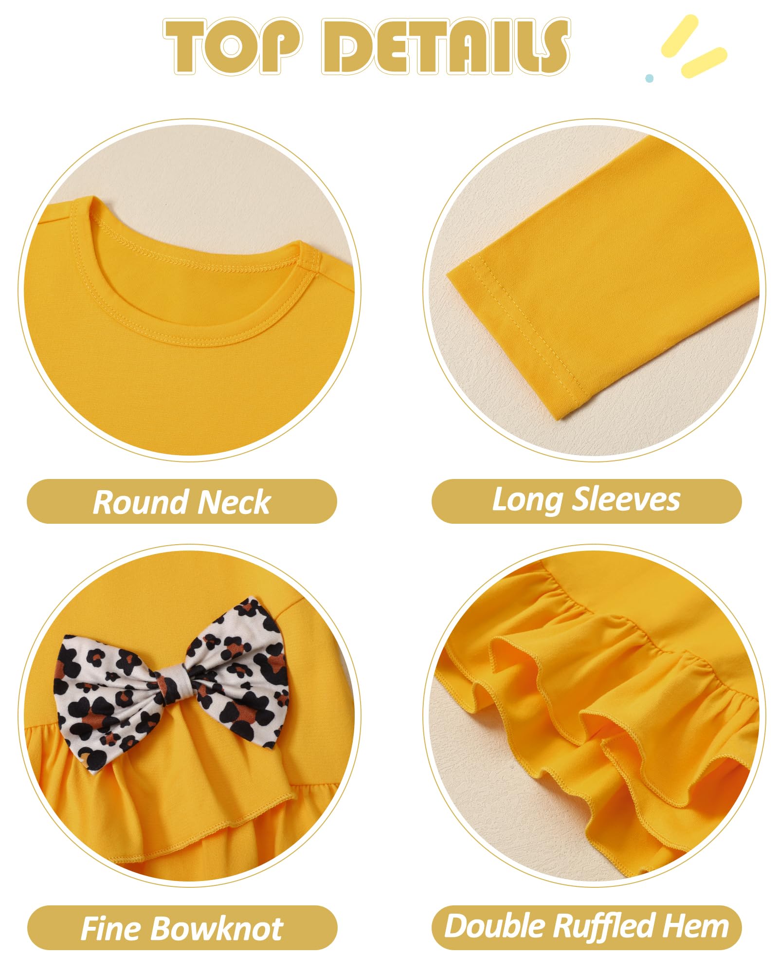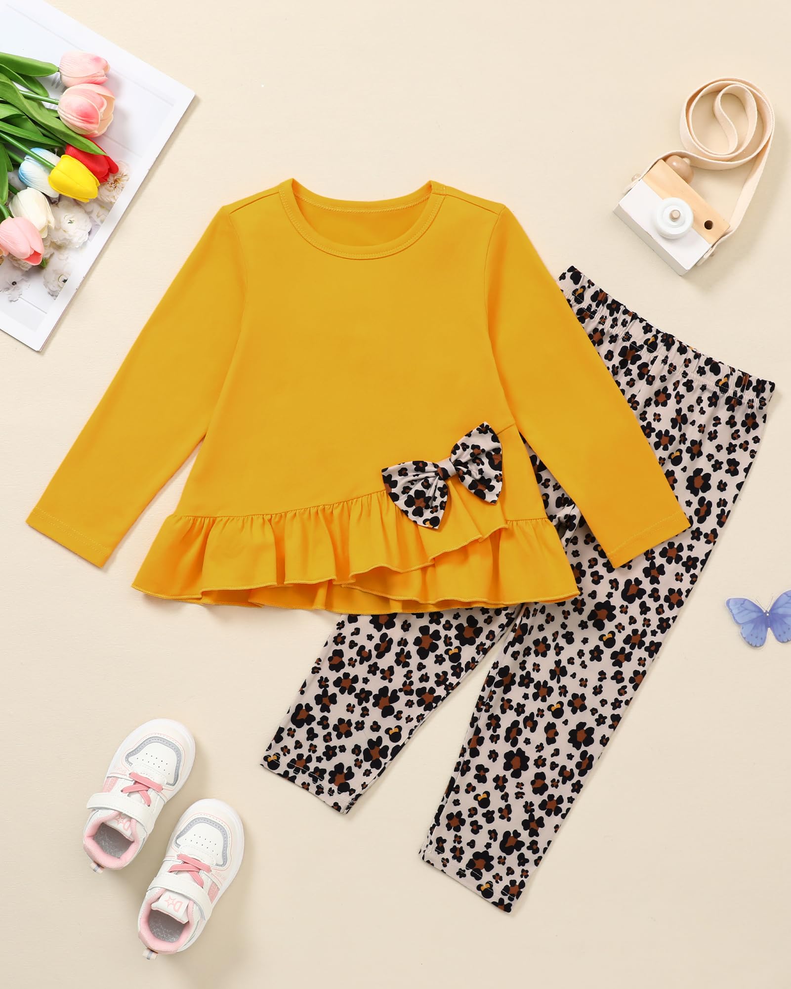 Design: The toddler girl outfit features a long-sleeve top, charming ruffled hem and delicate bow detail, paired with matching floral-print pants. This girls clothes set creates a cute, coordinated look that’s both trendy and timeless