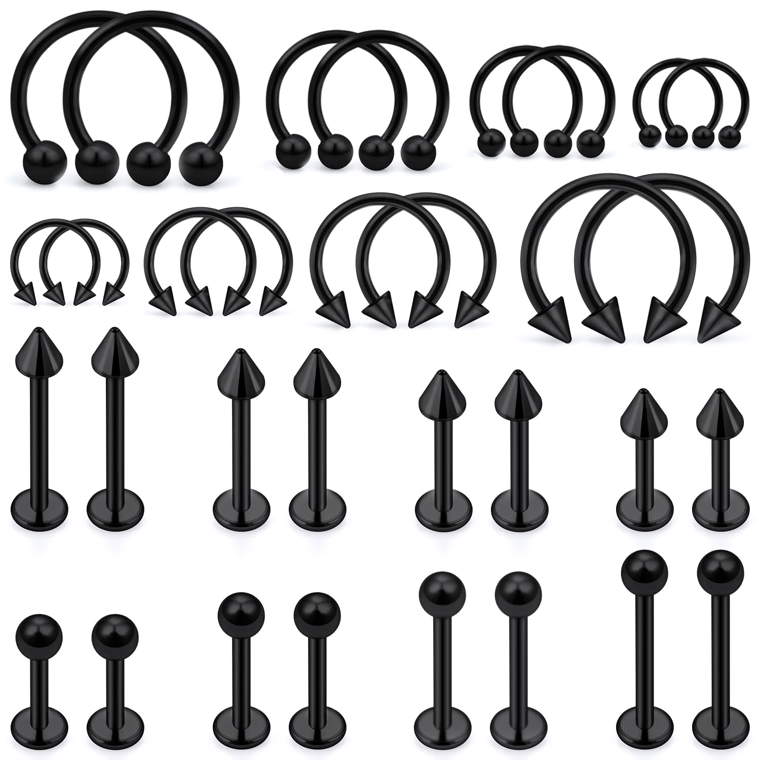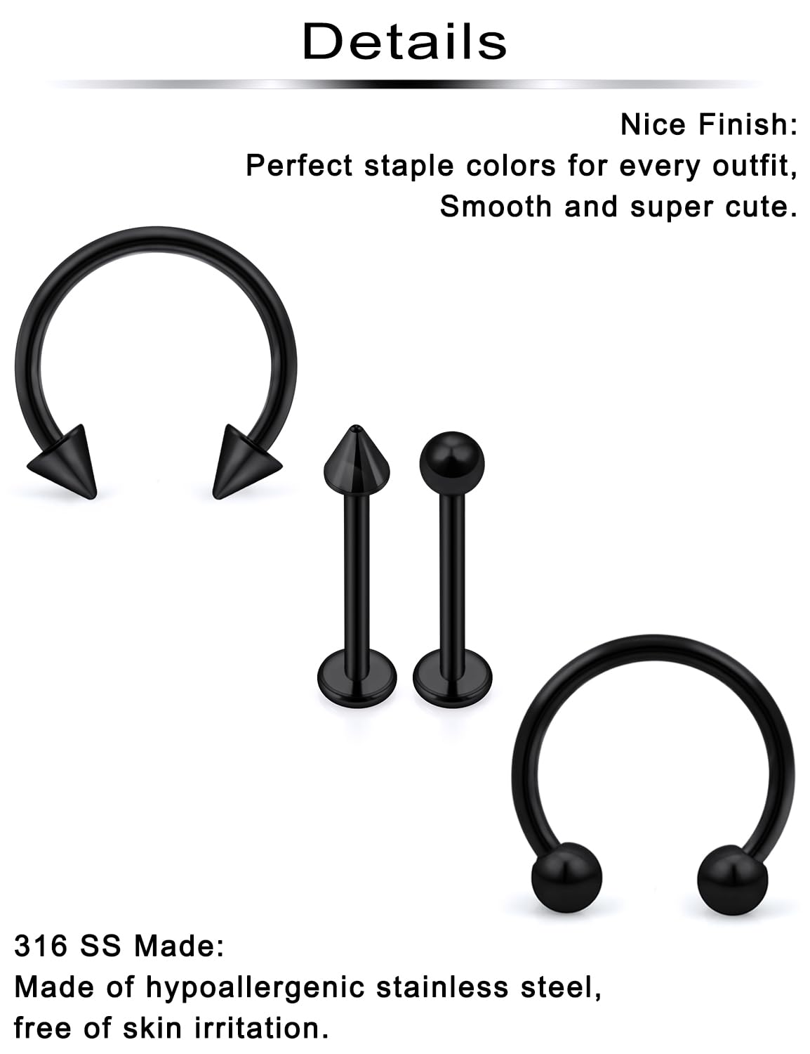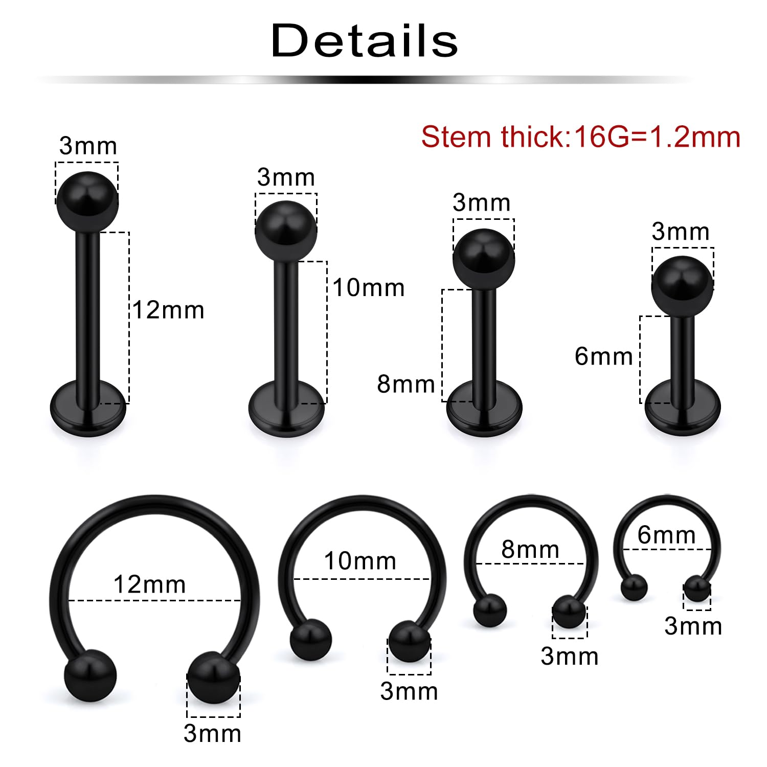 Thickness: 16G (1.2mm); Ball Size: 3mm; Spike Size: 3mm; Wearable Bar Length of Labret Studs: 6mm, 8mm, 10mm, 12mm; Inner Diameter of Horseshoe Rings: 6mm, 8mm, 10mm, 12mm; Color: Black.