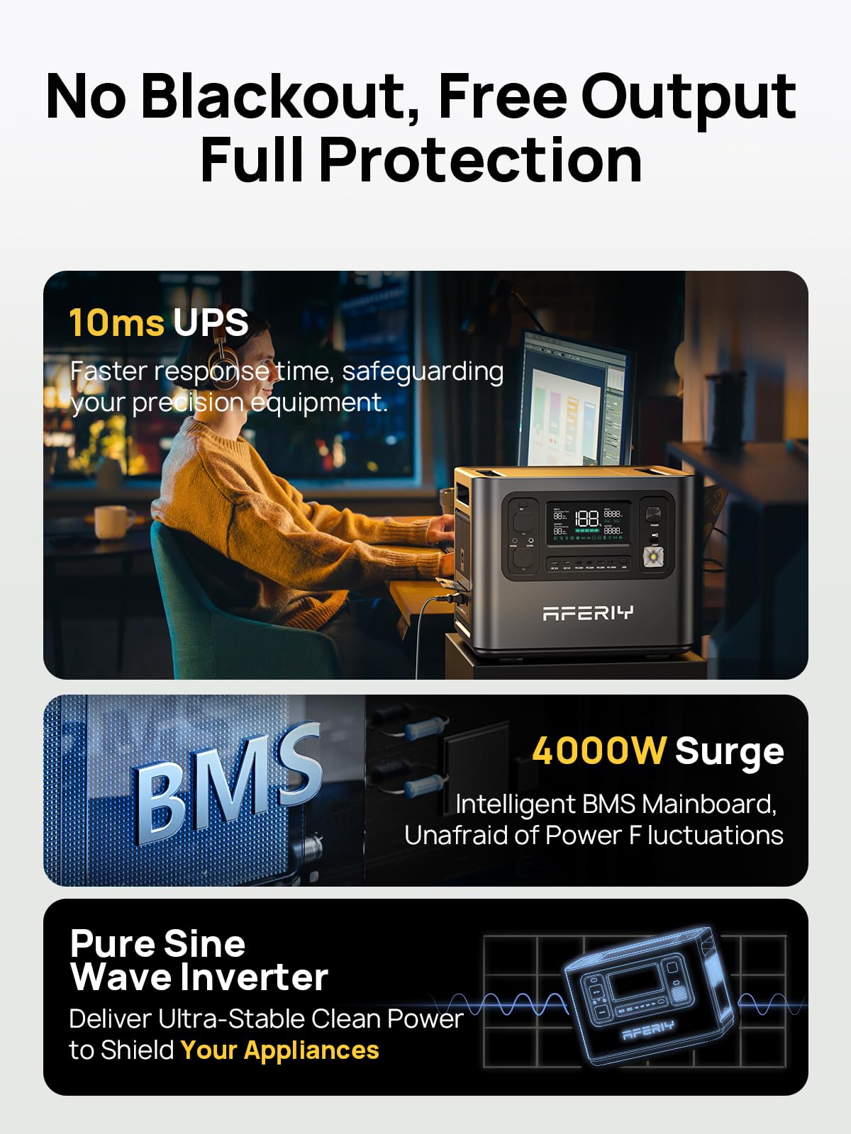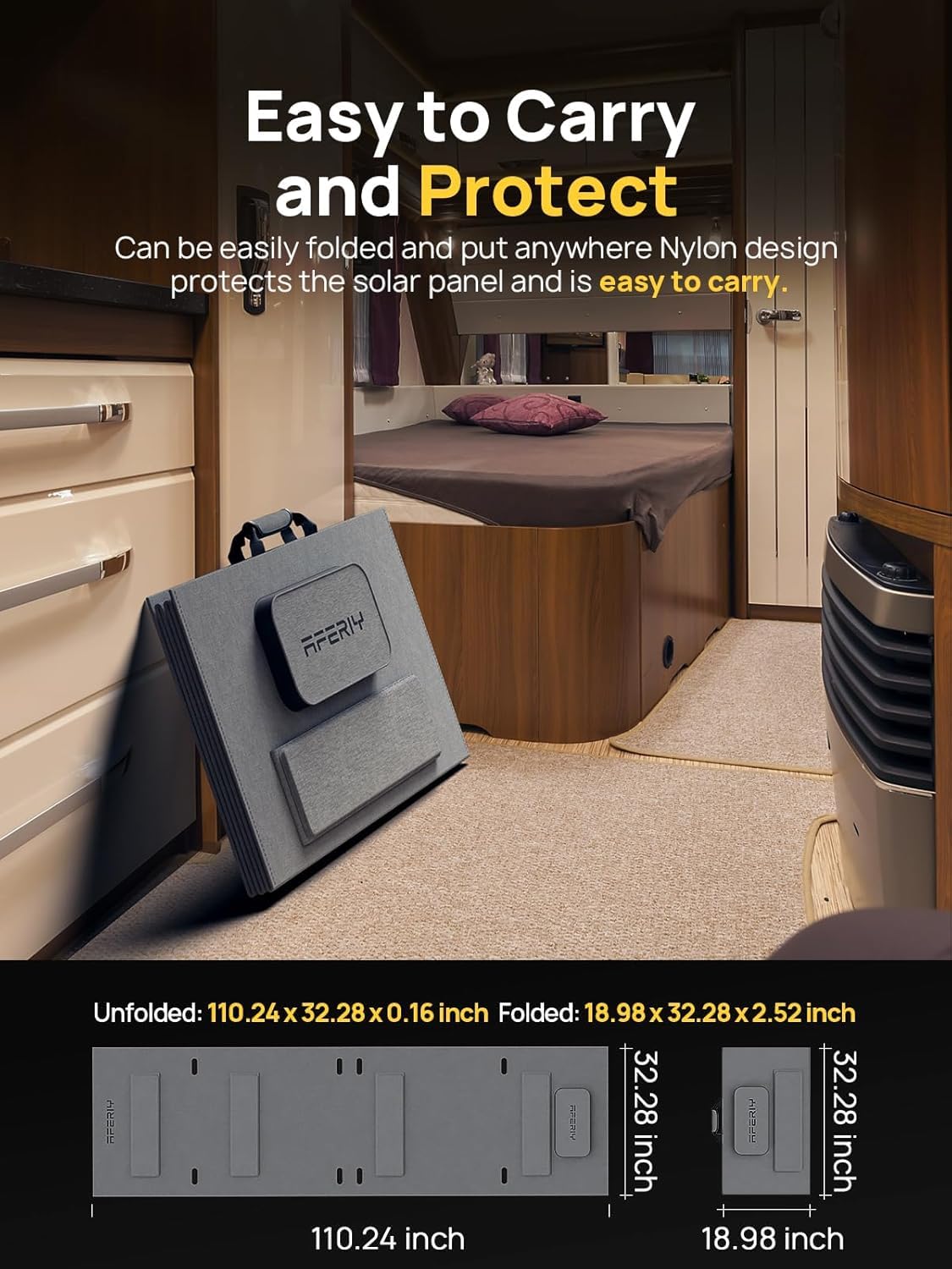【AFERIY 400W Solar Panel】With 26.4V max output voltage, 15A max current, and 400W max power, it can fully charge the AFERIY 2400W portable power station in 6 hrs under full load.
