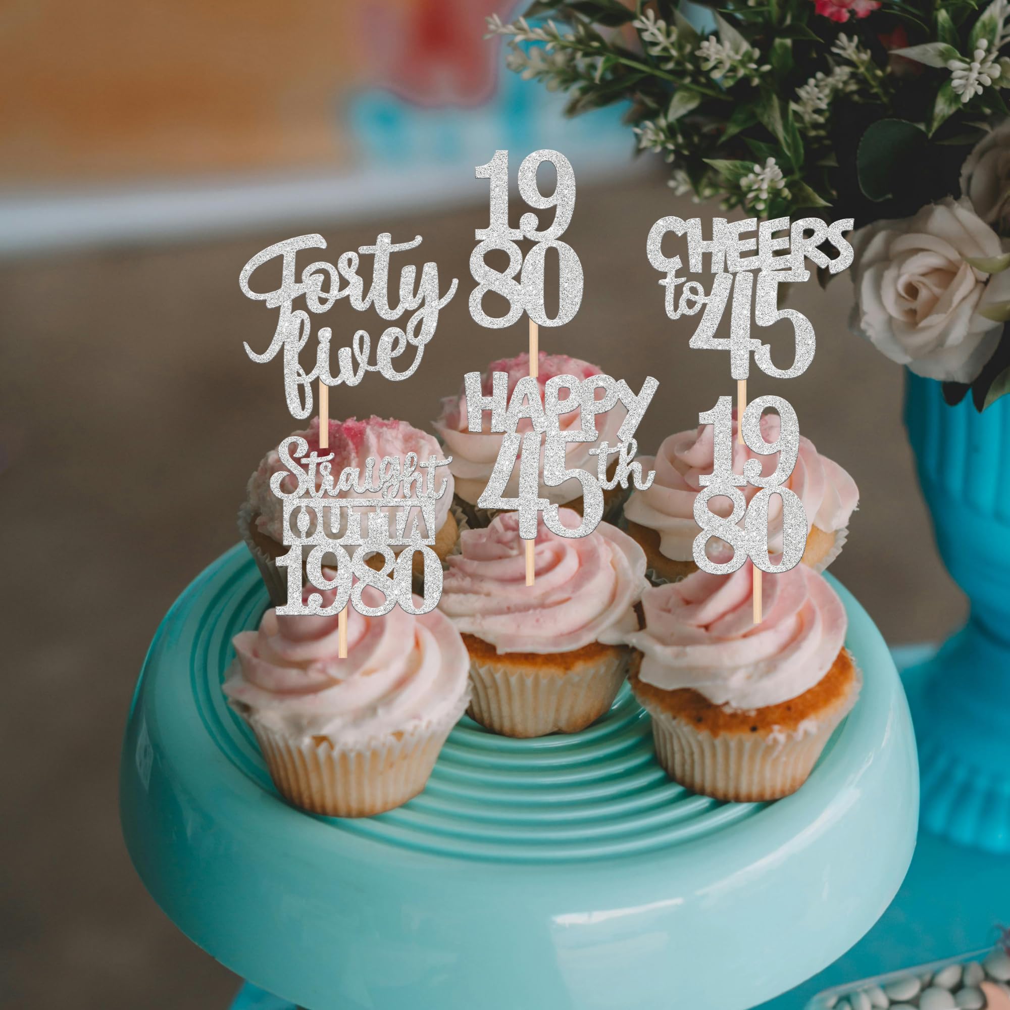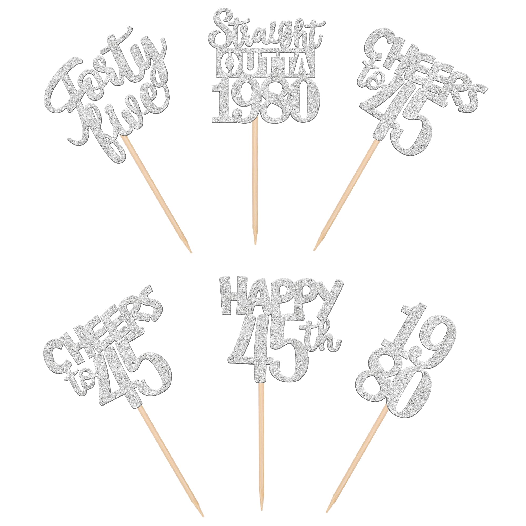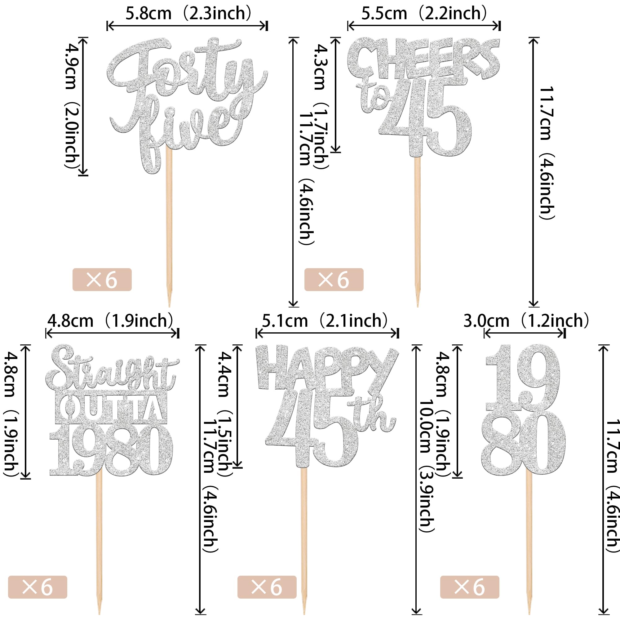 30 PCS 45th Birthday Cupcake Toppers Glitter Forty Five Happy 45th Straight Outta 1980 Cupcake Picks for Cheers to 45 Fabulous 45th Birthday Anniversary Party Cake Decorations Supplier Silver Perfect for happy 45th bithday theme party, straight outta 1980 theme party, 45th wedding anniversary theme party,cheers to 45 years theme party cupcake decorations supplies. Pack of 30 pcs, 6 pcs of each design. The size is 2.3*4.6/ 2.2*4.6/ 1.9*4.6/ 2.1*3.9/ 1.2*4.6 inch ( with stick ) Made of high quality paper card stock,thick and sturdy. These straight outta 1980 cupcake toppers are one side glitter, another side is white, and they are intended for decoration only, please do not put them in oven or microwave. If the item you received has any defects, please contact us immediately. we will deal with it within 24 hours.