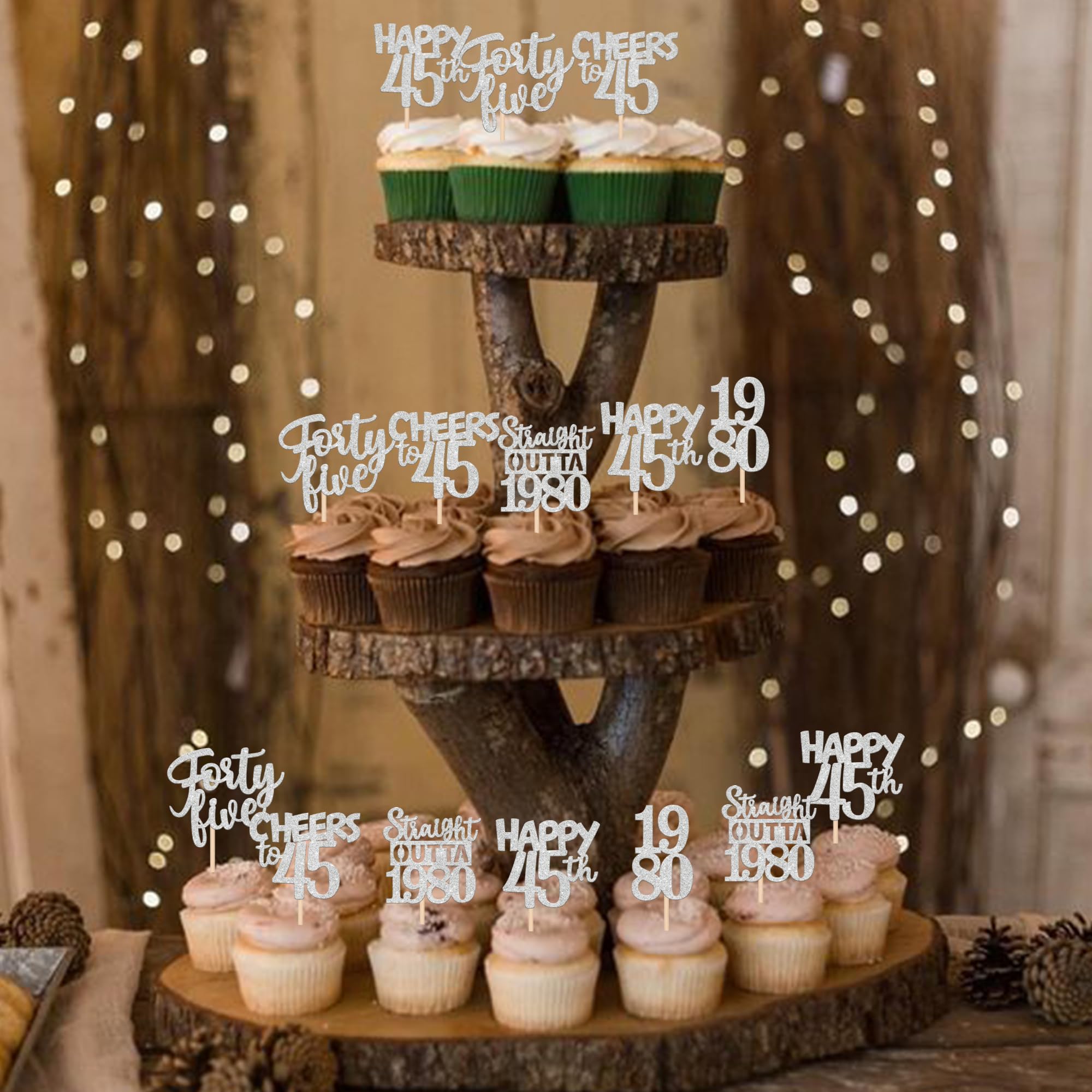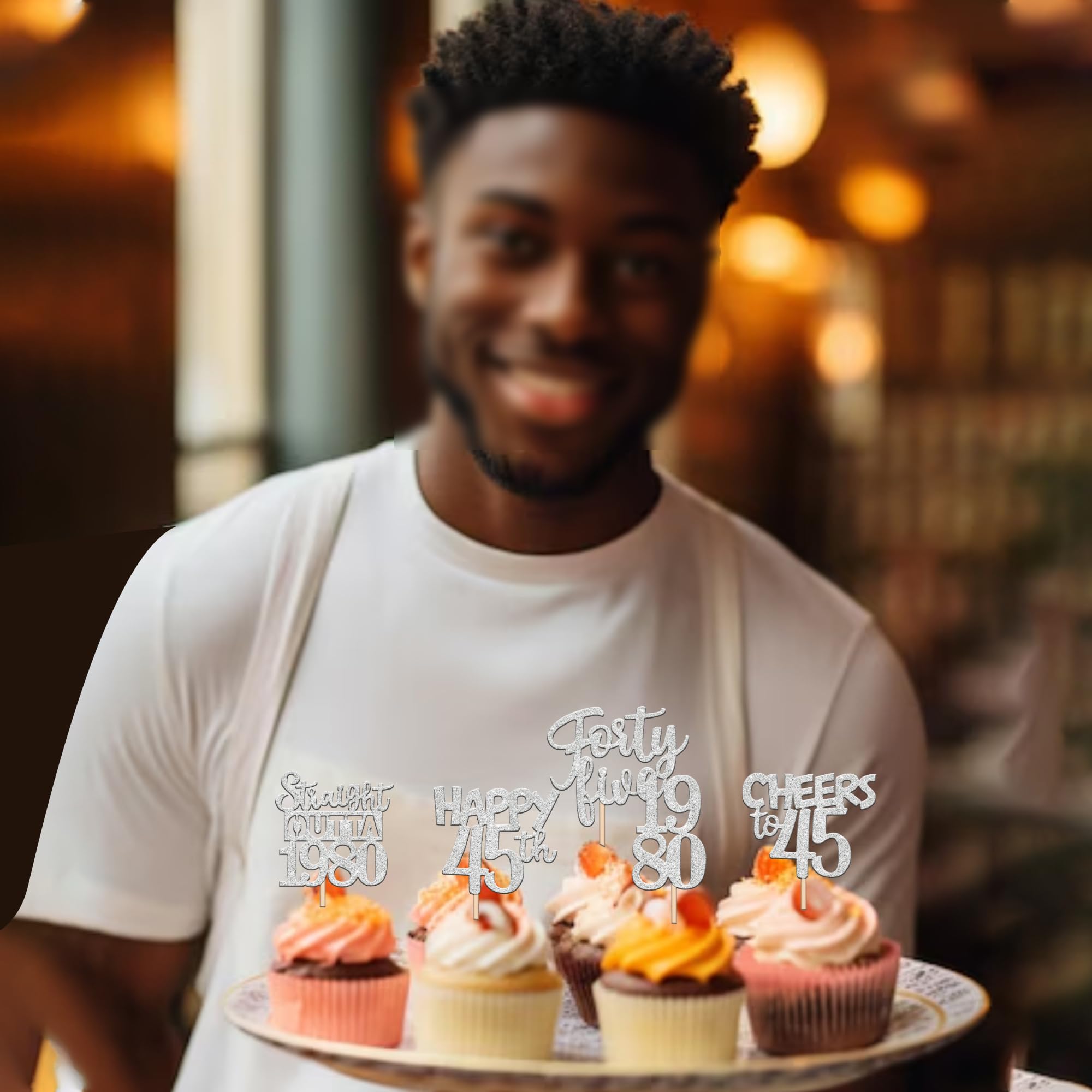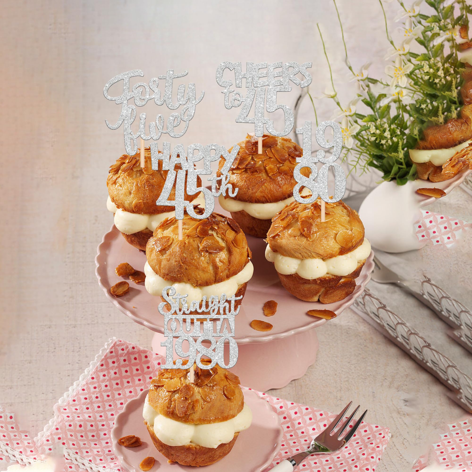 30 PCS 45th Birthday Cupcake Toppers Glitter Forty Five Happy 45th Straight Outta 1980 Cupcake Picks for Cheers to 45 Fabulous 45th Birthday Anniversary Party Cake Decorations Supplier Silver Perfect for happy 45th bithday theme party, straight outta 1980 theme party, 45th wedding anniversary theme party,cheers to 45 years theme party cupcake decorations supplies. Pack of 30 pcs, 6 pcs of each design. The size is 2.3*4.6/ 2.2*4.6/ 1.9*4.6/ 2.1*3.9/ 1.2*4.6 inch ( with stick ) Made of high quality paper card stock,thick and sturdy. These straight outta 1980 cupcake toppers are one side glitter, another side is white, and they are intended for decoration only, please do not put them in oven or microwave. If the item you received has any defects, please contact us immediately. we will deal with it within 24 hours.