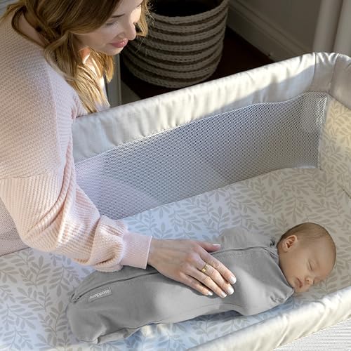 This swaddle is part of Stage 1 in the SwaddleMe Stages of Sleep, made for newborns who aren't rolling over yet and like to be swaddled with their arms in