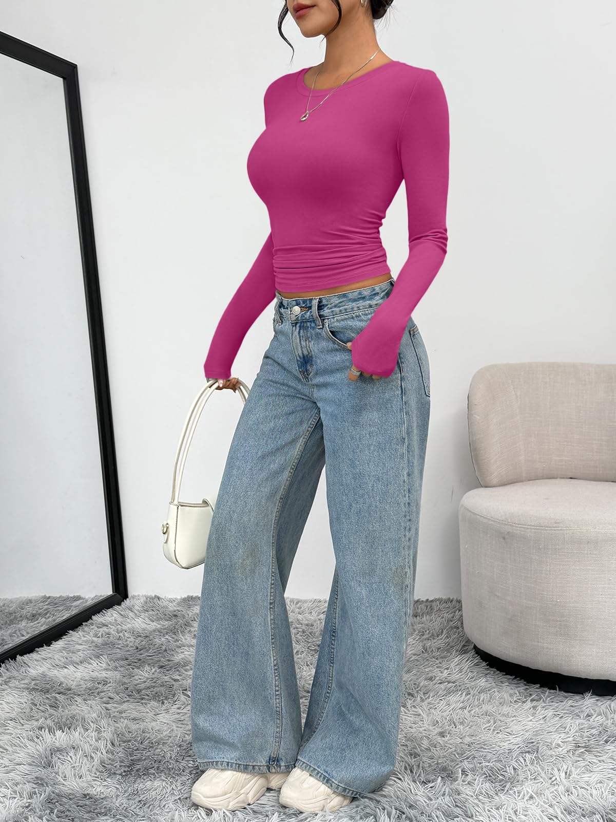 Stretch Design - Cropped and stretch fitted style,crew neck, tight underscrubs layer,you can wear it regularly or fold it up like a crop top,cute,slim fit,casual y2k style fashion 2025