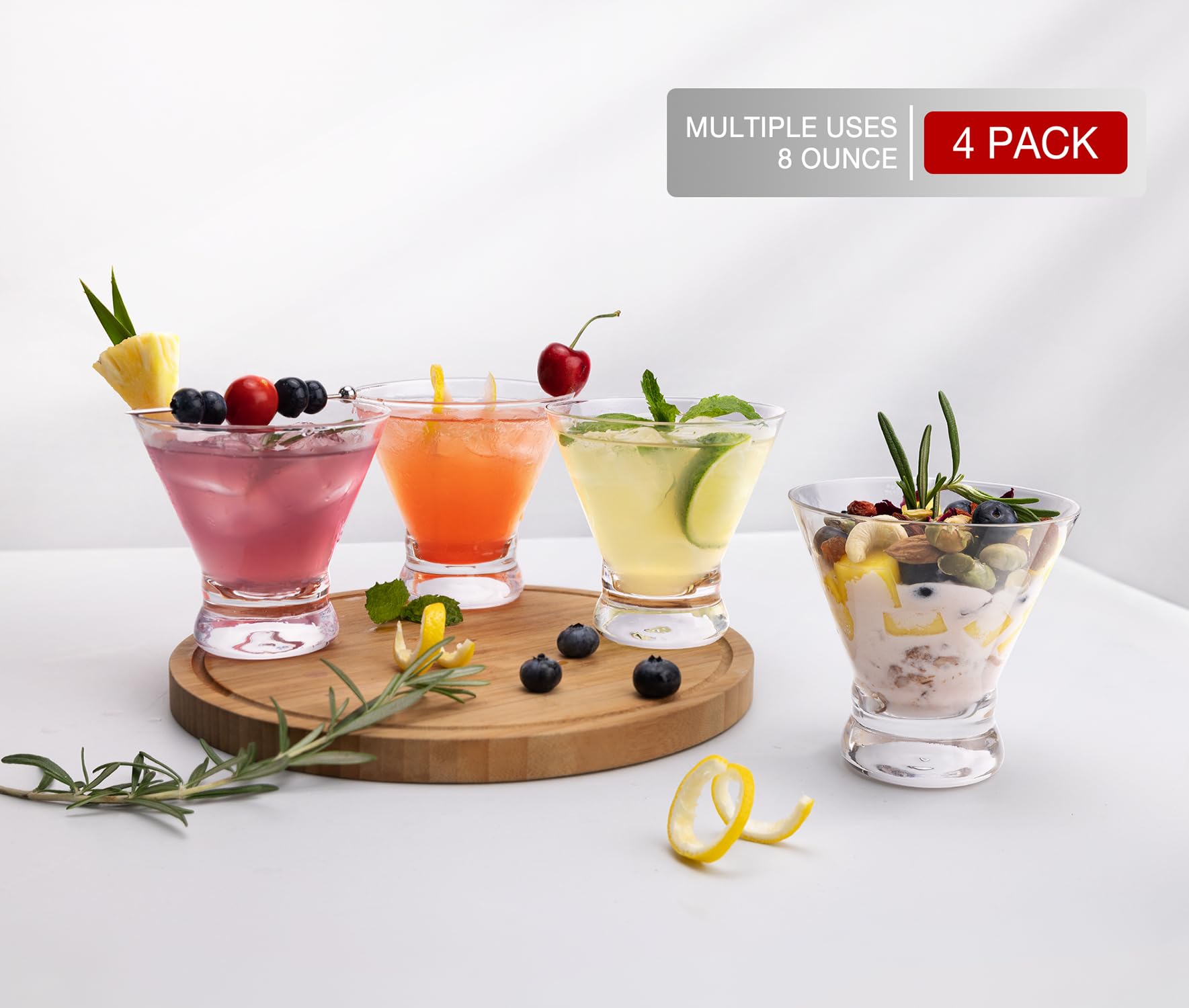 Enjoy Your Favorite Drinks: 8-ounce stemless wine glasses are especially designed for classic martini, mixed cocktail, cosmopolitan, manhattan, but great for juice, other alcohol drinks, even creative appetizers and desserts. Enjoy your favorite drinks and life’s most leisure times