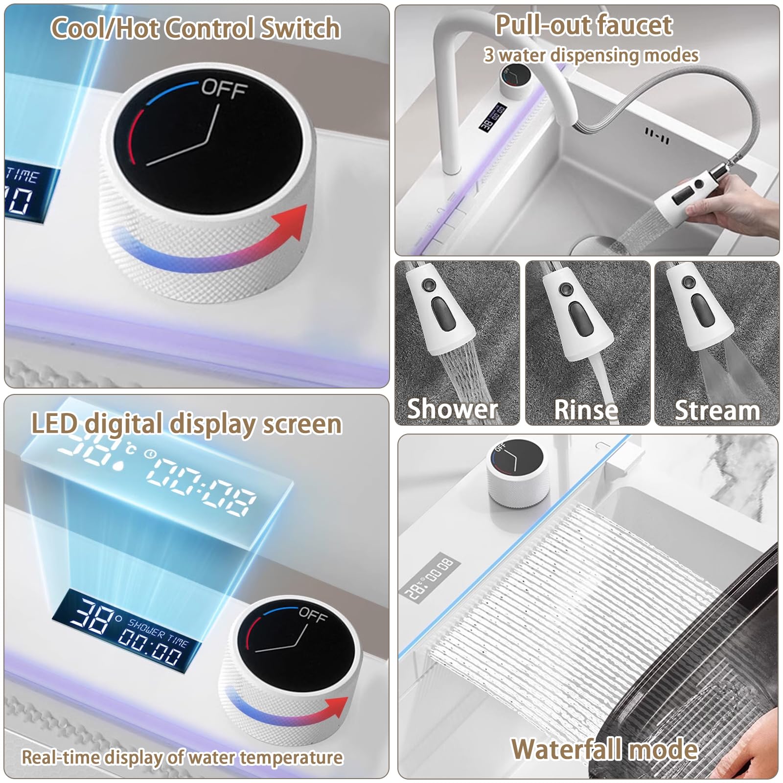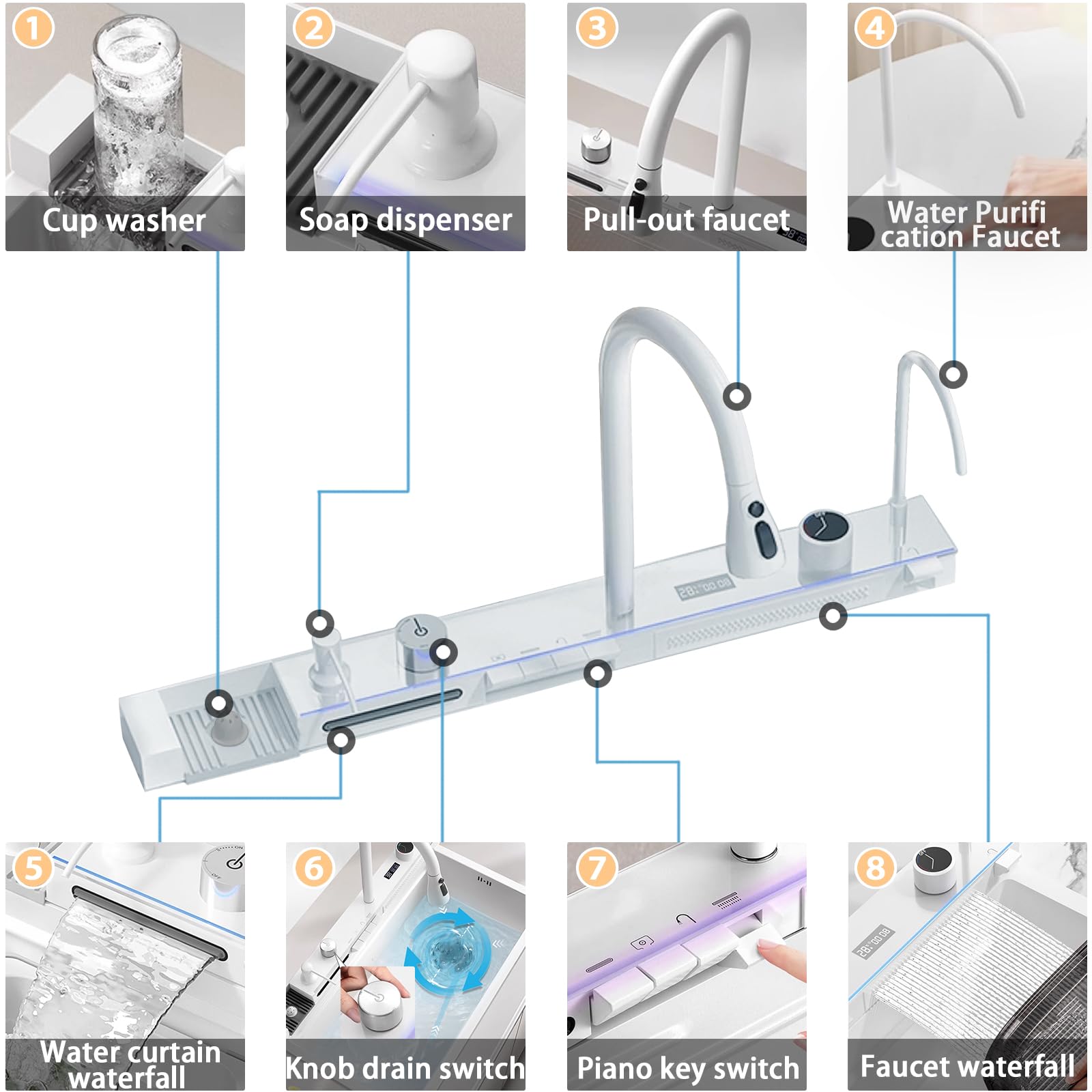 【State-of-the-art integrated technology】Experience the faucet of the future with cup washer, curtain waterfall, soap dispenser, table control, pull-out faucet and digital waterfall. Perfect combination of functionality and aesthetics.