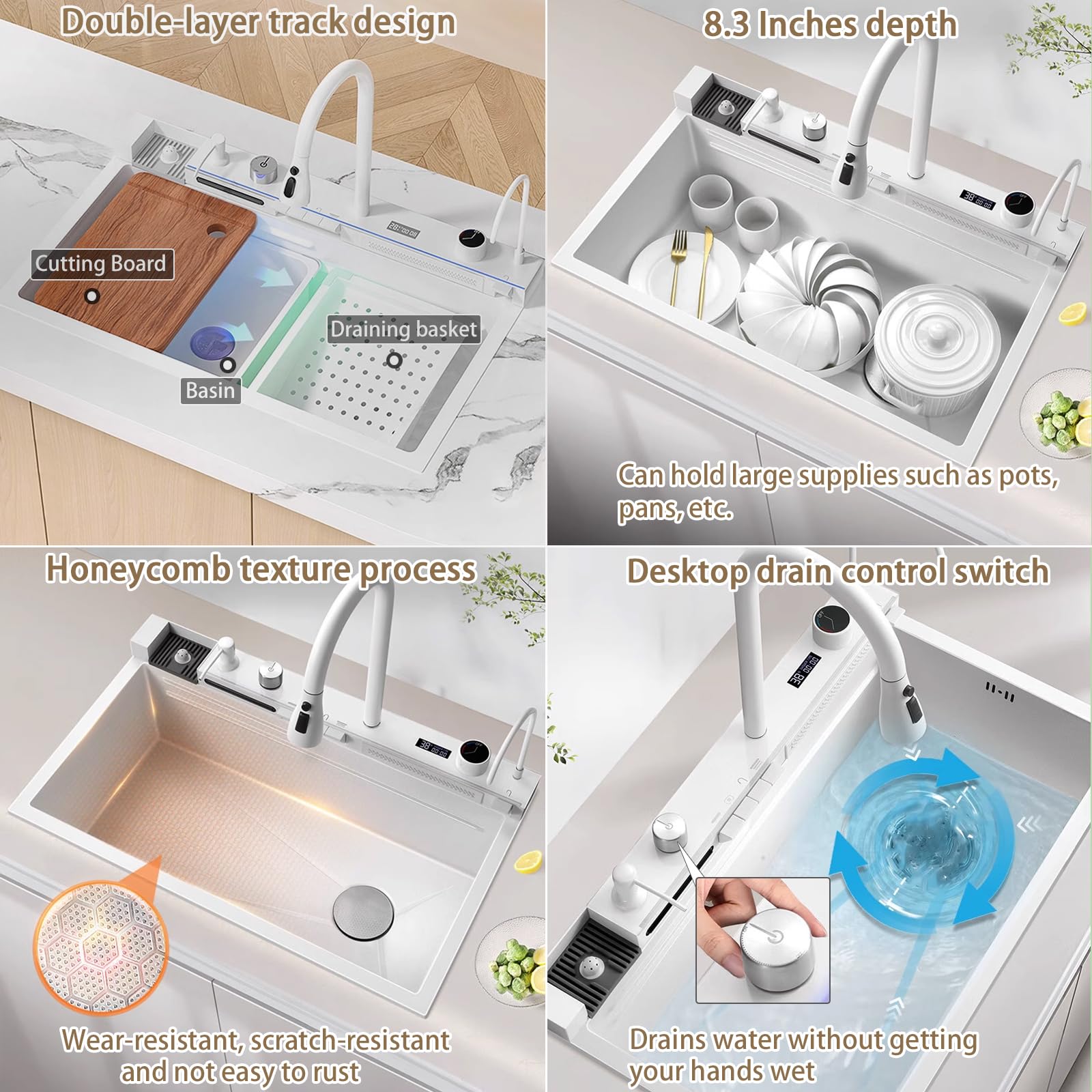 【Multi-functional Kitchen Organization】Designed with a dual-track system that allows movement left and right. Equipped with a movable nano basin, triangular drainage basket, and detachable cutting board. By flexibly moving these accessories, zone-based operation can be easily achieved. Capable of handling various tasks with flexibility, such as cutting, thawing, washing, and more.